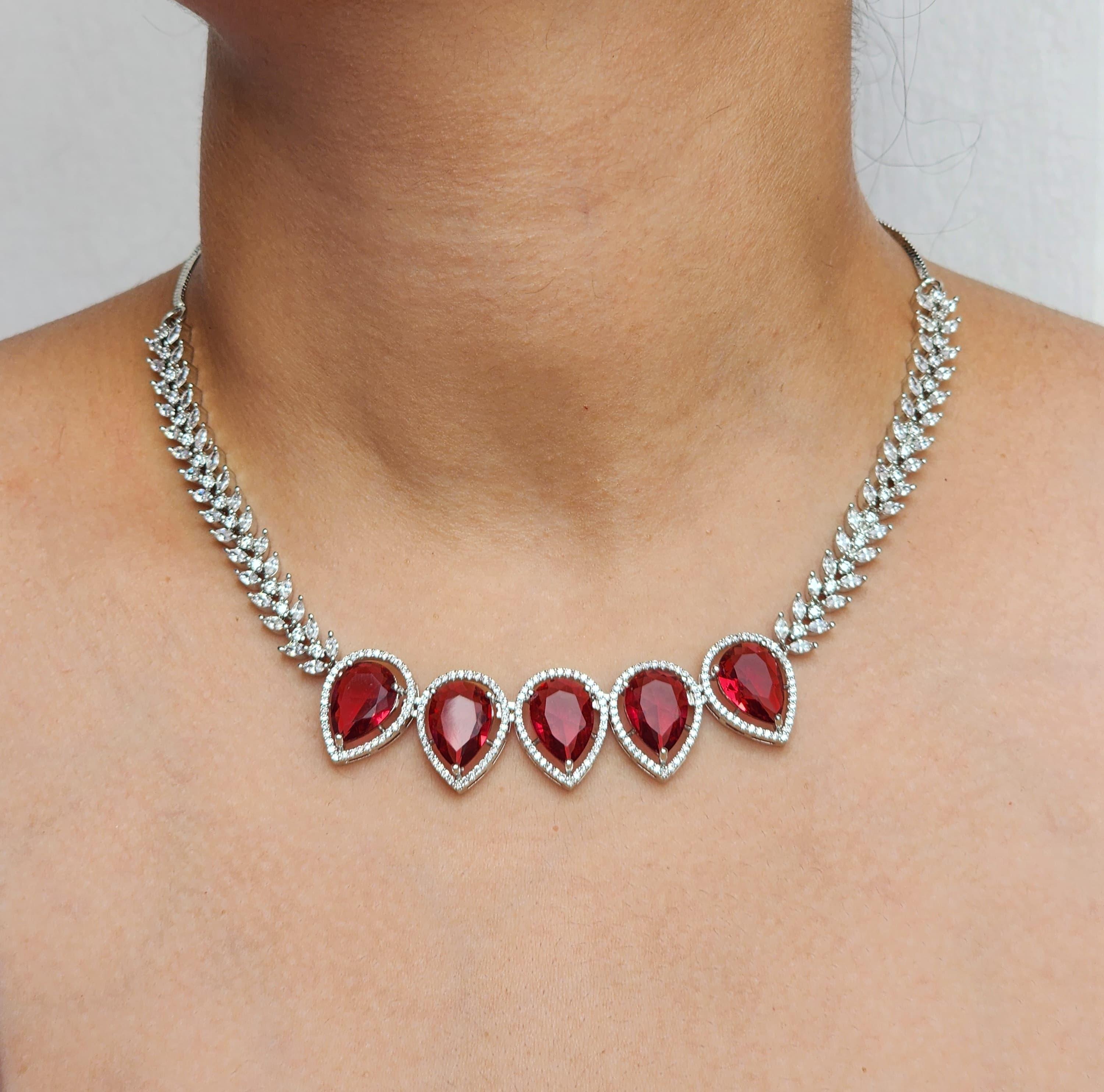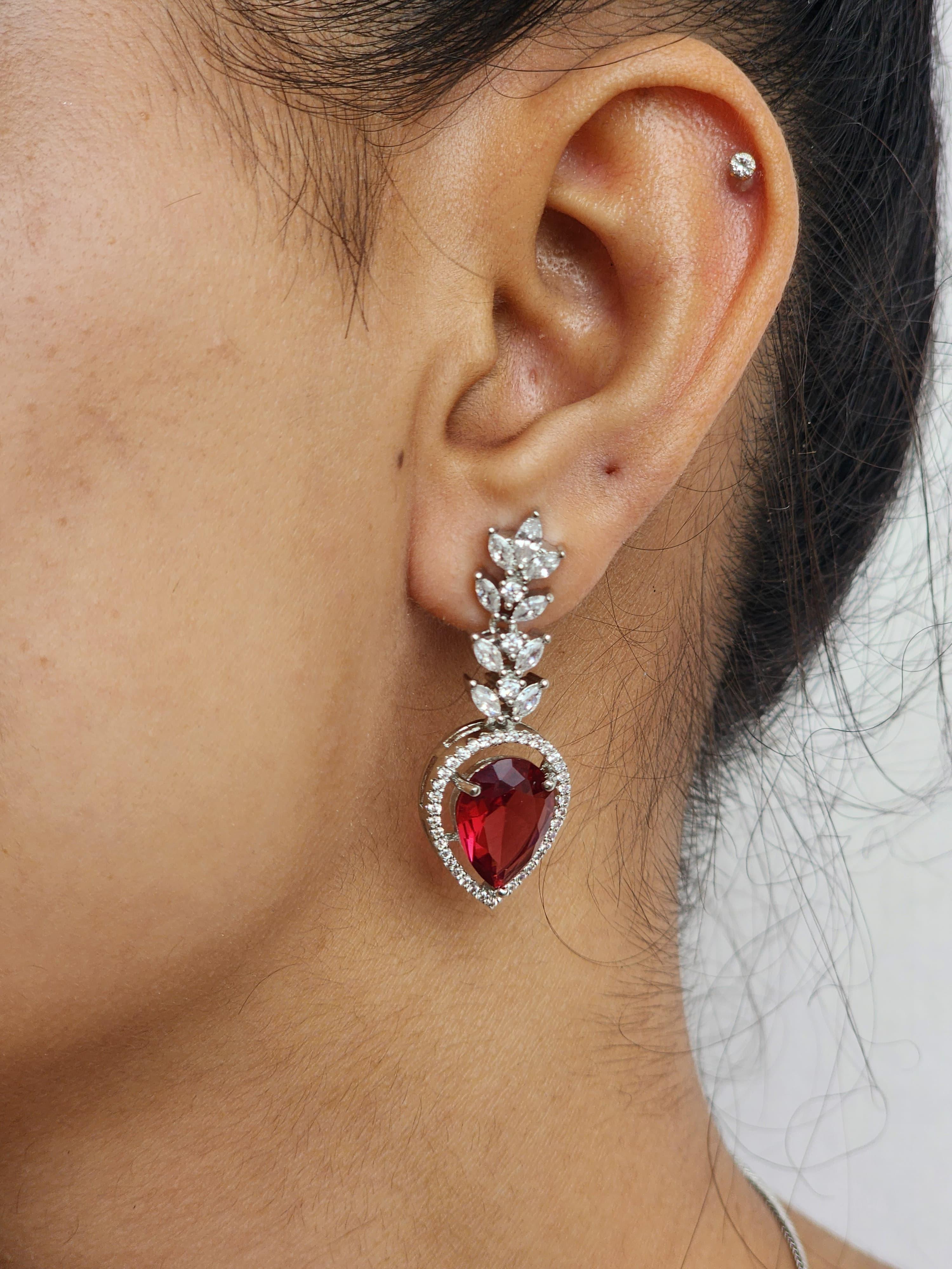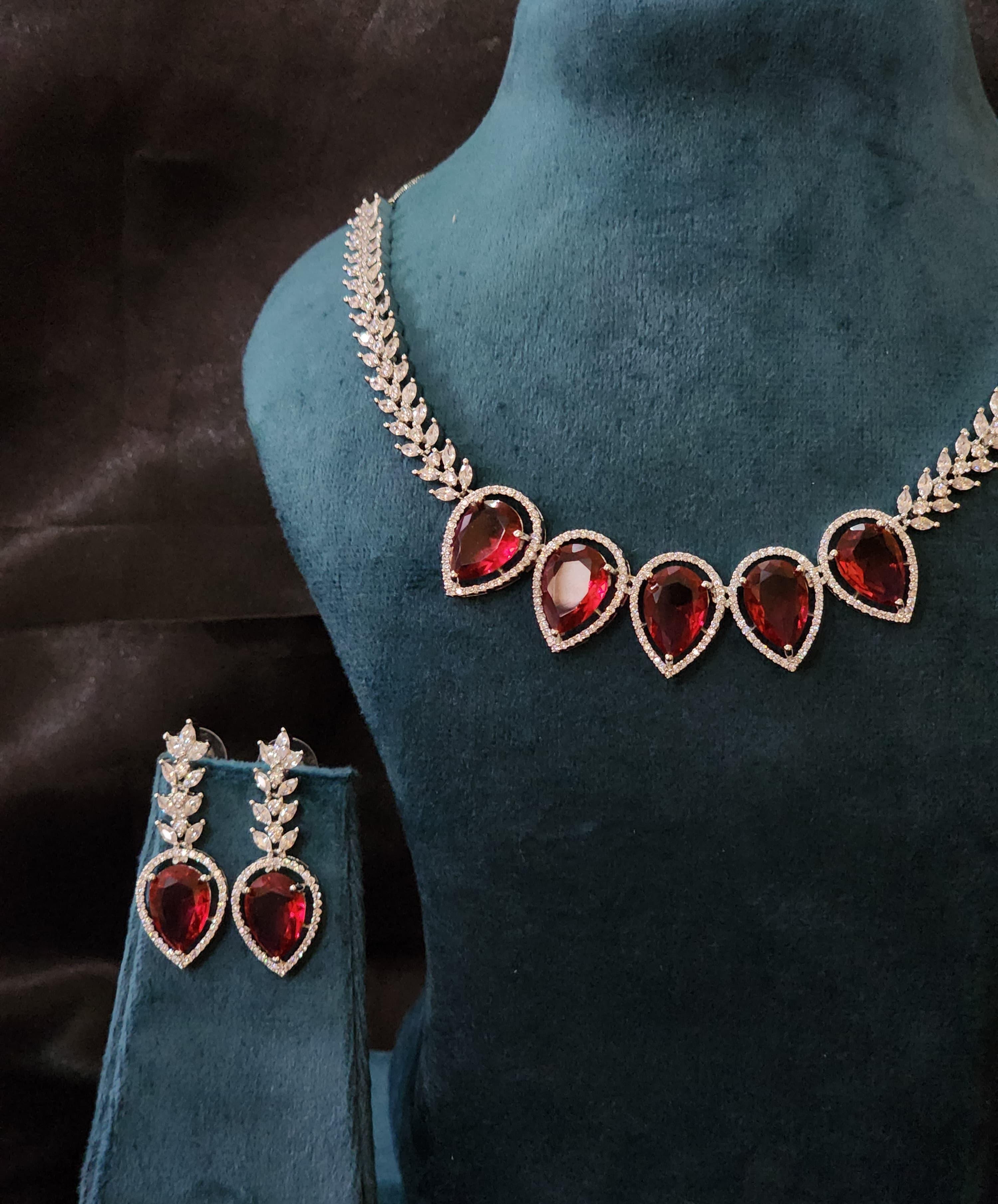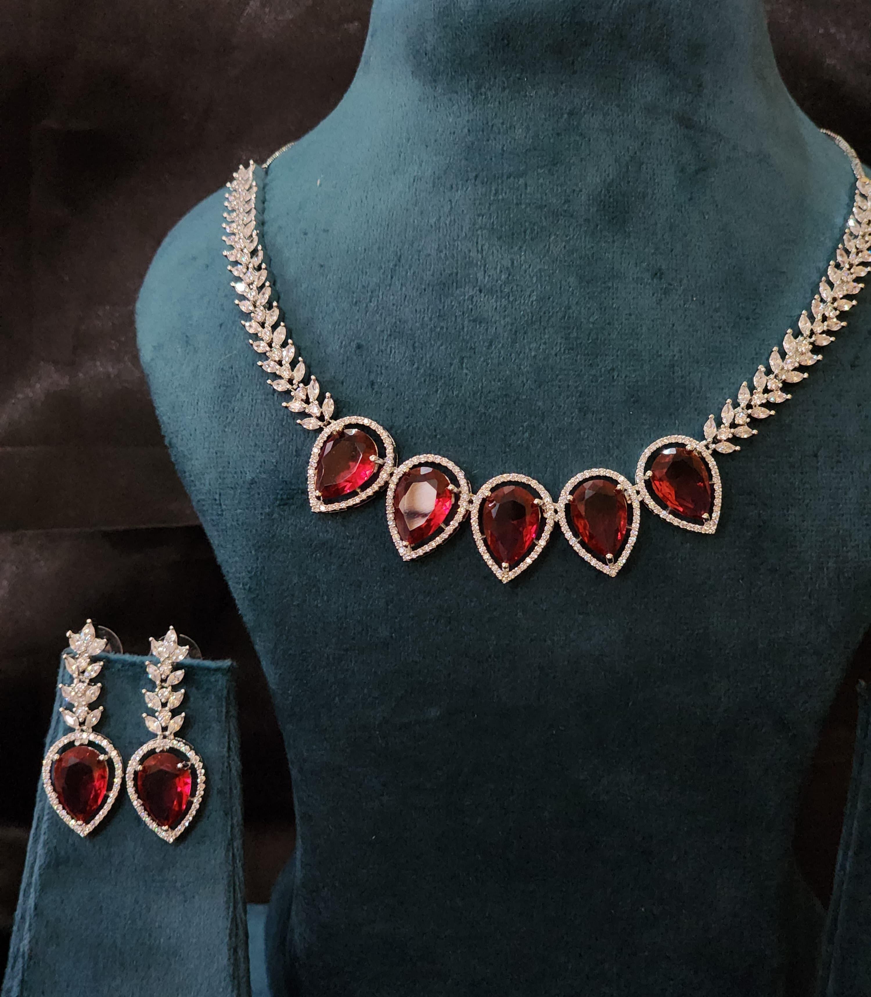 The necklace features a magnificent sequence of deep crimson teardrop stones, each framed in a halo of glistening American diamonds. The surrounding leafy motifs along the neckline add a graceful, nature-inspired touch, enhancing its regal allure. The matching earrings mirror the necklace’s motif, cascading with sparkling marquise cuts and a striking red teardrop centerpiece — creating the perfect harmony of grandeur and grace.