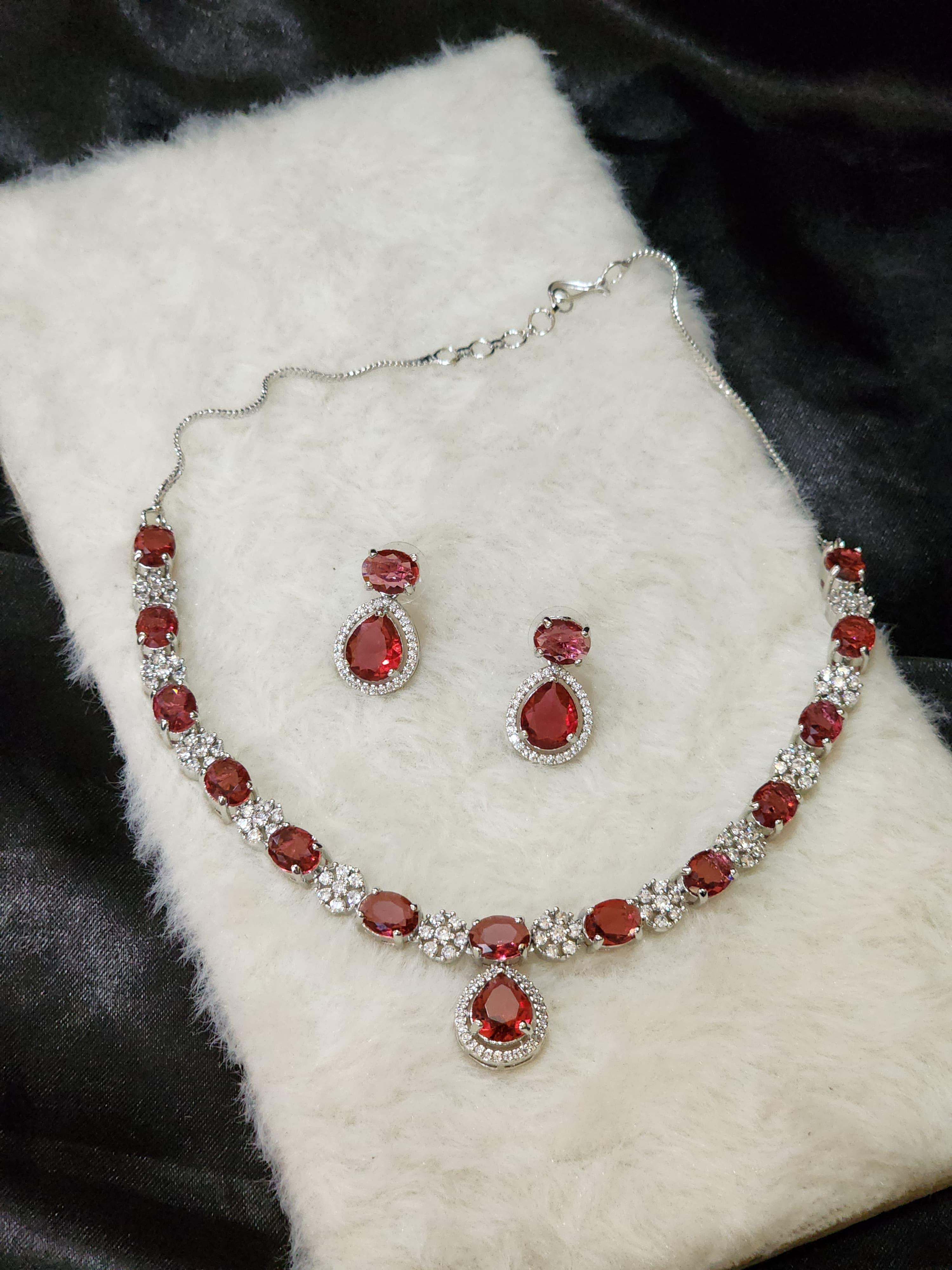 Make a bold and elegant statement with the Crimson Radiance Necklace Set from Luxe Aabhushan, a luxurious American Diamond ensemble crafted to embody timeless sophistication and modern glamour. Perfect for weddings, festive occasions, and upscale soirées, this set exudes royal charm with its vibrant red tones and high-shine brilliance.