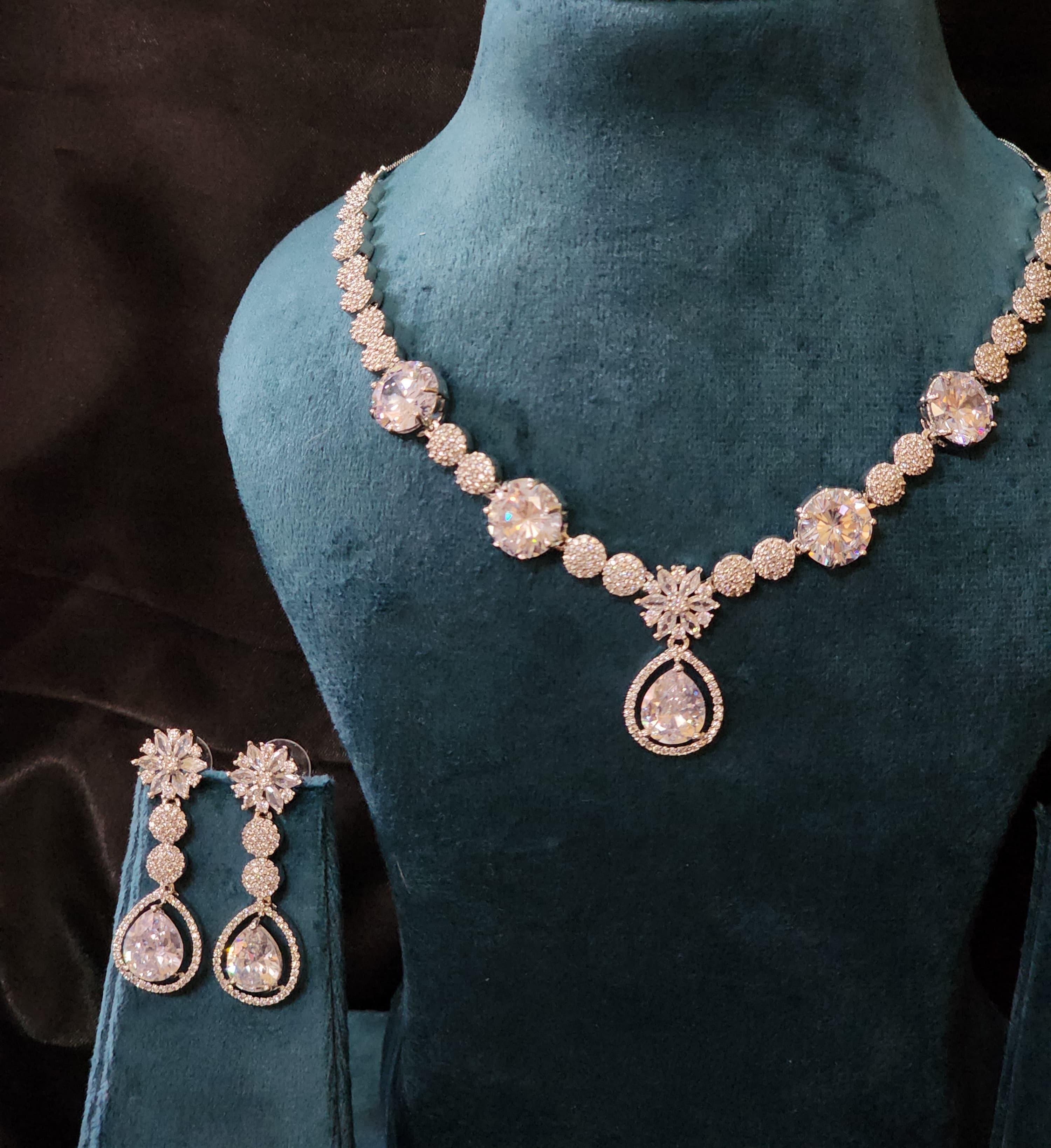The necklace showcases a captivating sequence of round-cut American diamonds, interspersed with glittering pave clusters, all leading to a magnificent teardrop-shaped pendant encrusted in a halo of dazzling stones. The centerpiece is topped with a floral burst of brilliance, exuding regal charm. Matching earrings, designed in a cascading floral and teardrop silhouette, complete this exquisite ensemble.