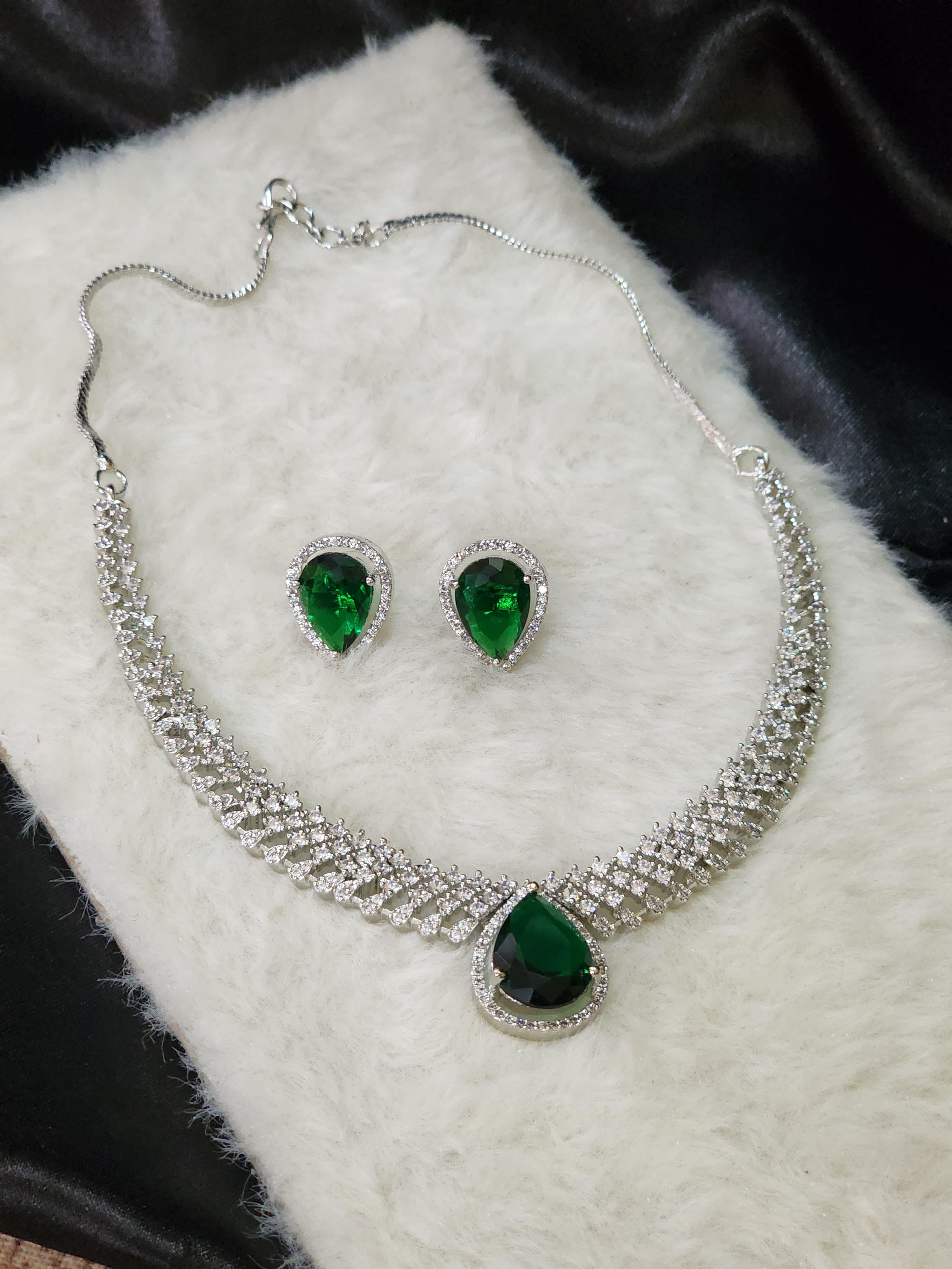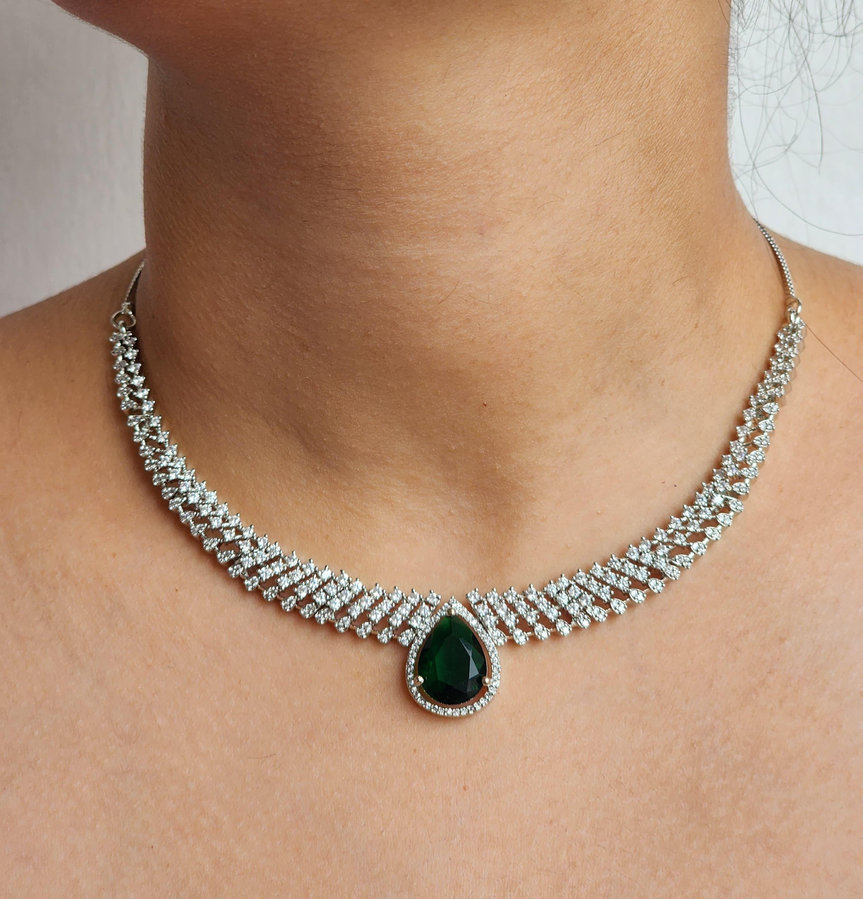 The necklace features a beautifully graduated lattice of dazzling American diamonds that seamlessly wraps around the neckline, leading to a majestic teardrop-shaped emerald-green centerpiece framed in a delicate halo. Complementing the necklace are matching earrings that mirror the same teardrop motif, offering a complete and captivating look that’s ideal for festive occasions, weddings, and elegant soirées.