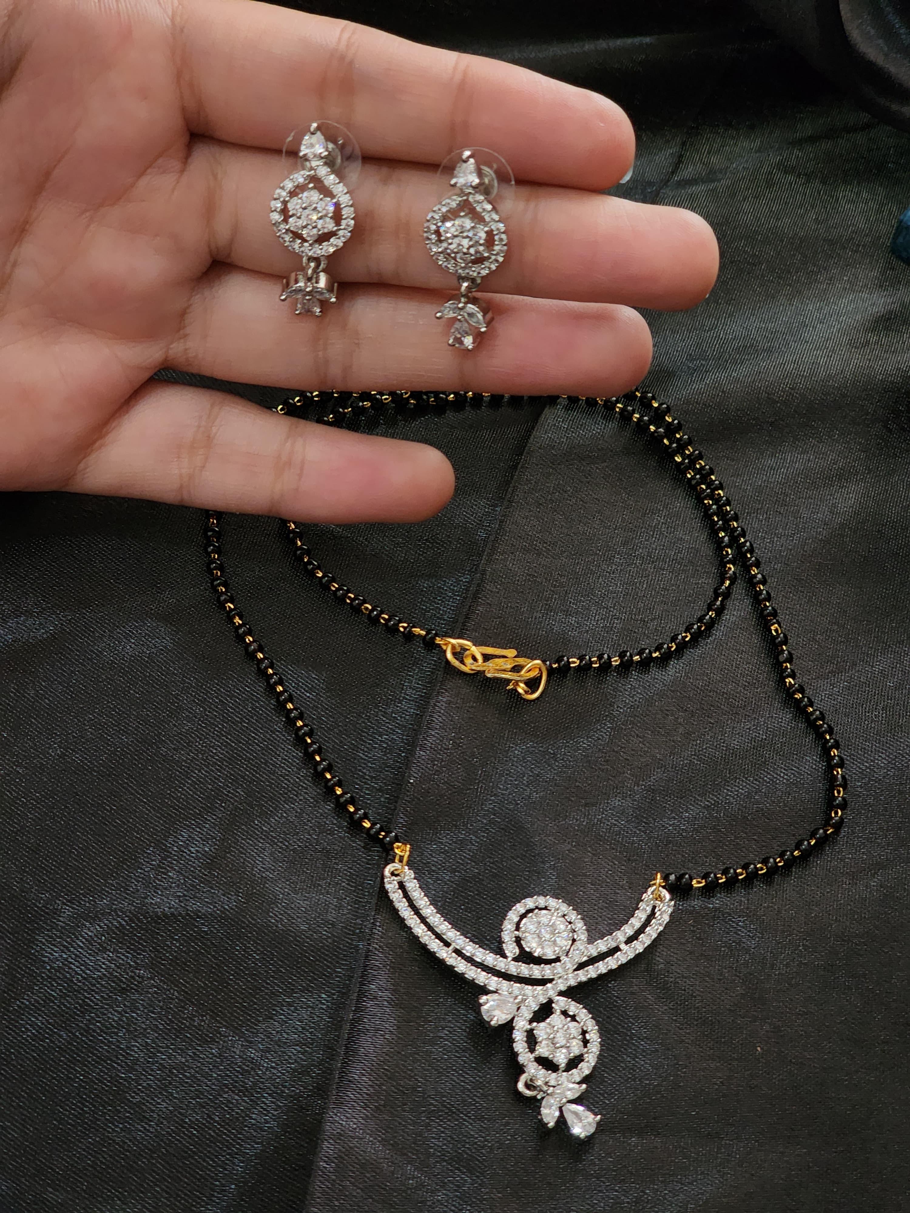 Strung on a classic dual-strand black onyx bead mangalsutra chain, this design perfectly merges traditional symbolism with a contemporary twist. The matching dangling earrings, also finished in a radiant silver tone, complete the look for a refined and coordinated appearance.