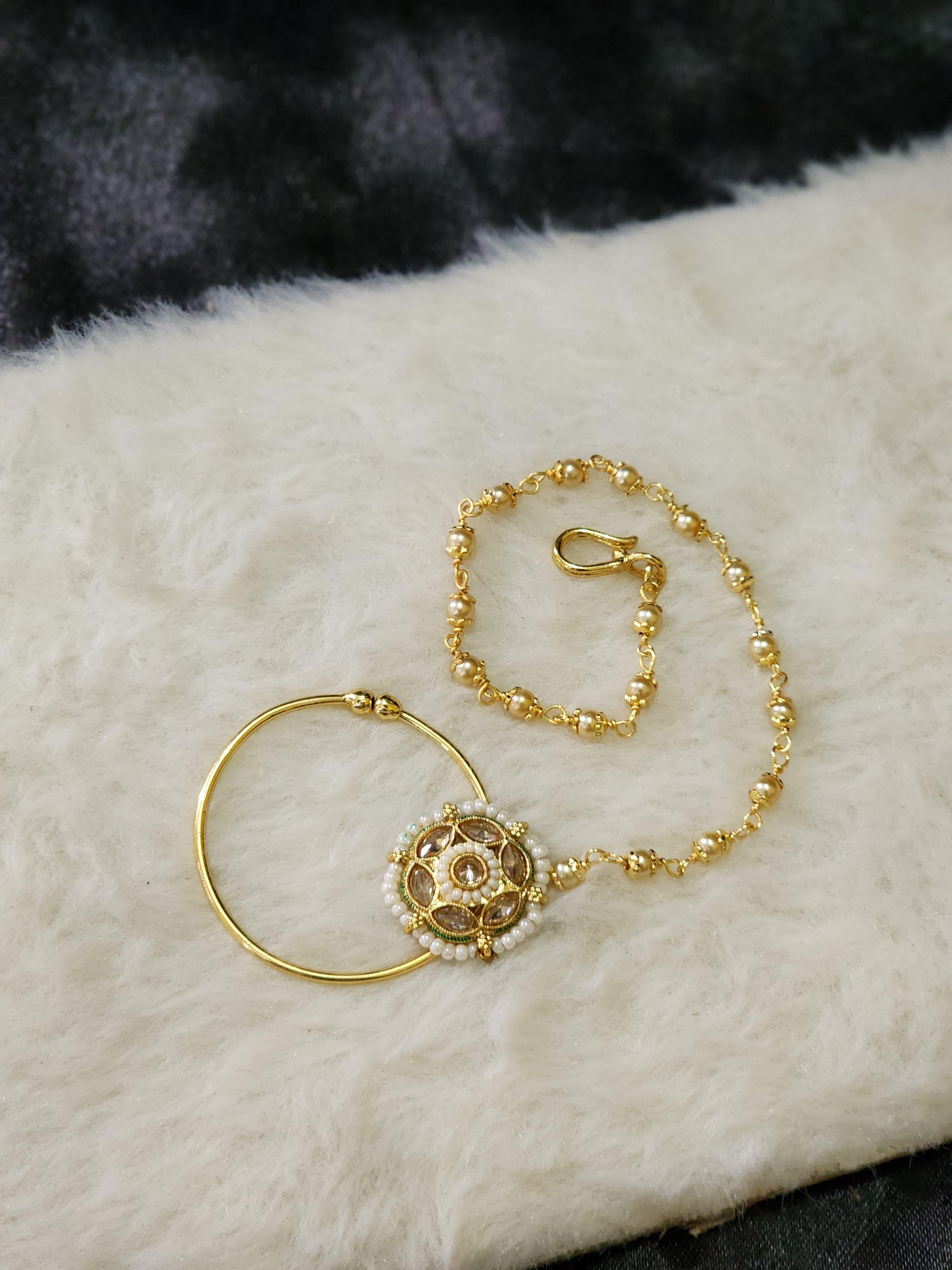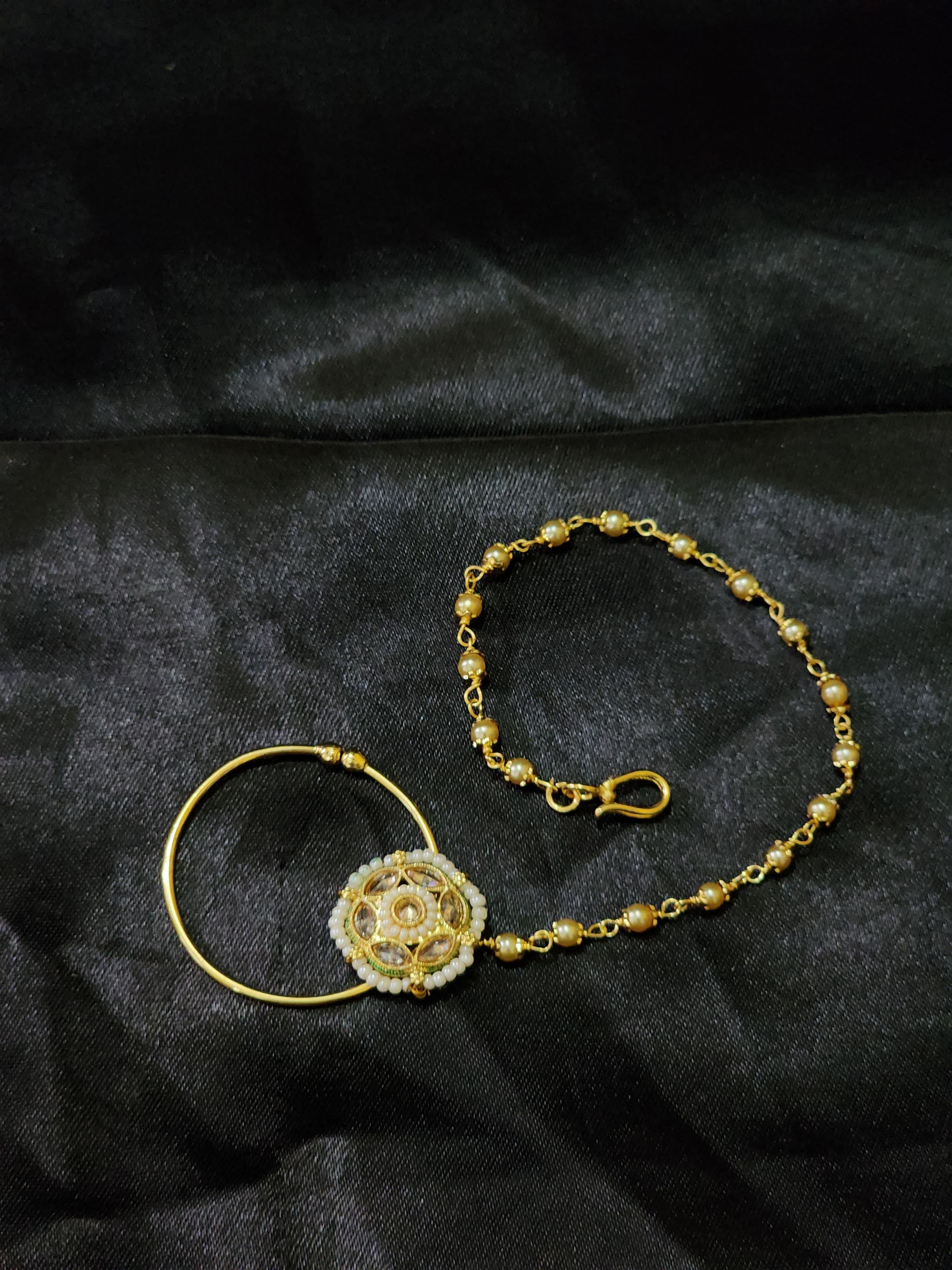 Attached is a rich gold beaded chain, designed with alternating golden beads for a traditional yet comfortable fit. Whether you're gracing a wedding mandap or celebrating a grand festive event, this nath effortlessly enhances your ethnic ensemble with elegance and grandeur.