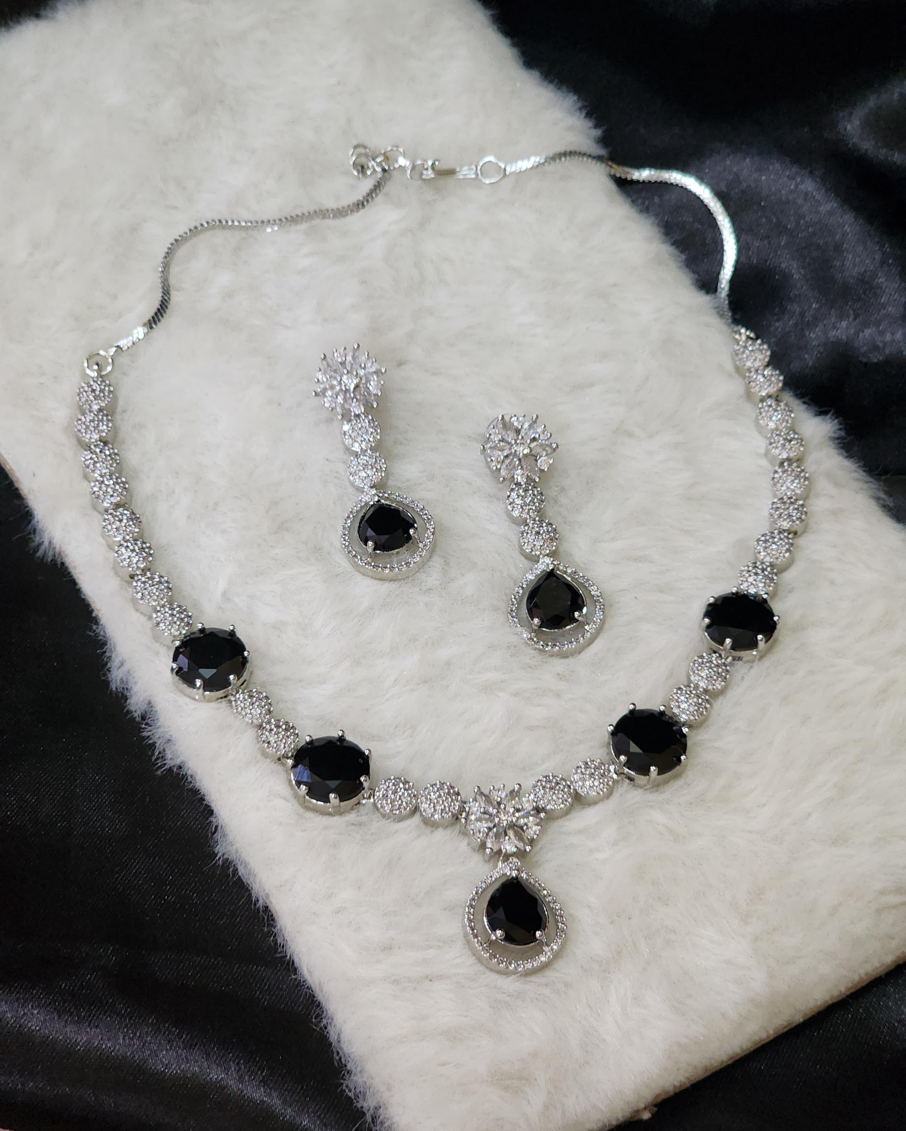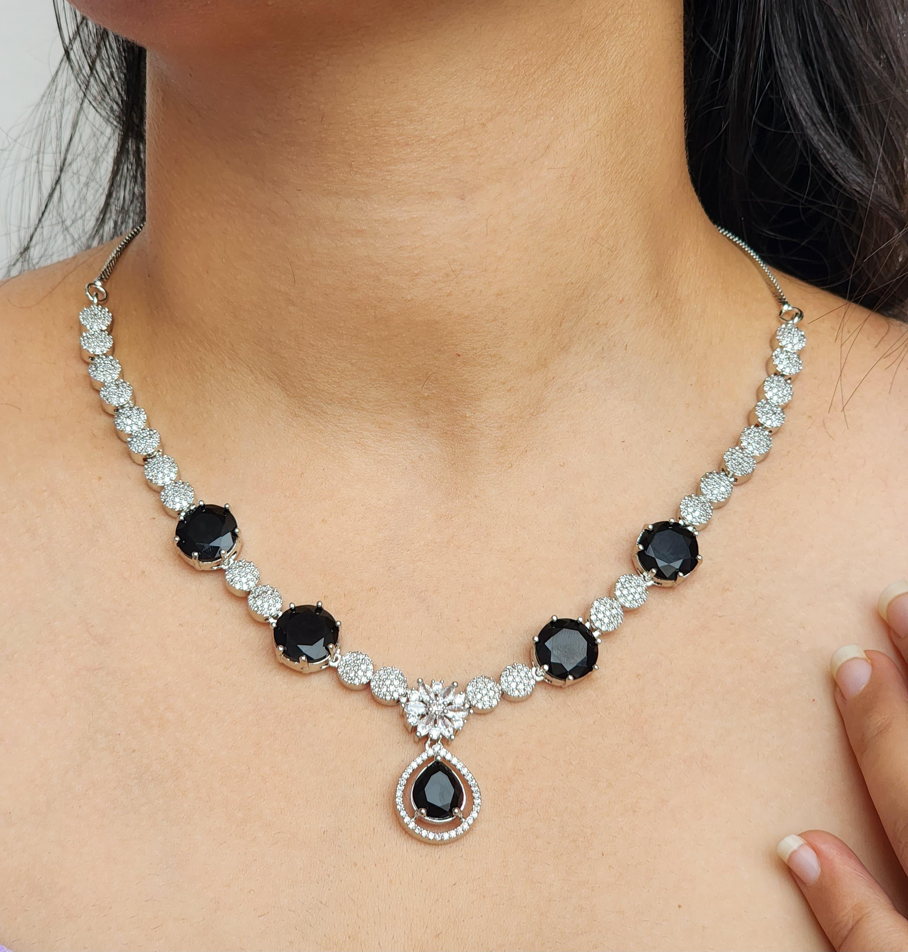 Featuring a regal arrangement of rich black stones gracefully paired with brilliant American diamonds, the necklace forms a captivating silhouette of radiance. The meticulously set round and teardrop stones create an elegant cascade, culminating in a stunning centerpiece. Paired with matching drop earrings that mirror the necklace's design, this set adds refined drama to both ethnic and contemporary wear.