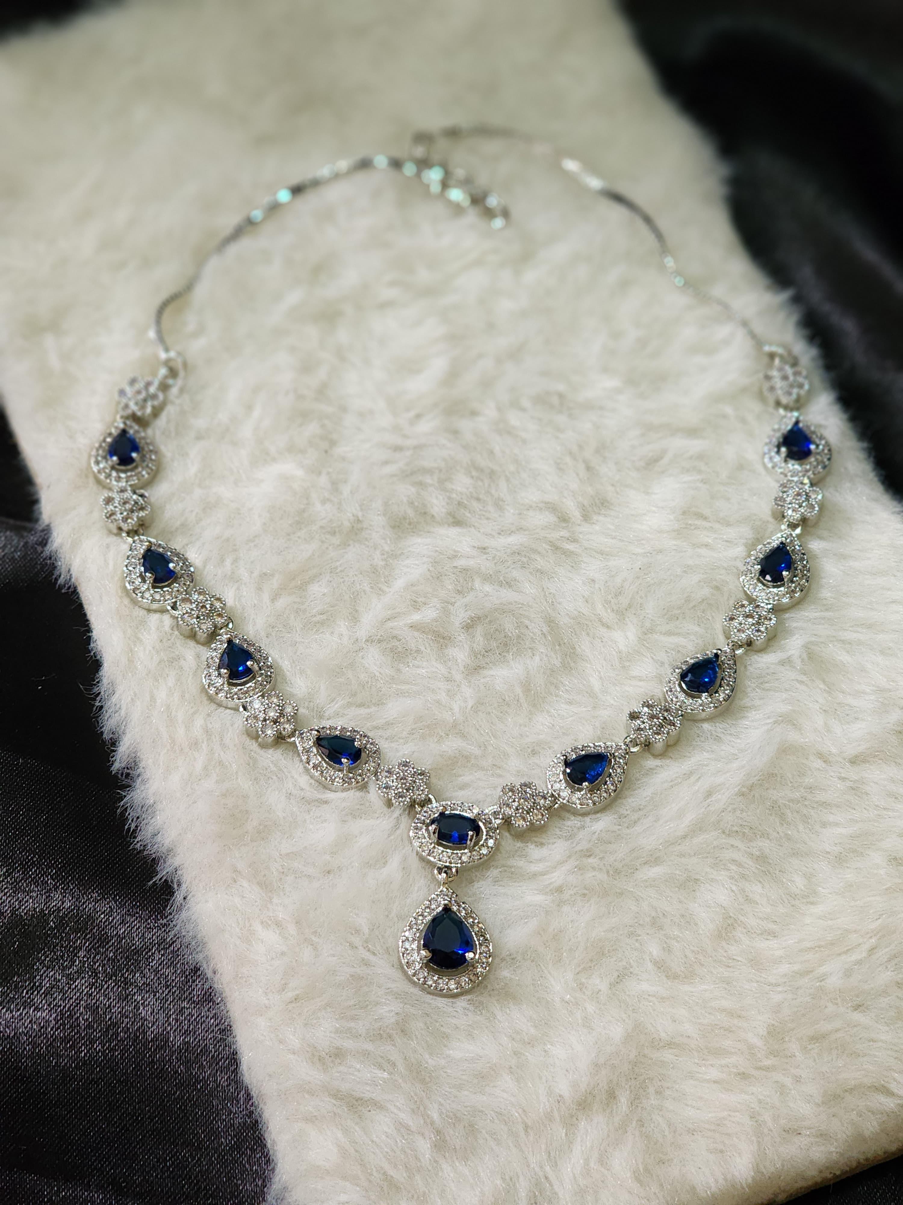 Make a statement of timeless elegance with Luxe Aabhushan’s Noir Royale Blue AD Necklace Set, a majestic creation for the woman who embraces luxury and grace. This set features deep royal blue teardrop and oval-cut stones, intricately framed in a bed of dazzling American Diamonds. The silver-toned base enhances the brilliance of each stone, exuding a sophisticated sparkle with every turn.