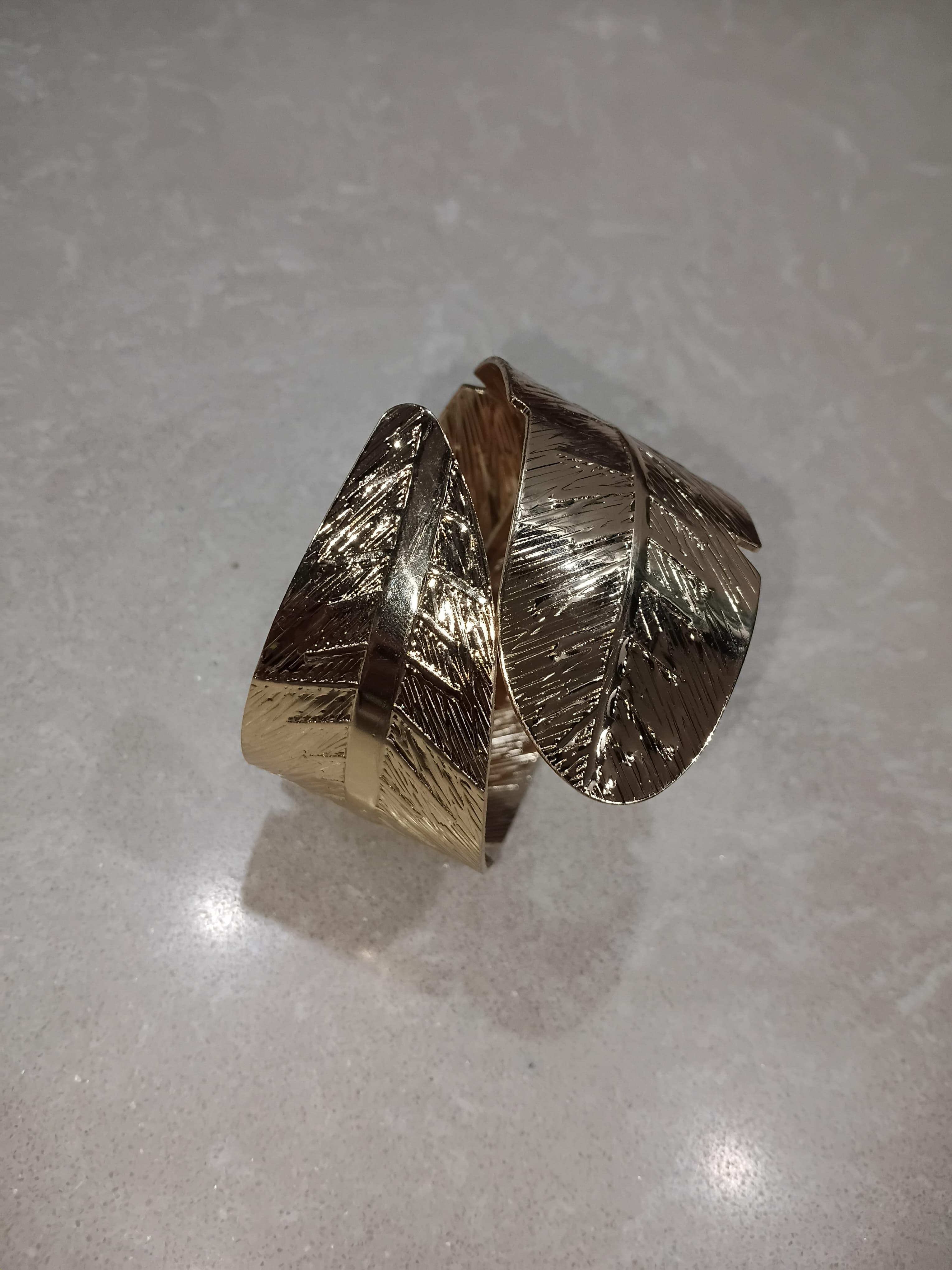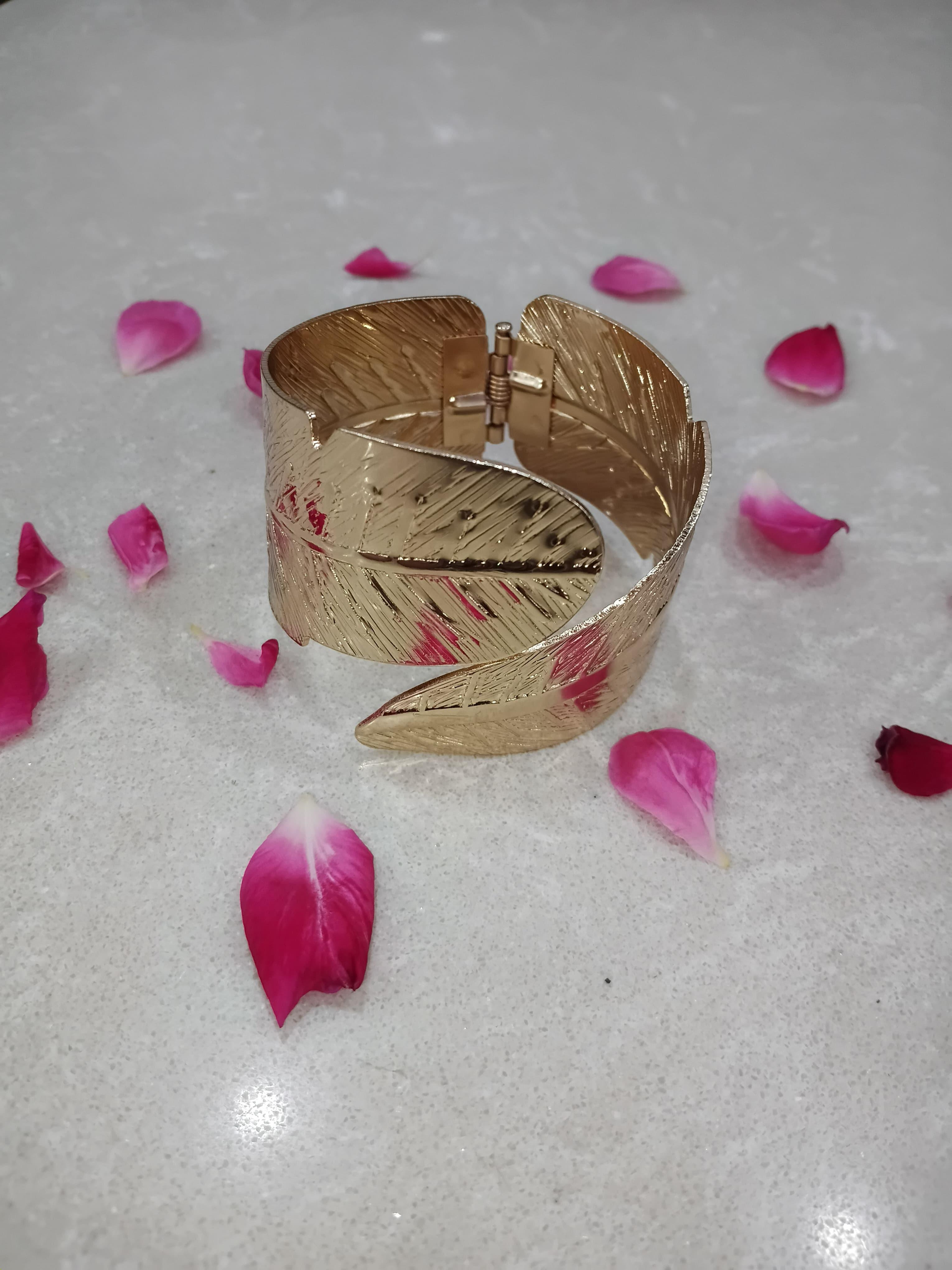Crafted from a premium alloy with 22K gold mirror-finish plating, the bracelet brings a radiant warmth to your ensemble, whether paired with an elegant saree, a flowing gown, or Indo-western silhouettes. The open-front design and contoured shape allow for a comfortable, adjustable fit.