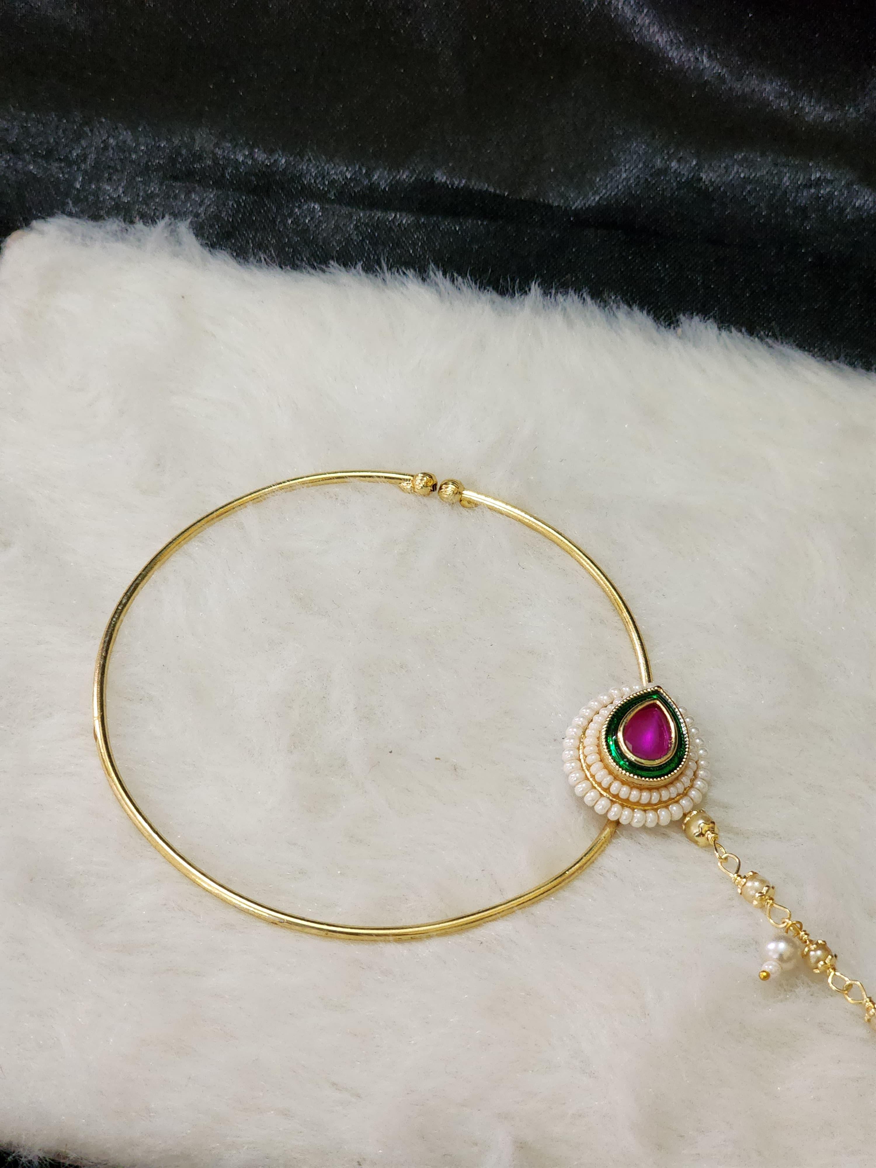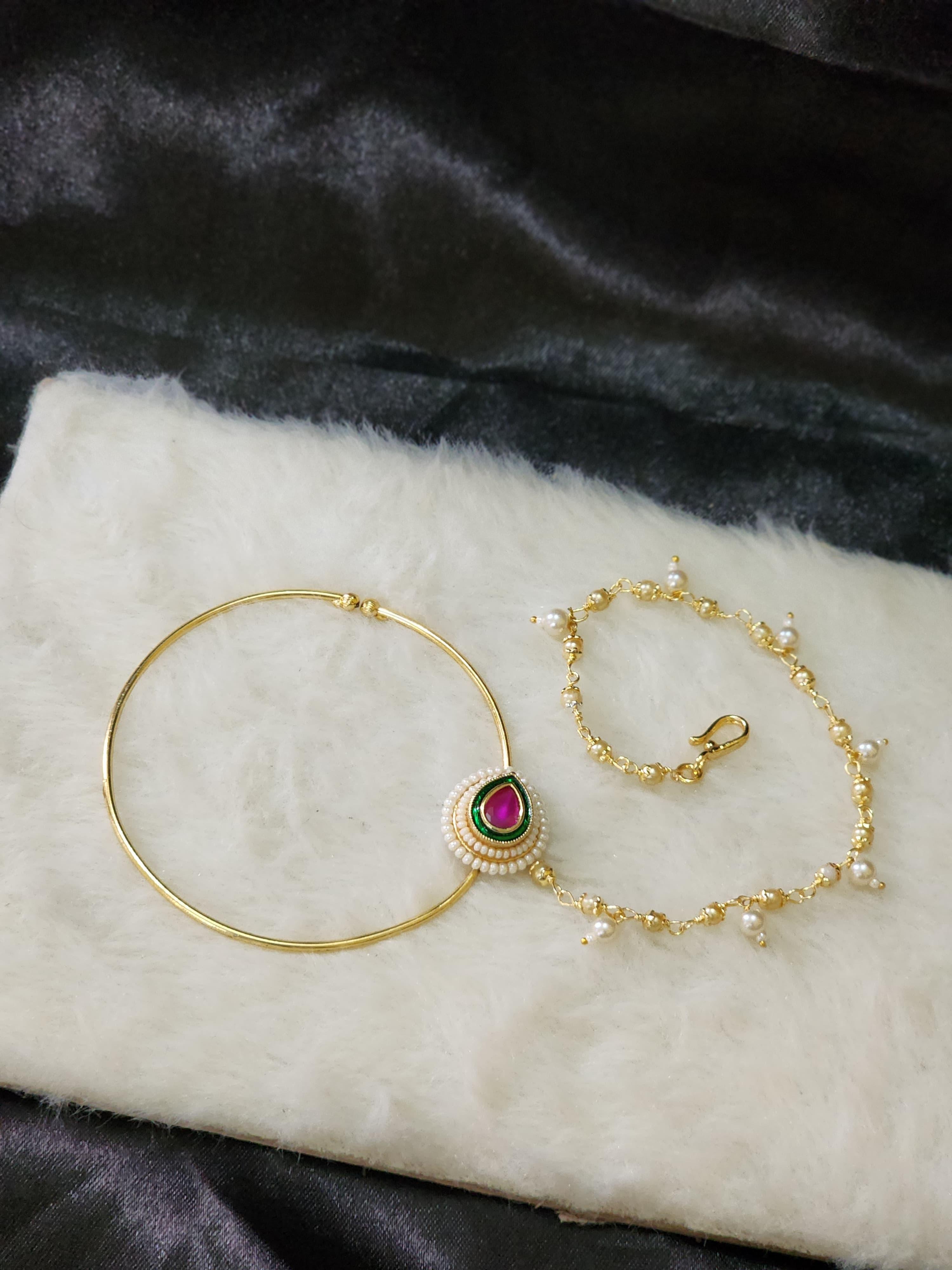 The attached gold-toned beaded chain, embellished with dainty faux pearls, adds an extra layer of grace, making it the perfect accessory to pair with lehengas, sarees, or bridal wear. Lightweight and easy to wear, this statement piece ensures comfort without compromising on elegance.