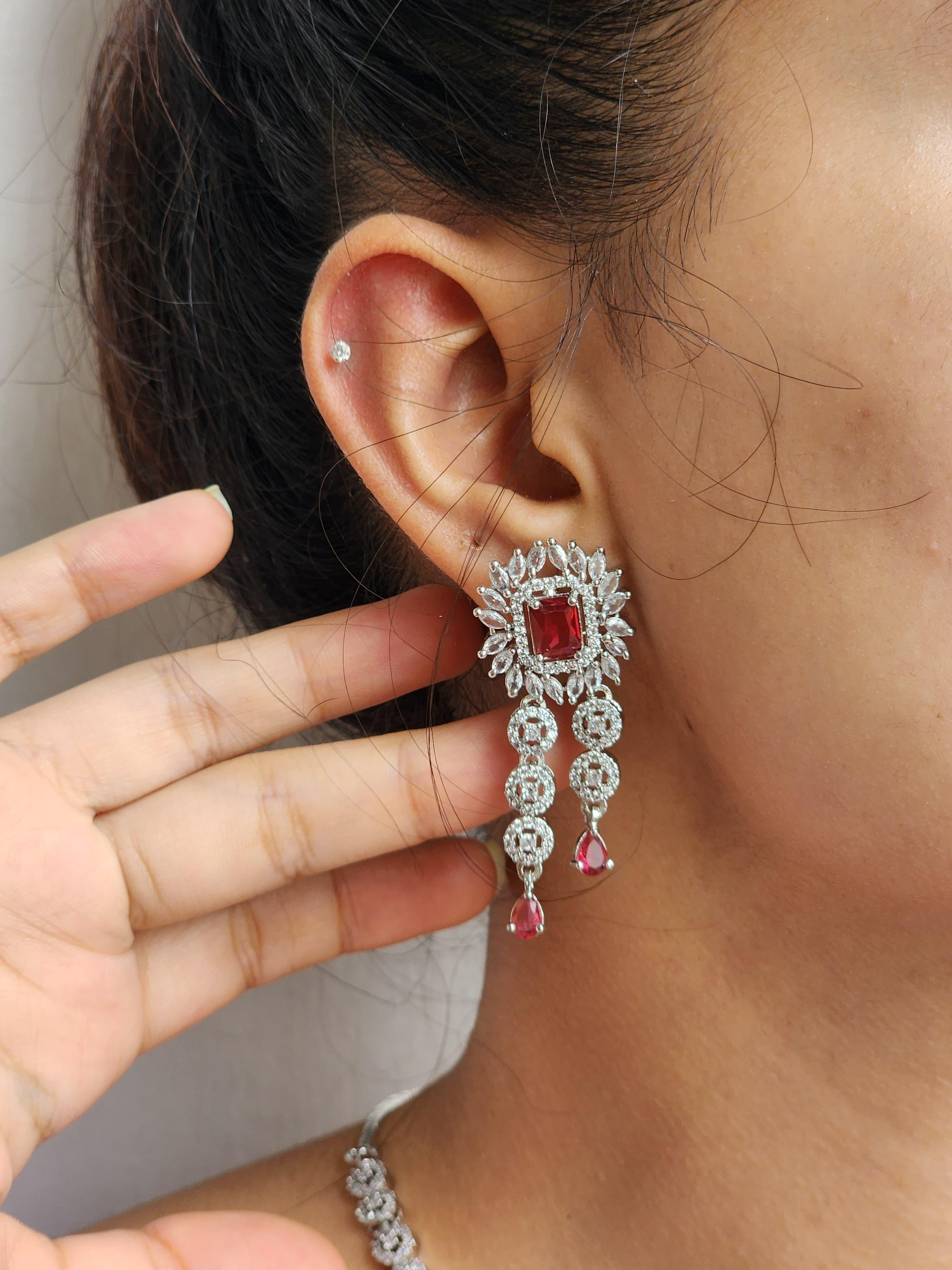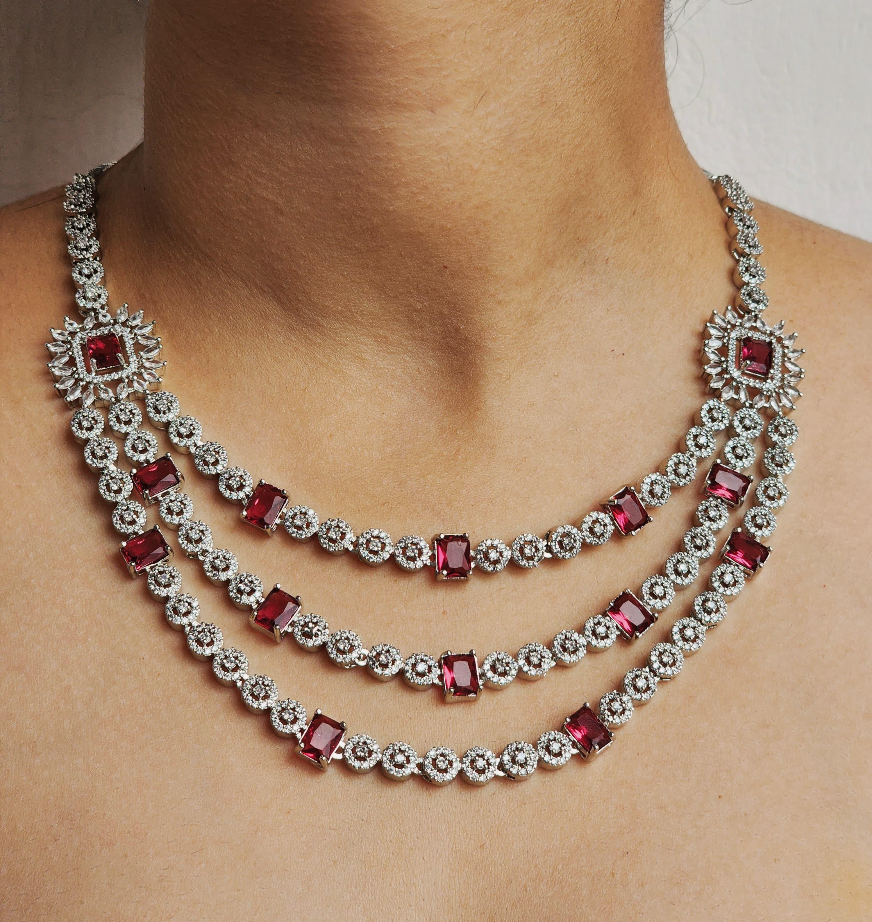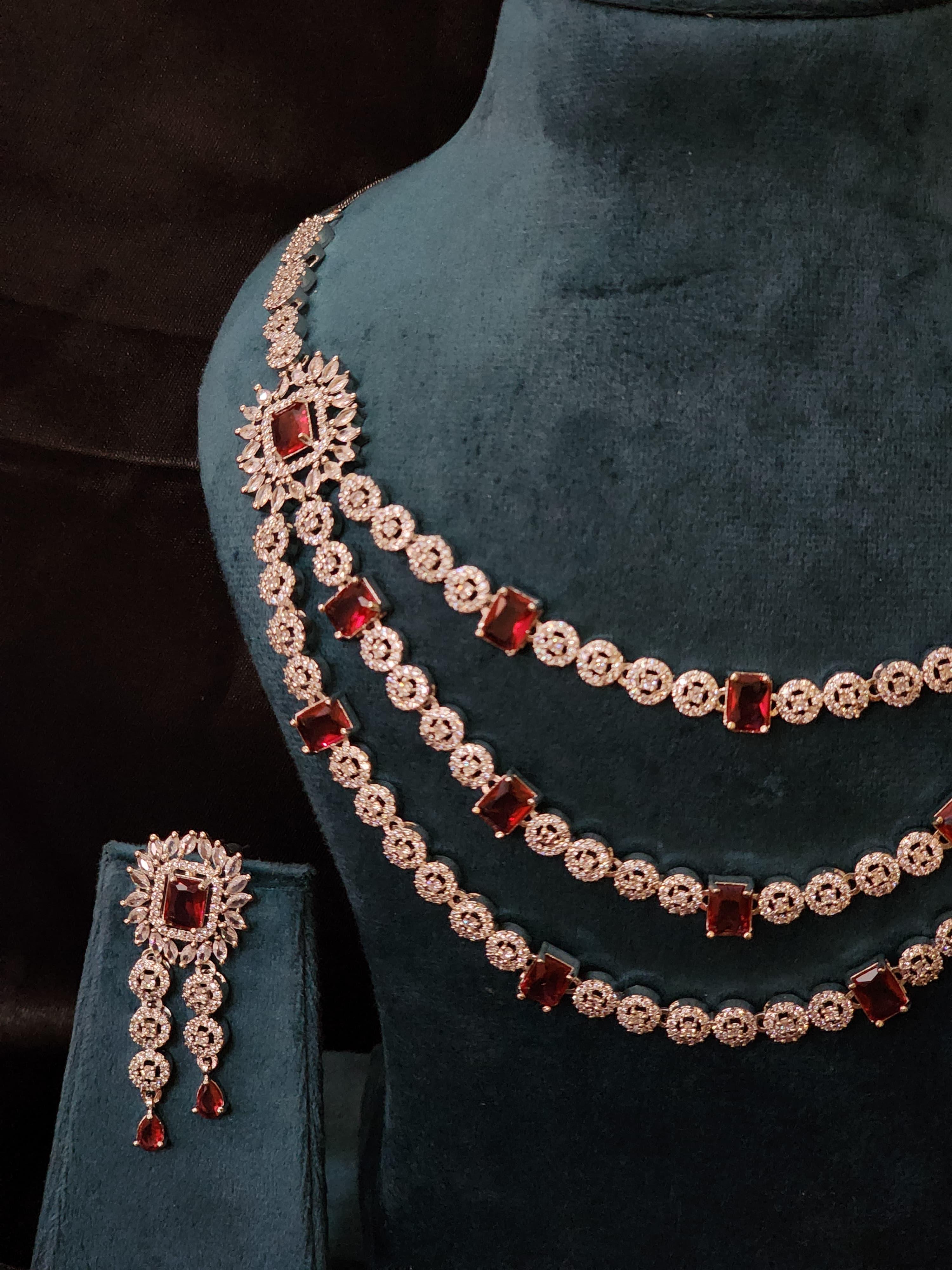 The layered necklace showcases three elegant rows of shimmering American diamond floral clusters, beautifully interspersed with deep burgundy emerald-cut stones. Each layer cascades gracefully, adding dramatic depth and vintage charm. The bold floral side motifs add grandeur, framing the necklace with regality. Matching chandelier earrings and a coordinating maang tikka complete the ensemble, echoing the central design with precision and brilliance.