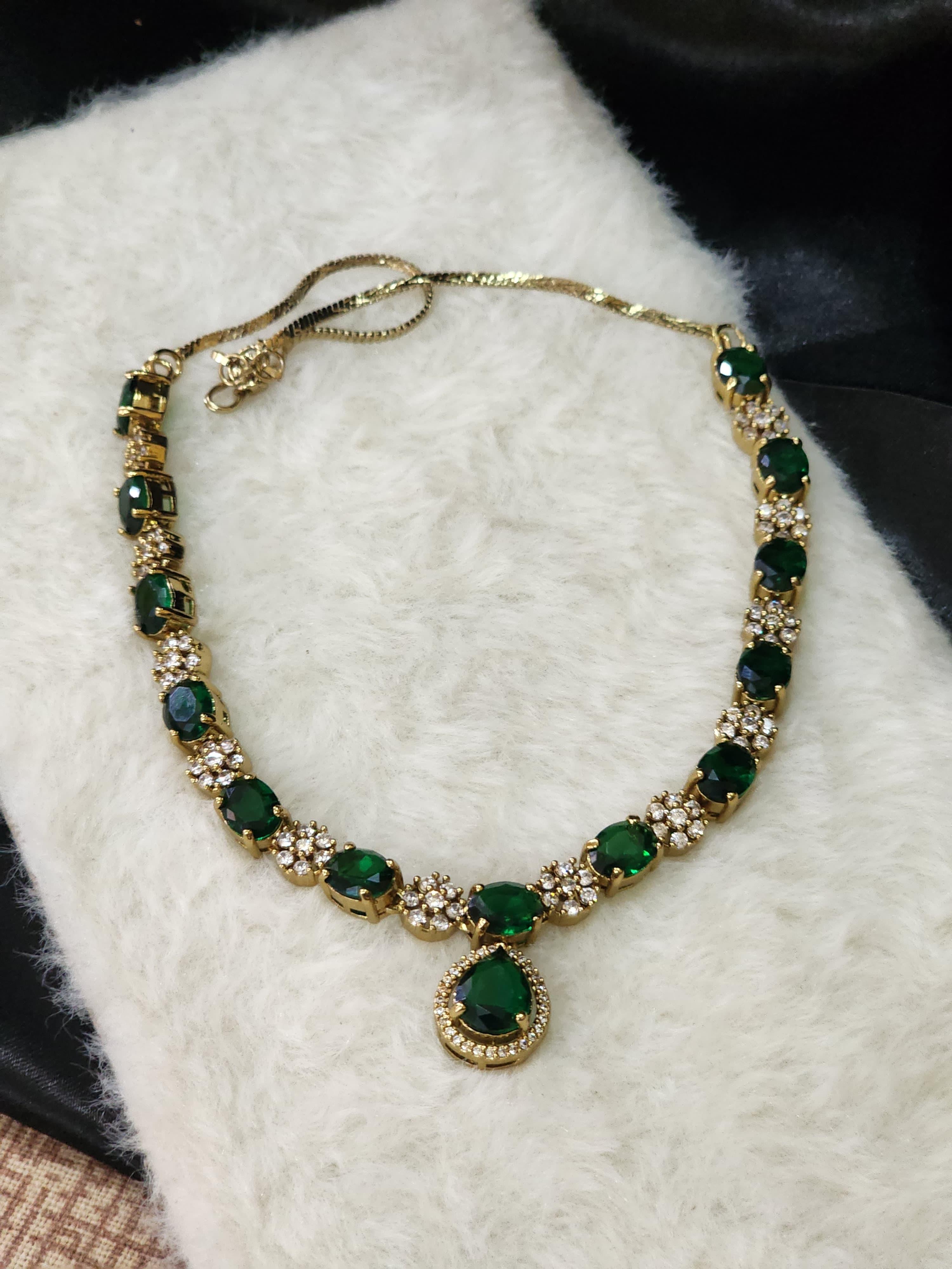 The necklace showcases a stunning sequence of deep emerald green oval-cut stones alternated with floral clusters of American diamonds, all set on a radiant gold-toned base. The centerpiece, a drop-shaped emerald stone bordered by a halo of shimmering crystals, adds a classic focal point. The matching earrings reflect the same design, combining a regal silhouette with impeccable shine, offering a perfectly coordinated look.