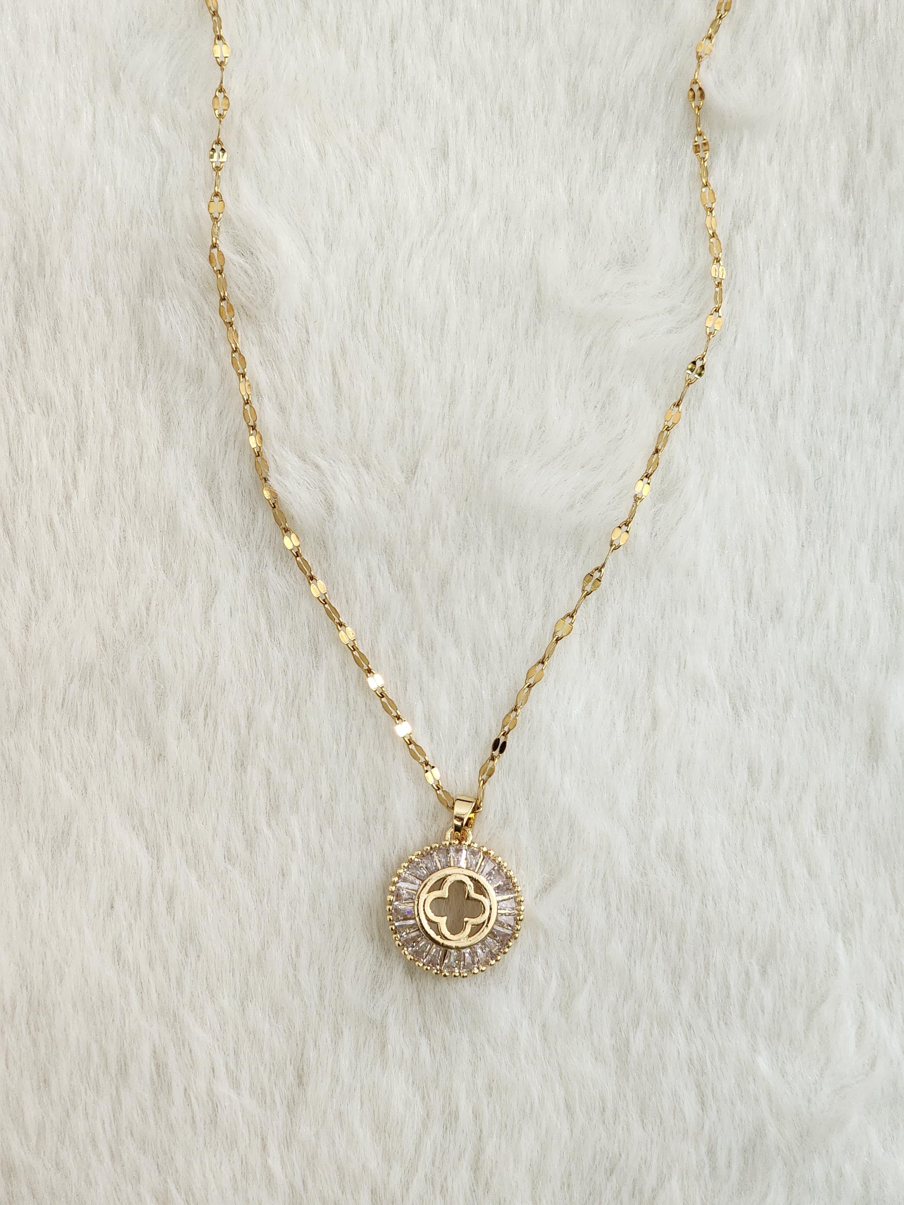 At its center is a round medallion pendant, adorned with a stunning pave of high-grade baguette-cut cubic zirconia, radiating like sunbeams around a chic four-leaf clover motif. The clover, a classic emblem of luck and harmony, adds a meaningful layer to this dazzling statement piece.