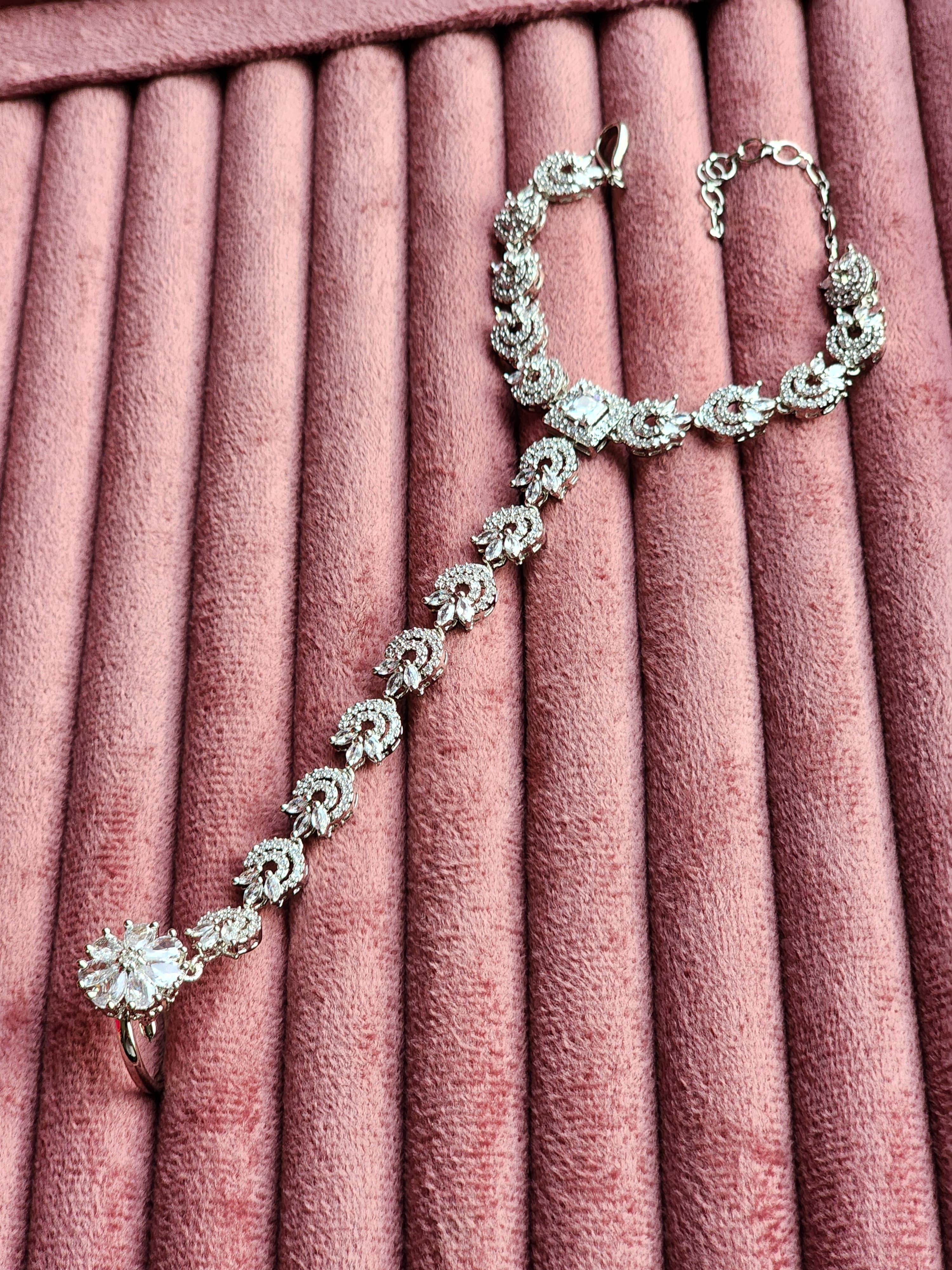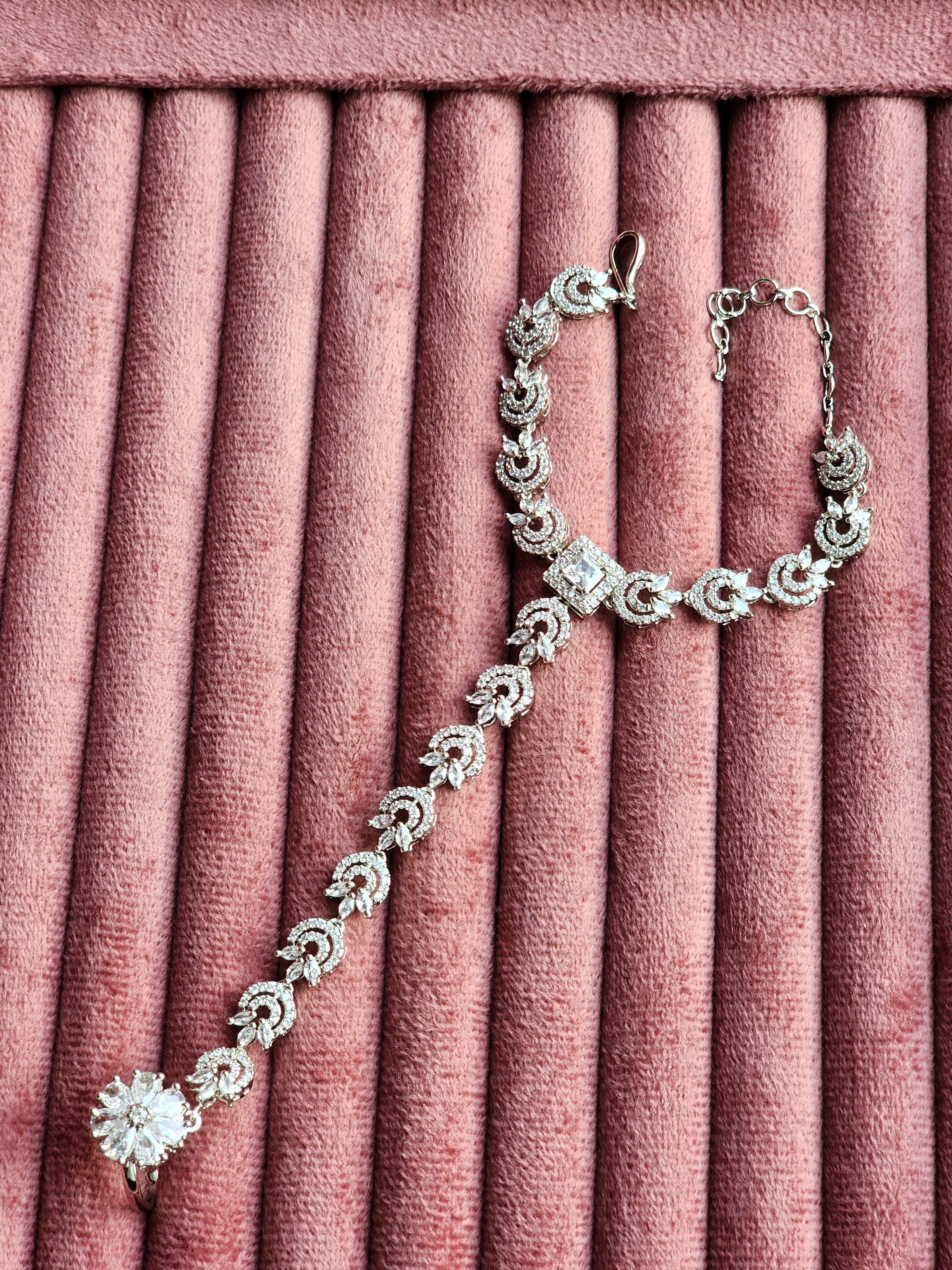 Introducing the Celestial Charm CZ Haathphool Bracelet by Luxe Aabhushan – a dazzling statement of sophistication crafted for the modern-day queen. This unique fusion piece blends the elegance of a bracelet and the grace of a ring, connected with a seamless line of glimmering motifs, perfect for festive grandeur and bridal brilliance.