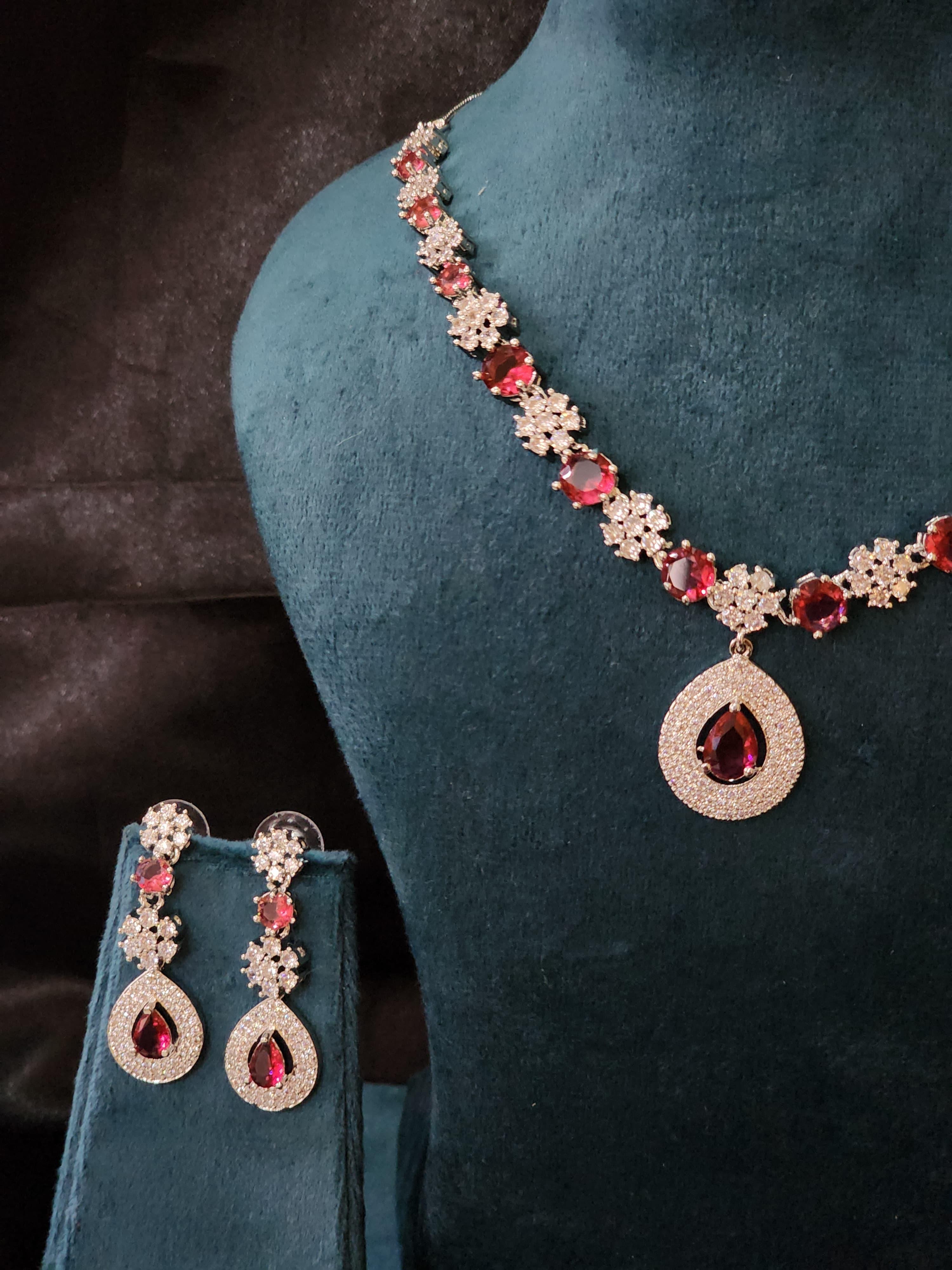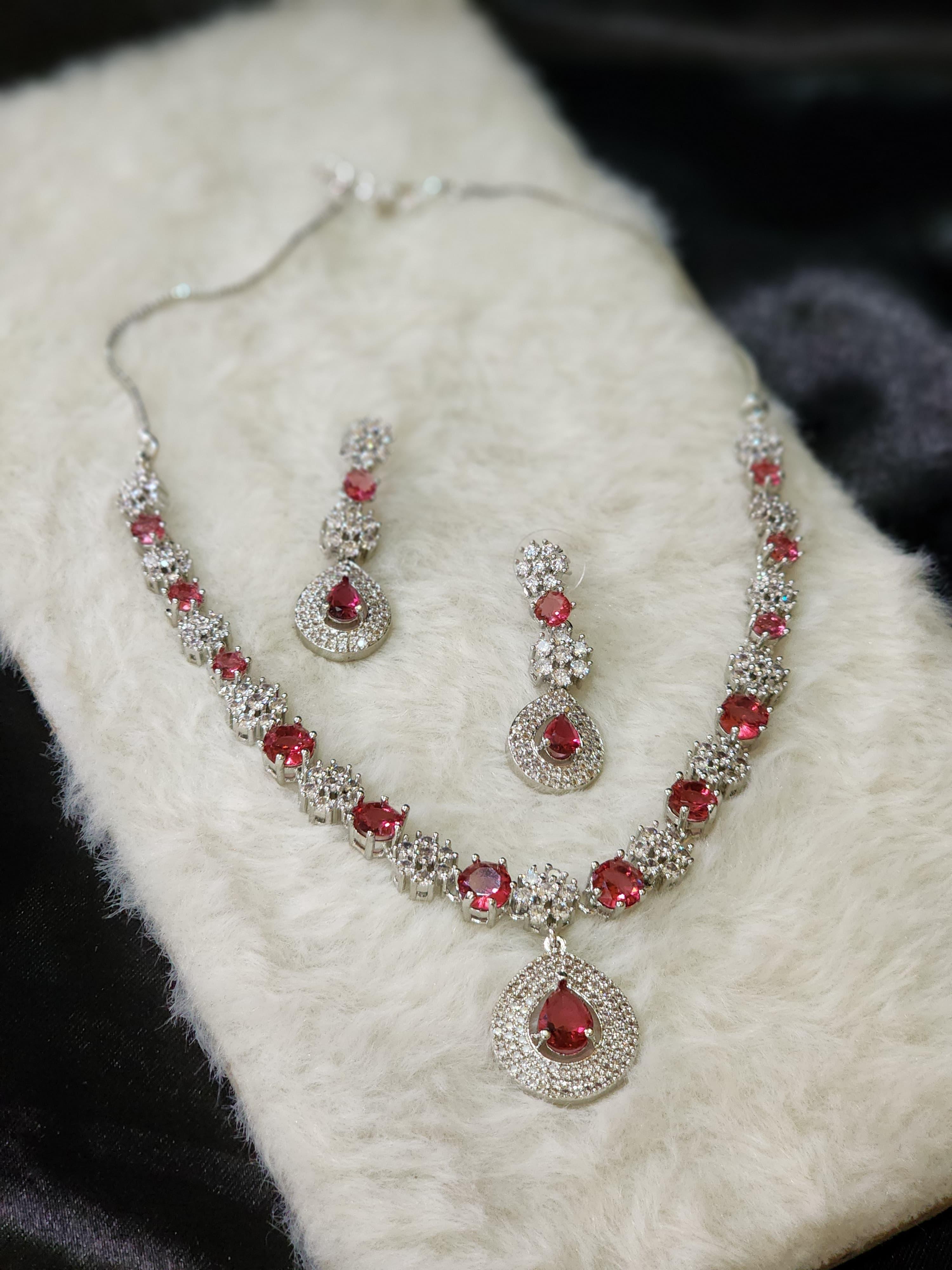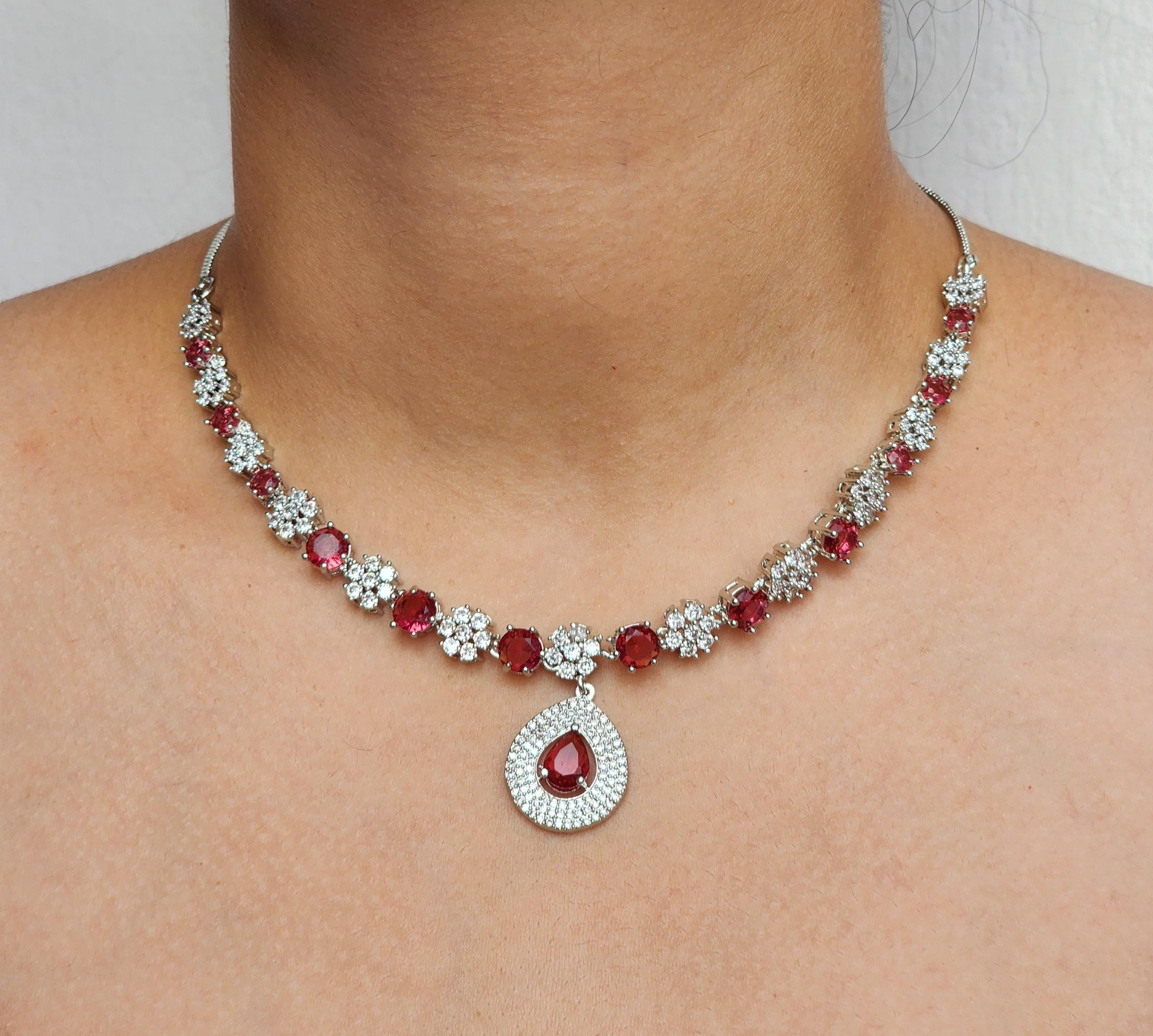 Add a royal sparkle to your special occasions with the Crimson Grace Ruby AD Necklace Set from Luxe Aabhushan. This stunning American Diamond necklace set is a true showstopper, featuring radiant ruby-red teardrop stones delicately embraced by layers of high-shine American Diamonds. The silver-toned metal base enhances its brilliance, creating an ultra-glamorous look ideal for weddings, festivals, and receptions.