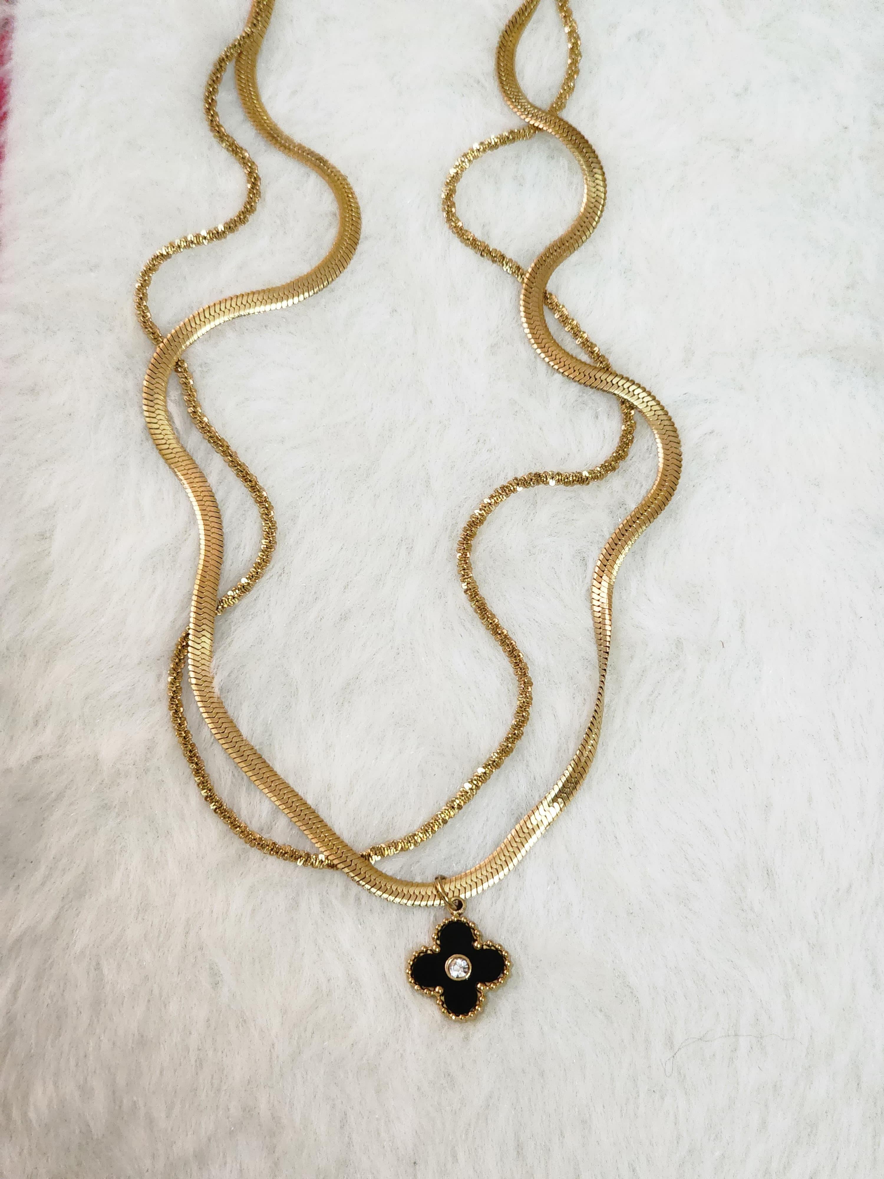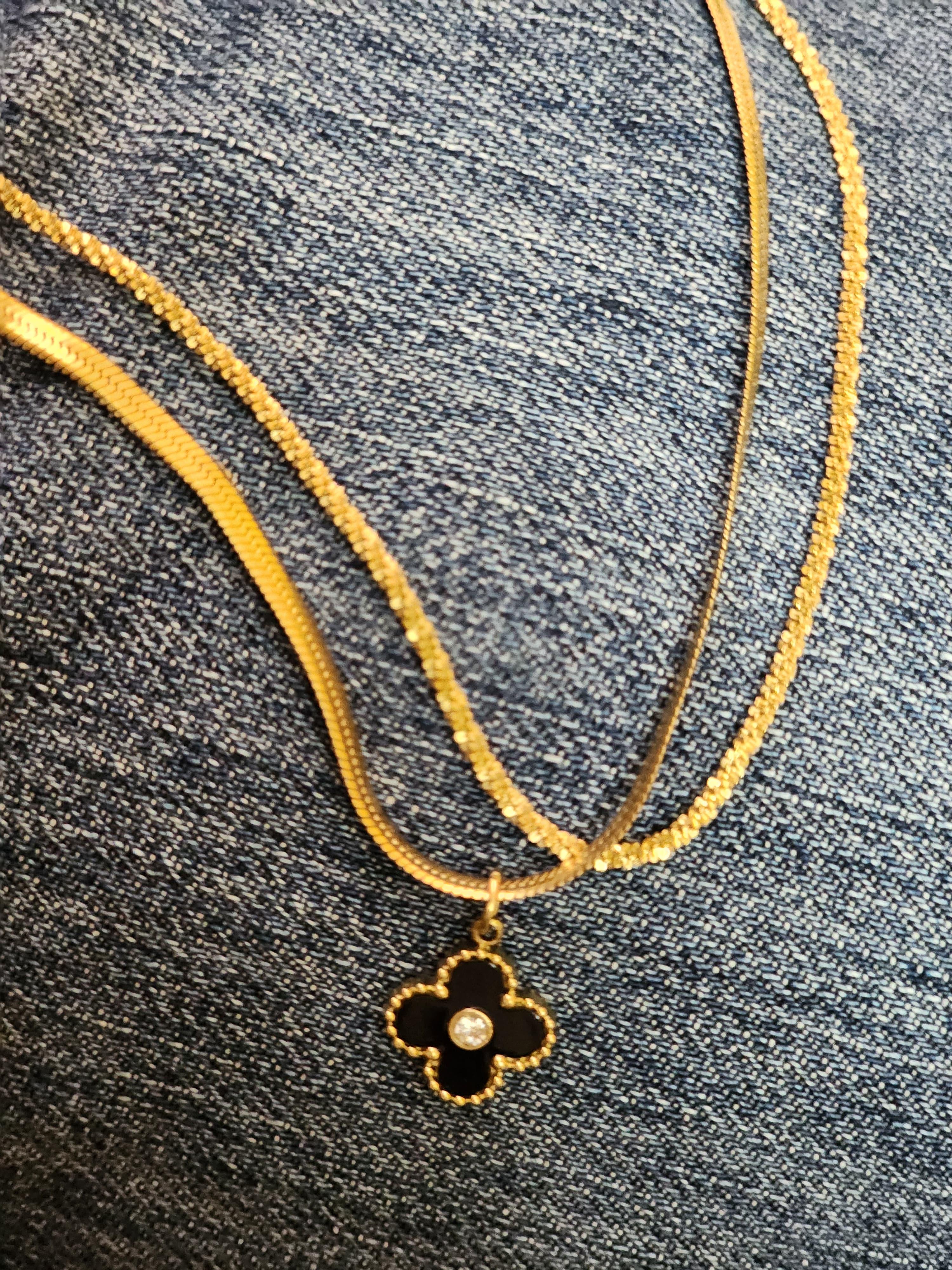 At the center of attention is a striking black four-leaf clover pendant, delicately bordered with gold beading and adorned with a sparkling cubic zirconia at its heart. Symbolizing luck and elegance, this pendant adds a timeless allure to the overall design.