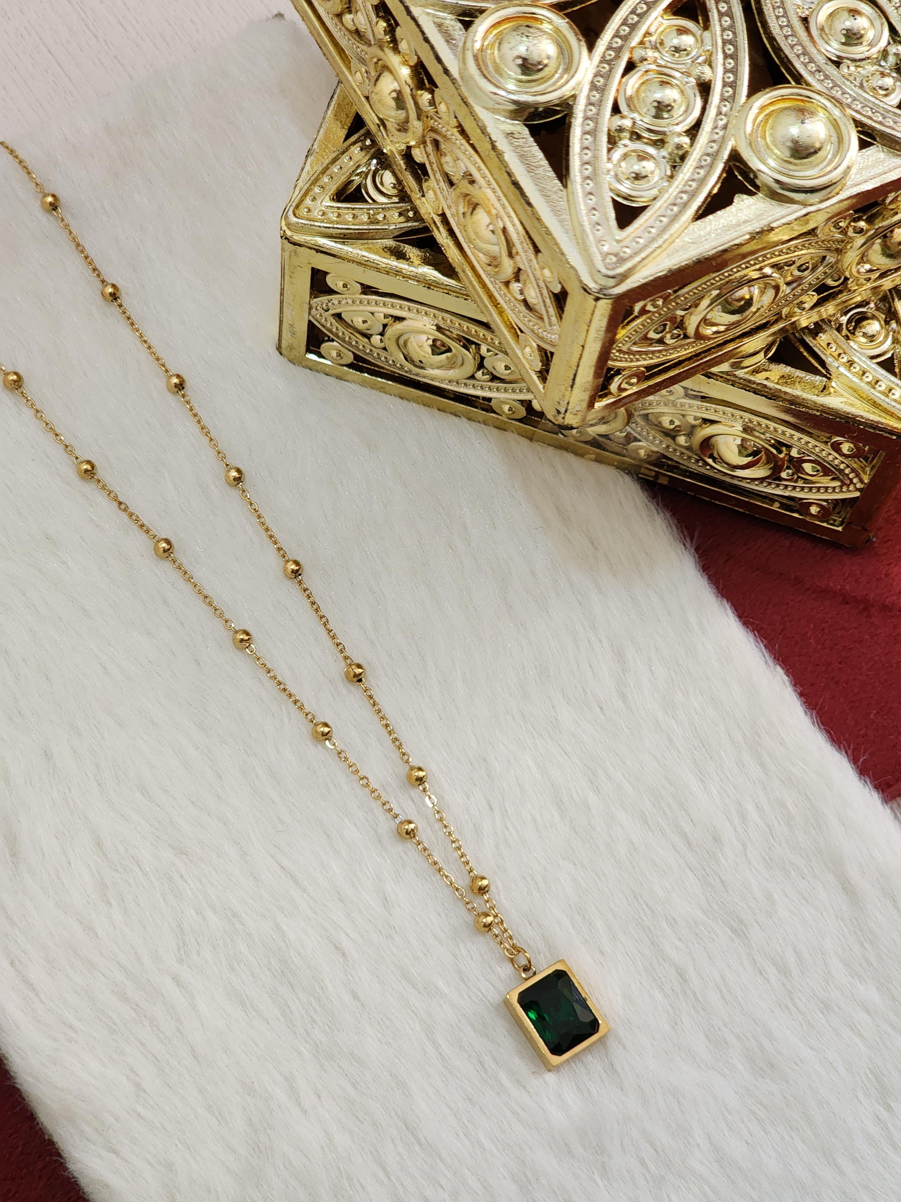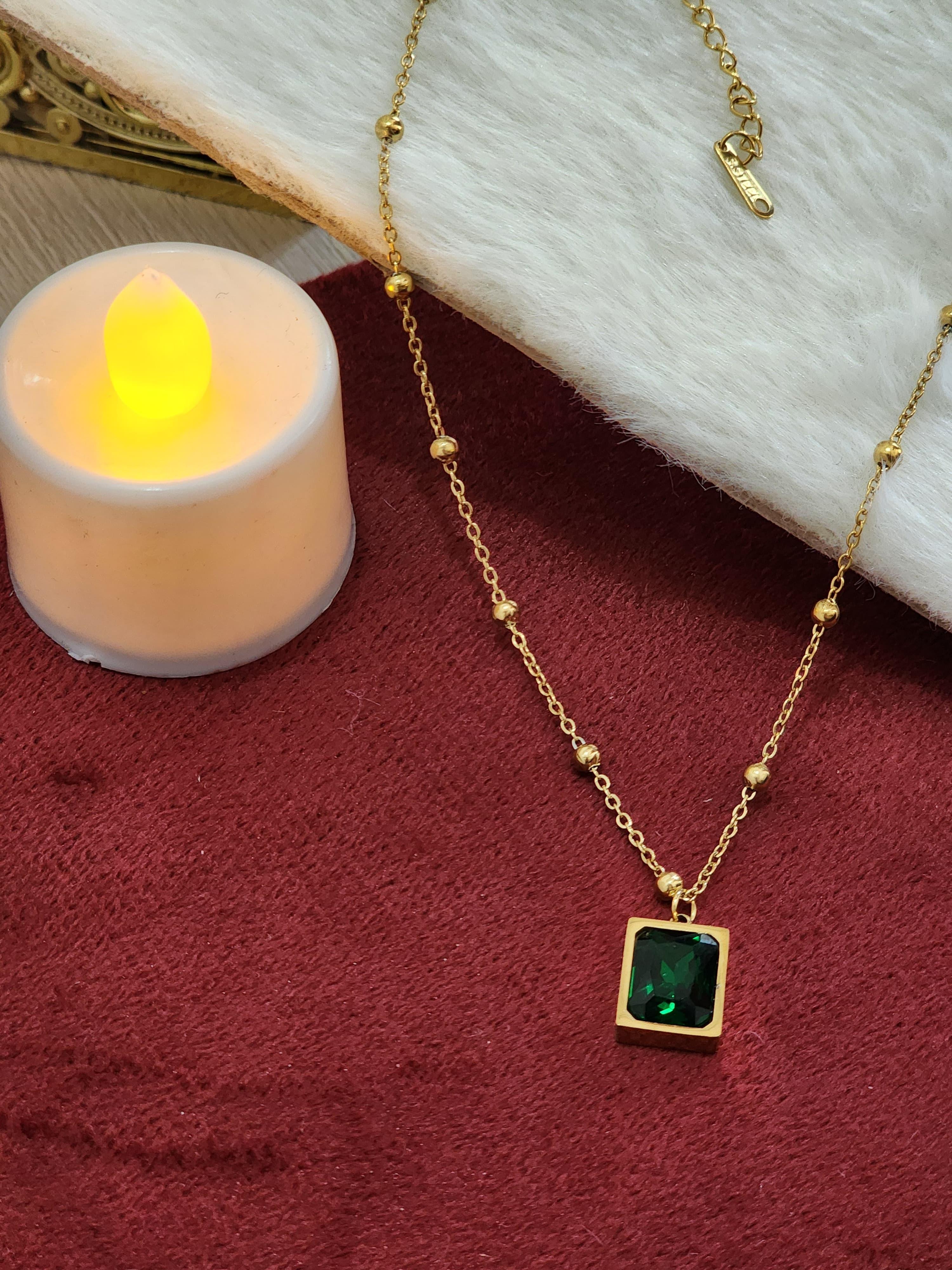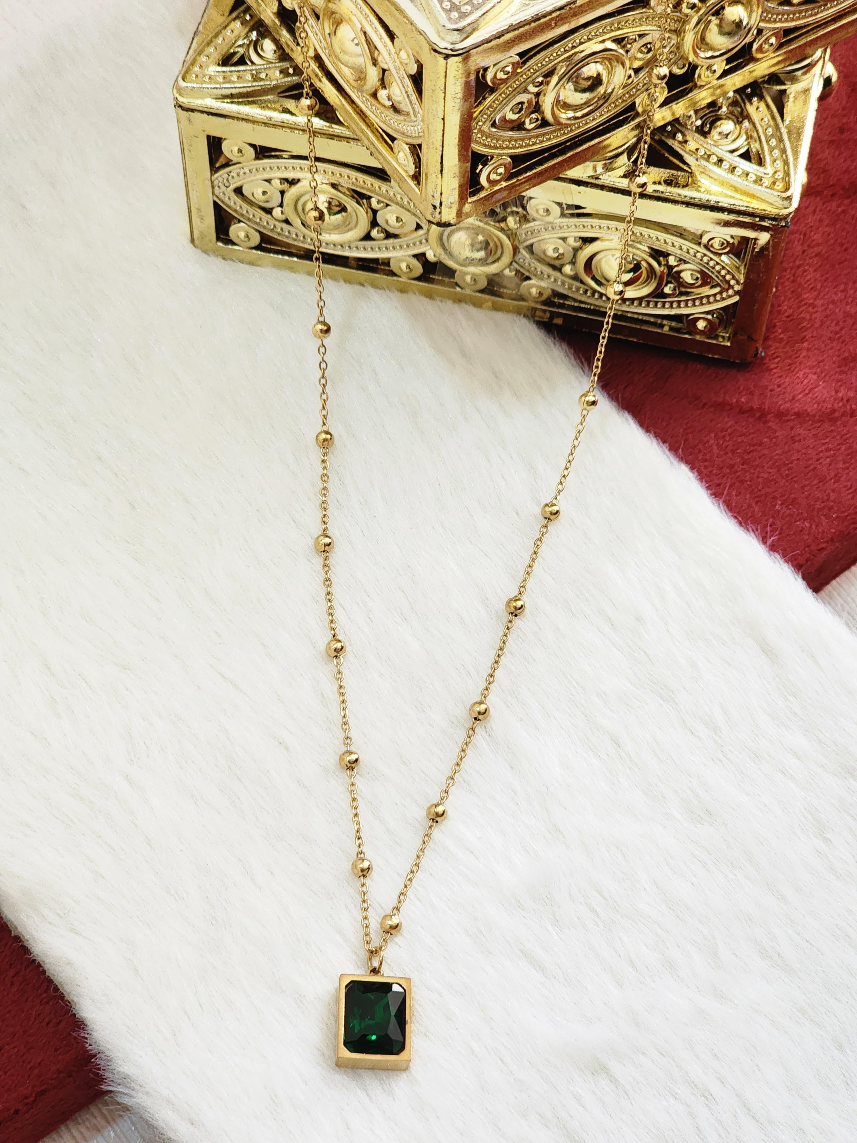 The centerpiece of this necklace is a captivating emerald-cut green cubic zirconia, set within a minimalistic 18K gold-plated bezel frame, exuding vintage allure with a modern twist. The deep green hue symbolizes sophistication and renewal, making this necklace an ideal choice for both daytime elegance and evening glamour.