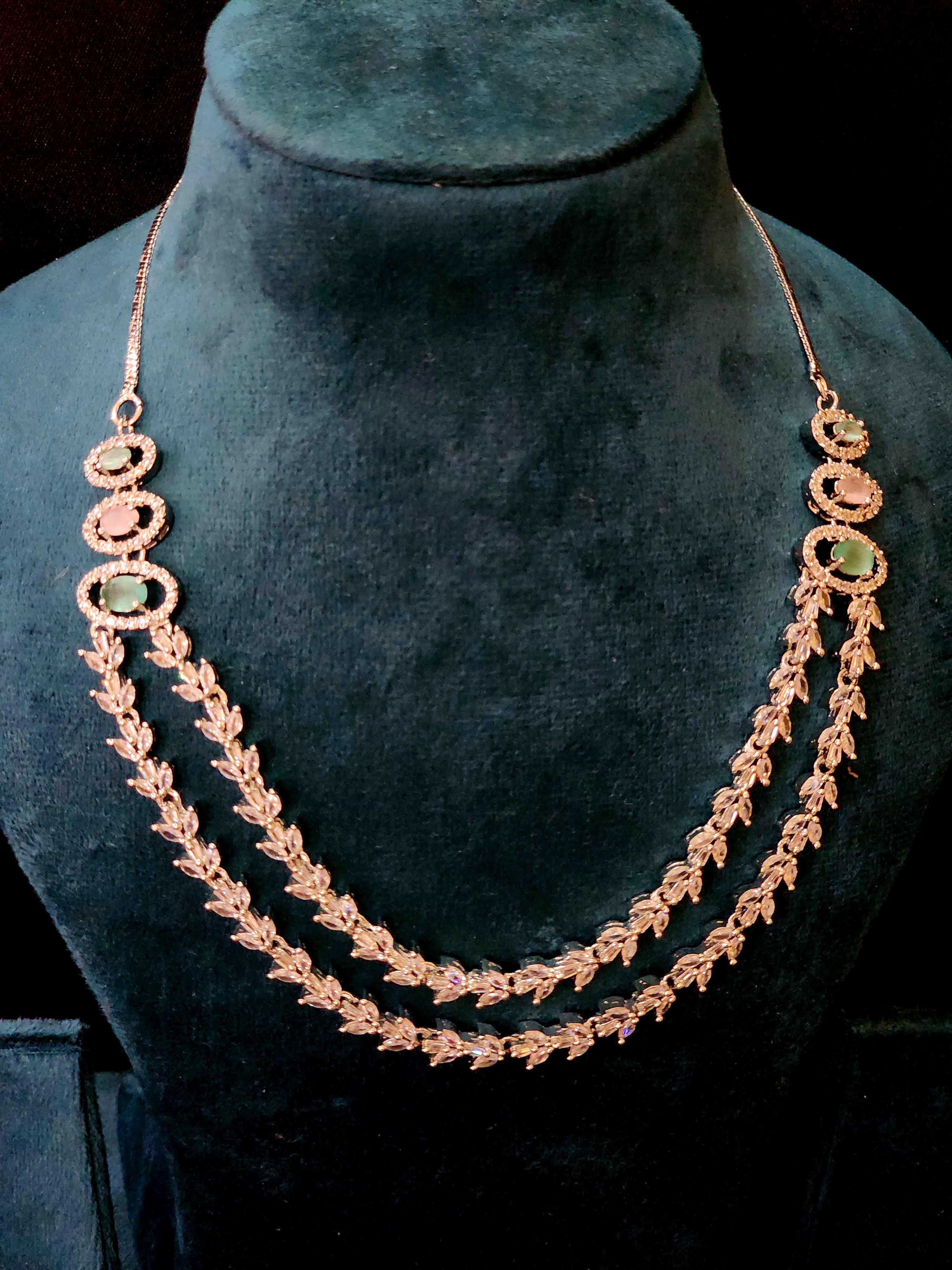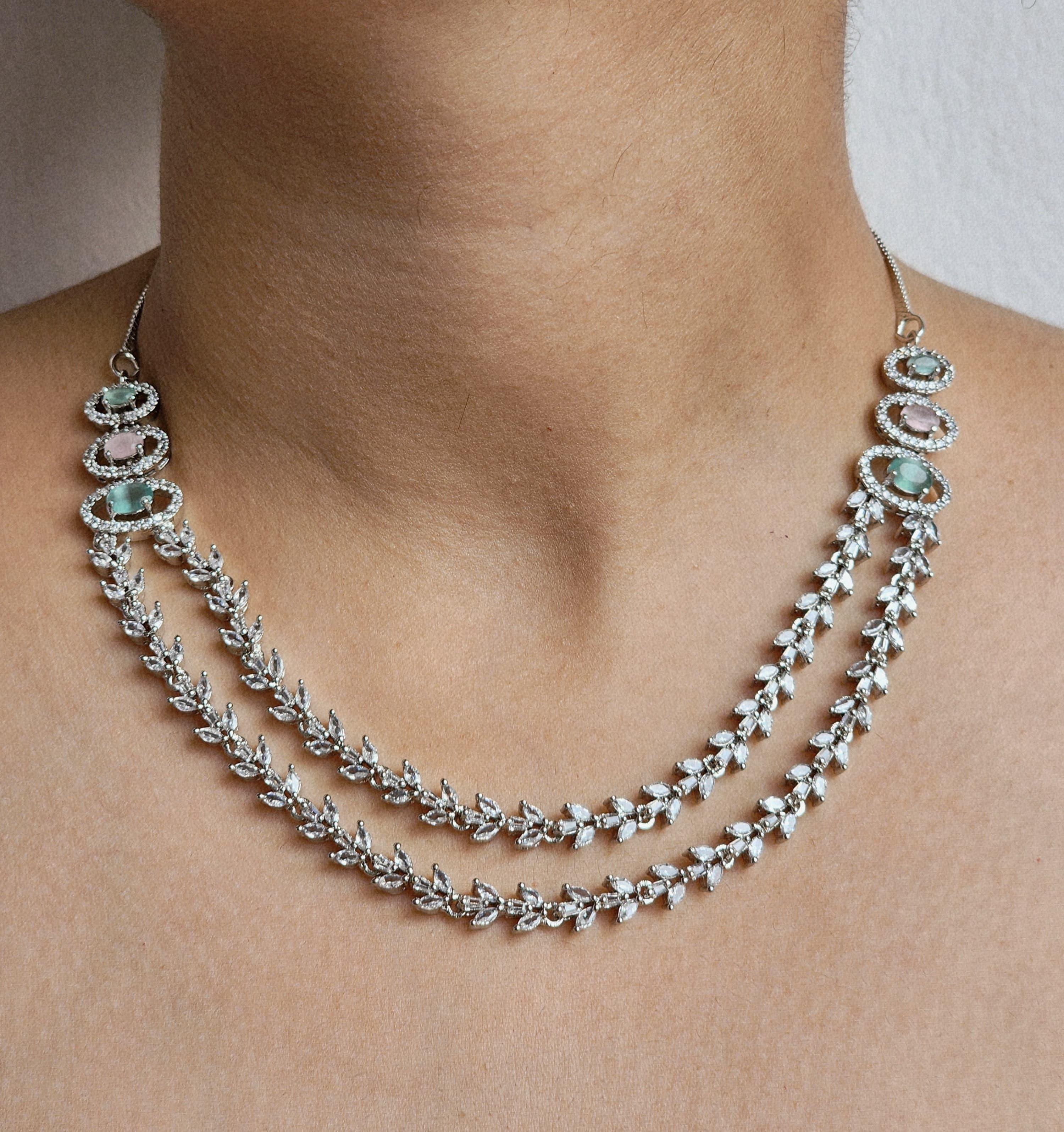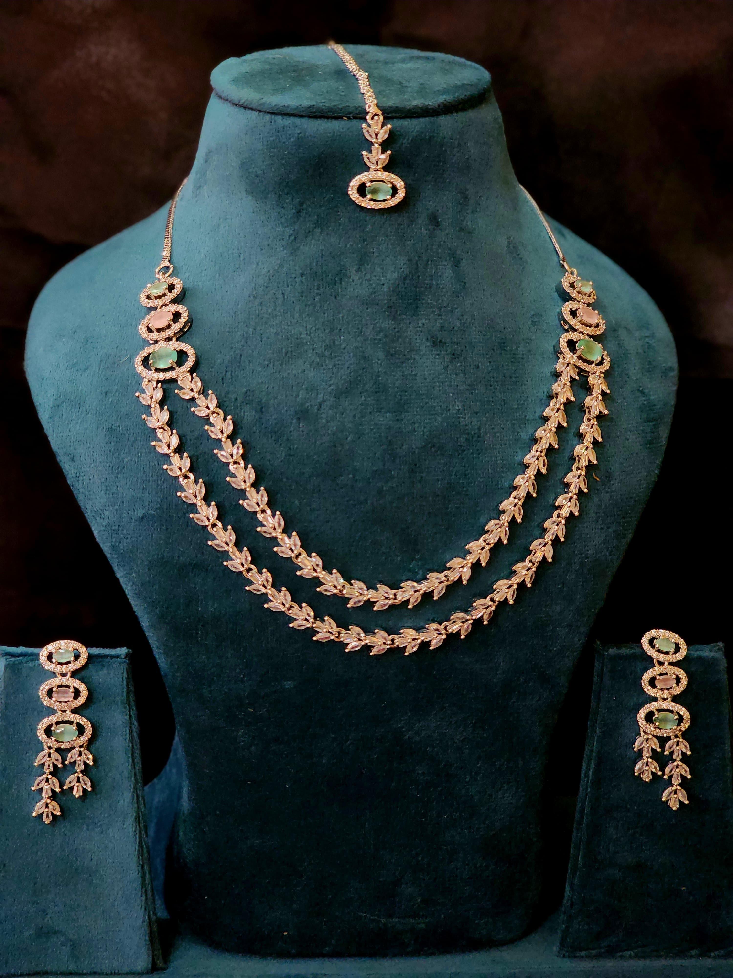 Designed to exude regal sophistication, the twin-layered necklace adds depth and drama to your neckline, while the leafy details lend an ethereal, nature-inspired finish. The coordinated accessories complete the set with an air of polished elegance.