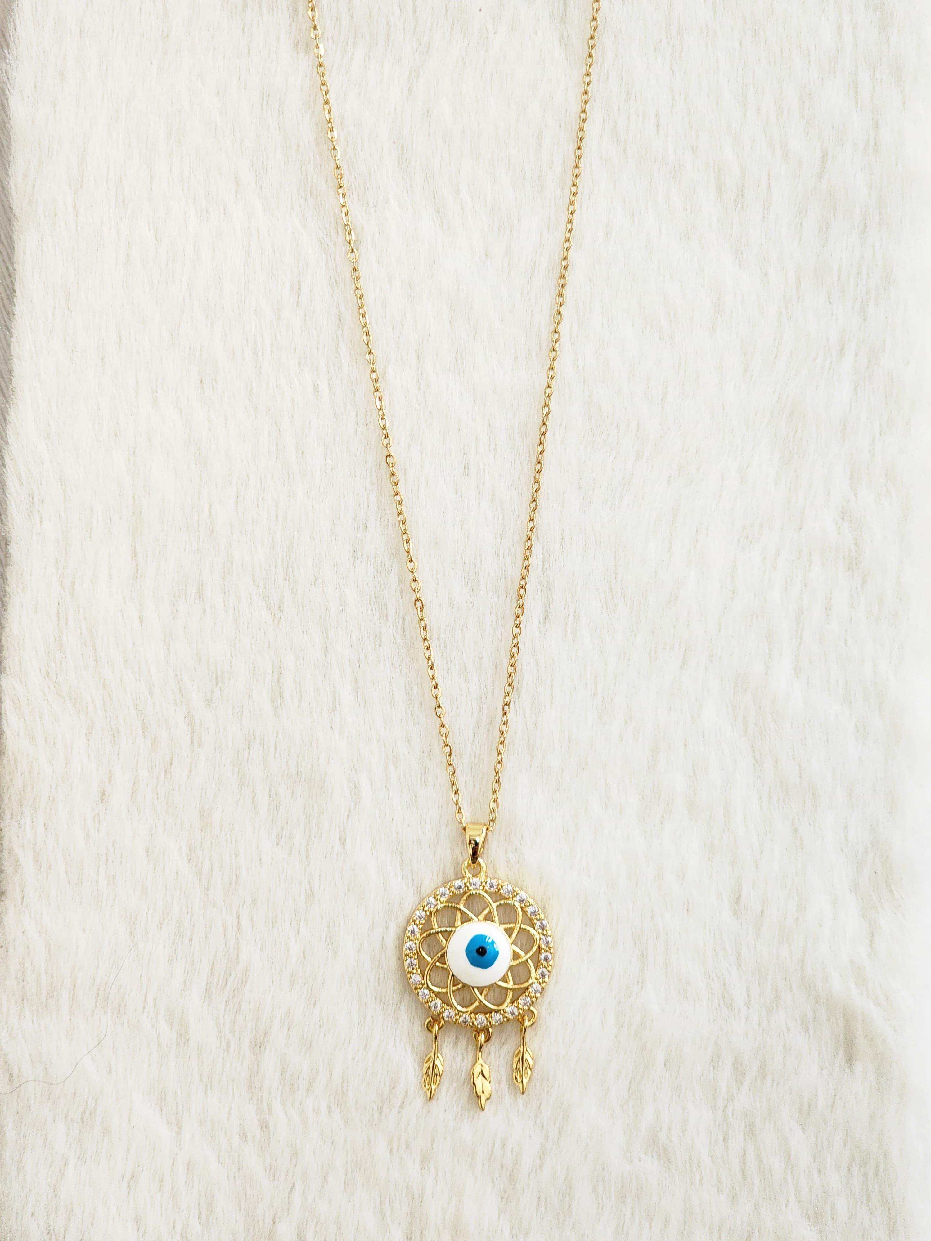 Infused with symbolism and style, the Luxe Aabhushan's Evil Eye Dreamcatcher Pendant Necklace is a modern talisman designed to protect and inspire. At its heart lies a striking blue evil eye charm, renowned across cultures as a symbol of protection against negativity. It’s beautifully encased in a gold-tone filigree dreamcatcher frame, which is intricately adorned with glittering cubic zirconia stones for a radiant finish.