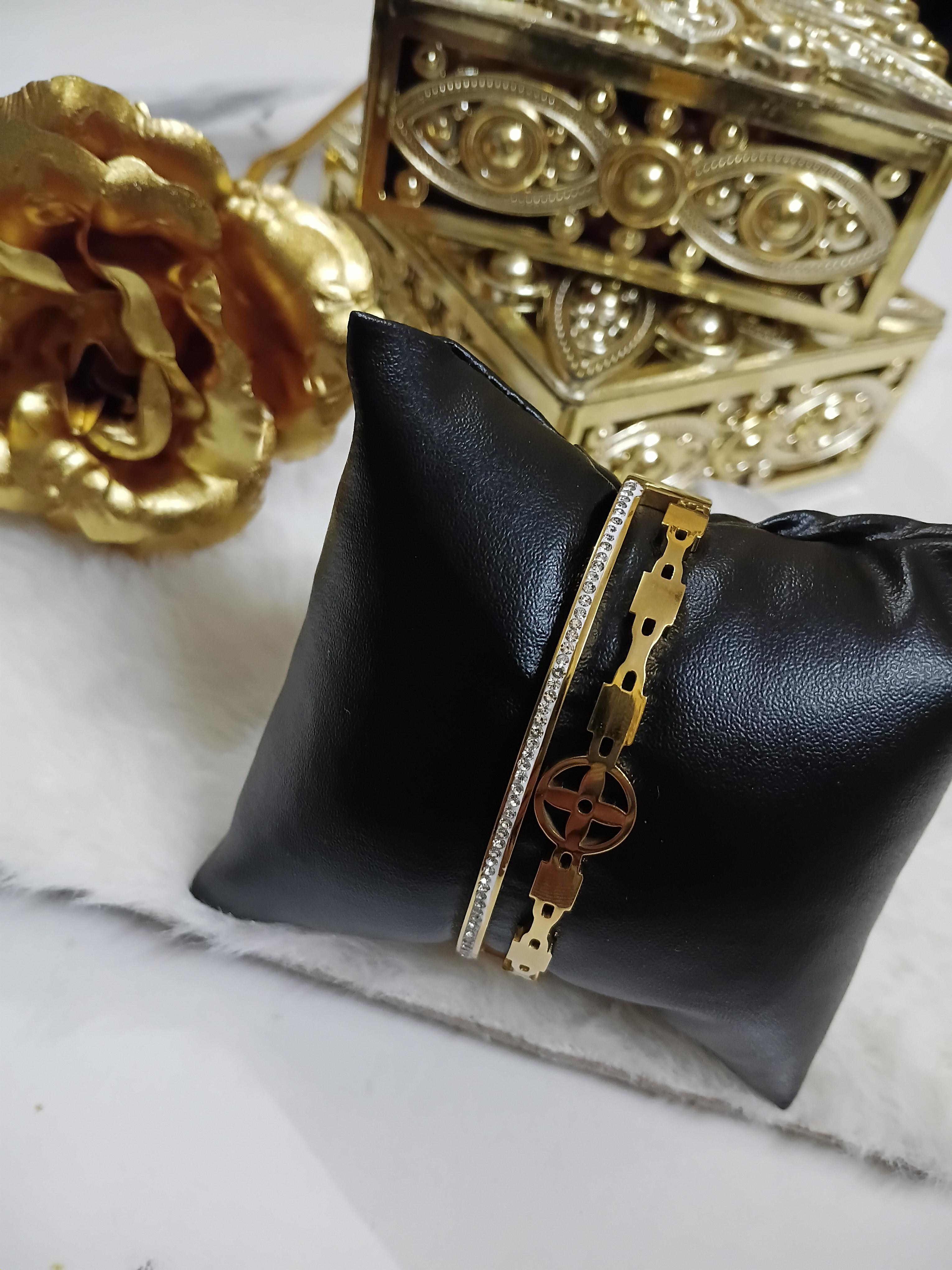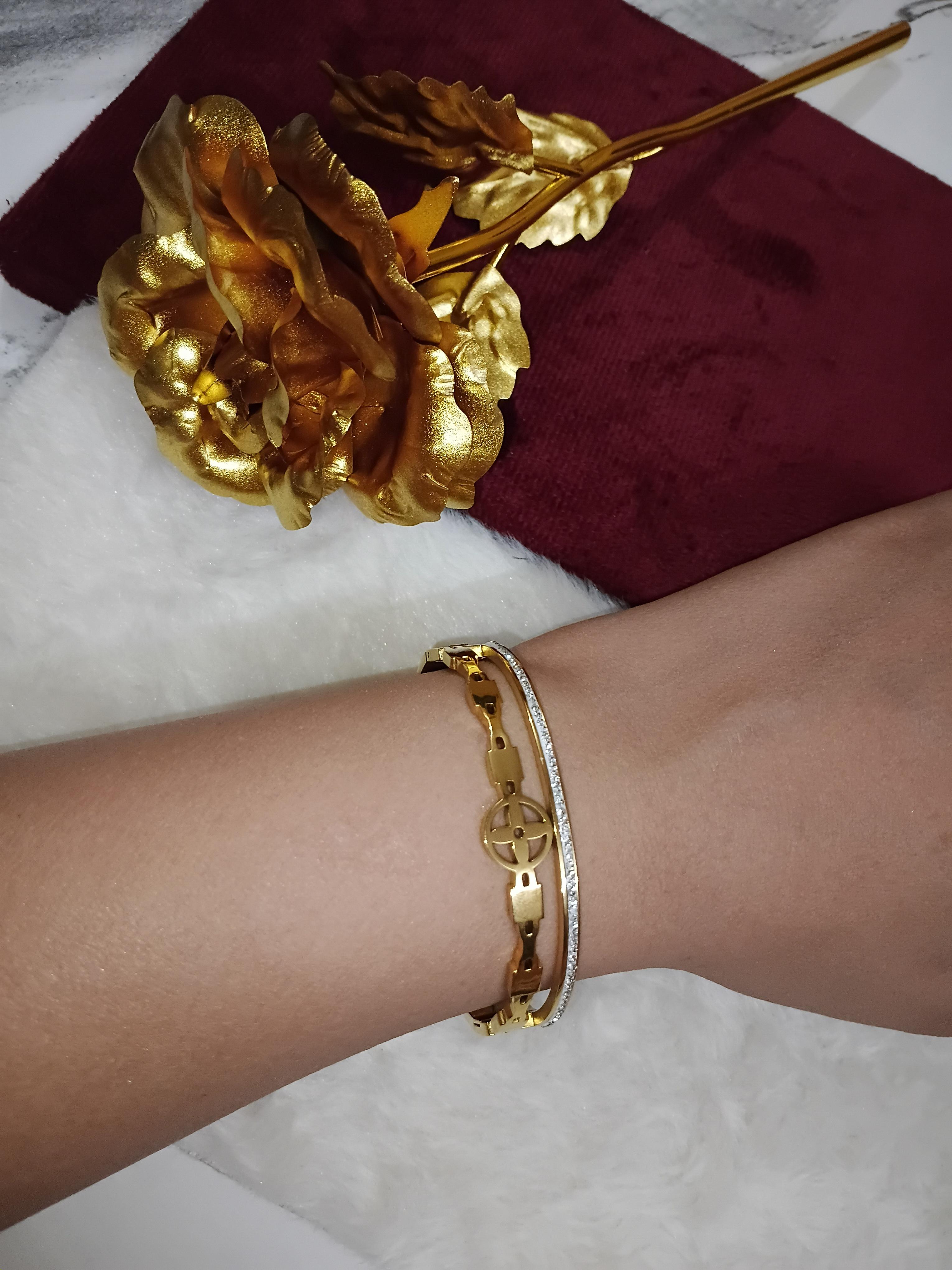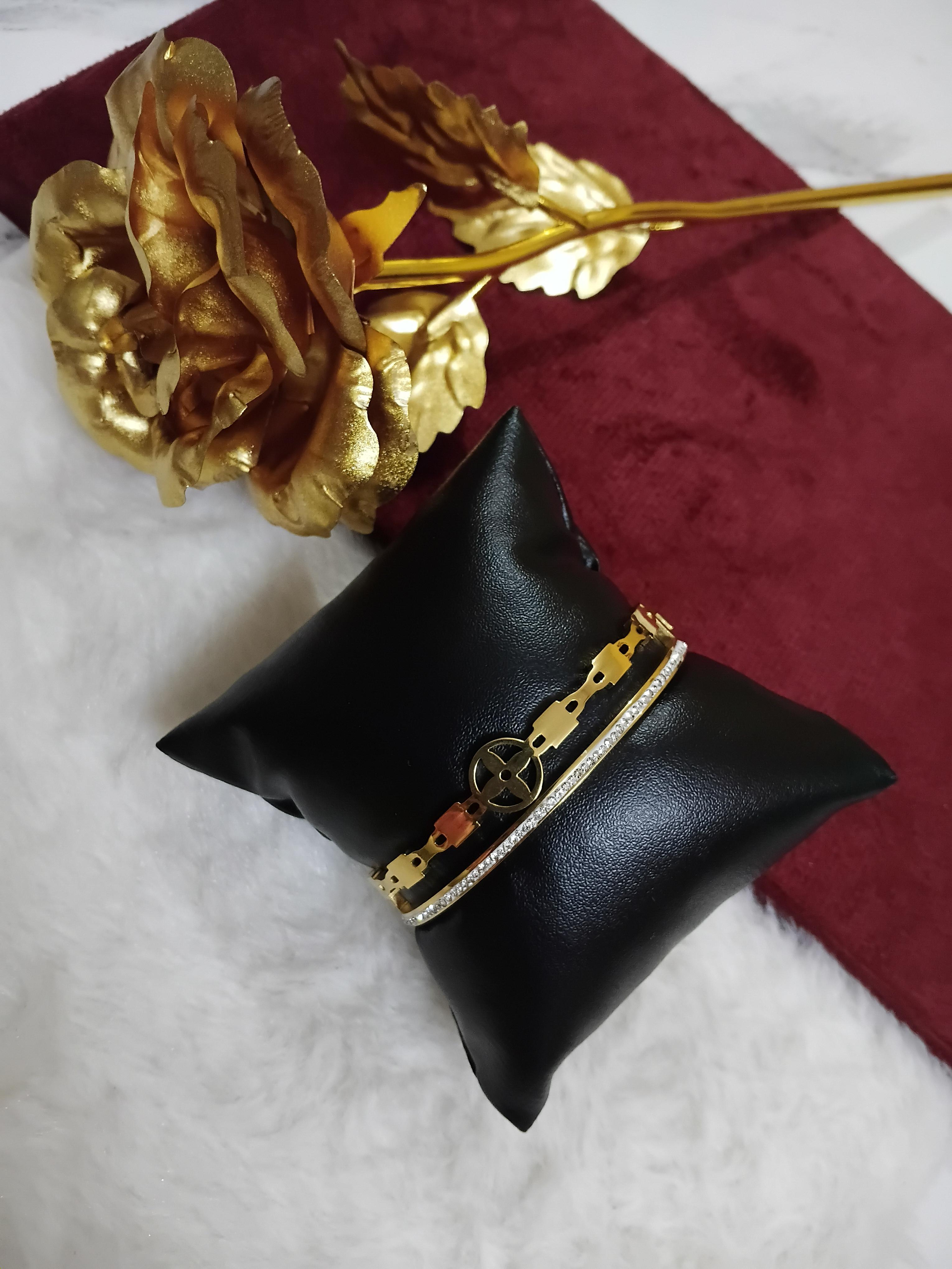 BraceletsMaterial used - A solid 22k Gold Plating Bangle, Oxidation, High Quality Stainless Steel, Cubic zirconia White Crystal Stones Set, High Polish, Classic Corporate wear, Anti Tarnish, Anti Rust, Oxidation, Discoloration & Corrosion - Resistant Metal, Waterproof, Hypoallergenic, Durable