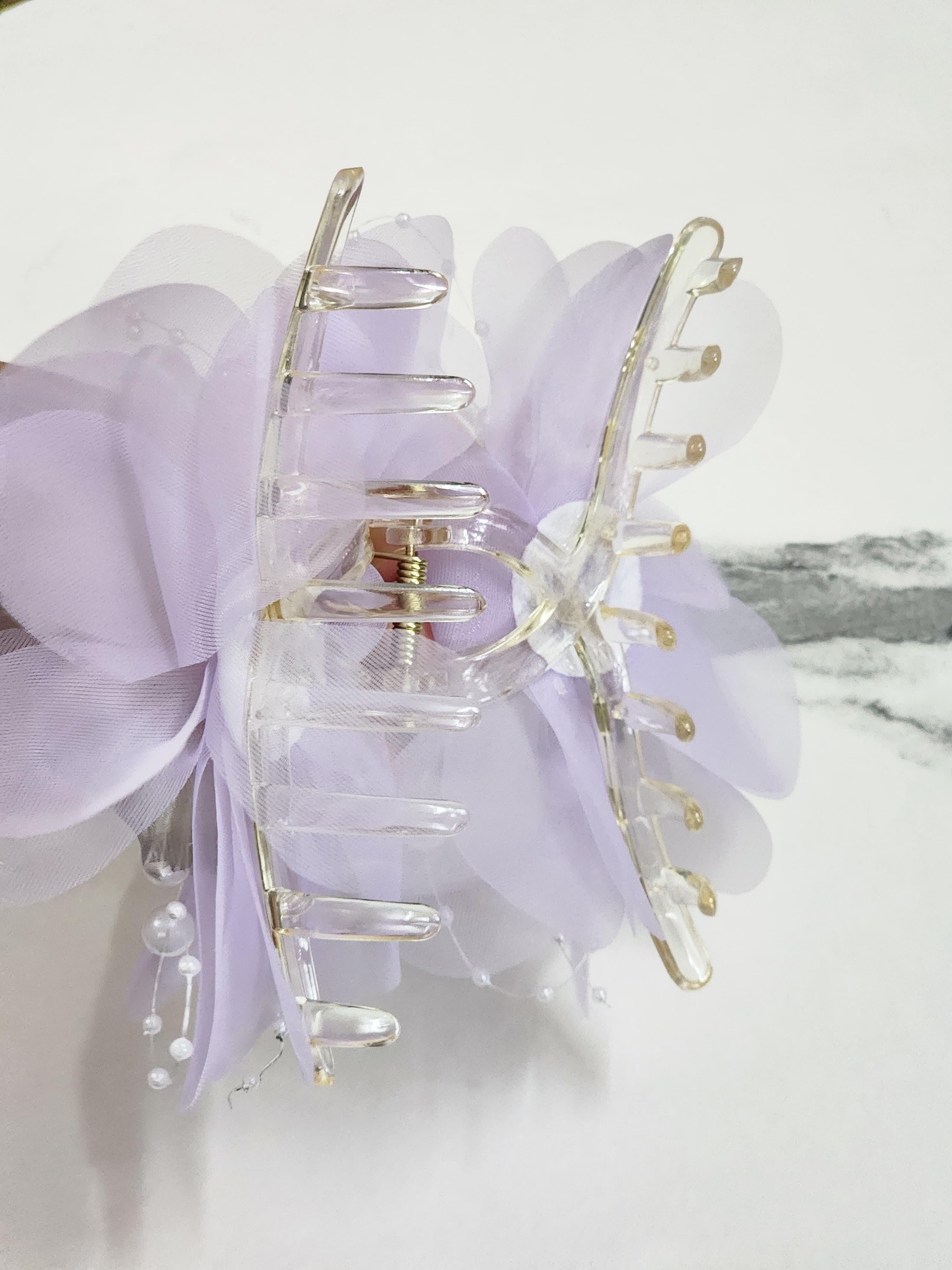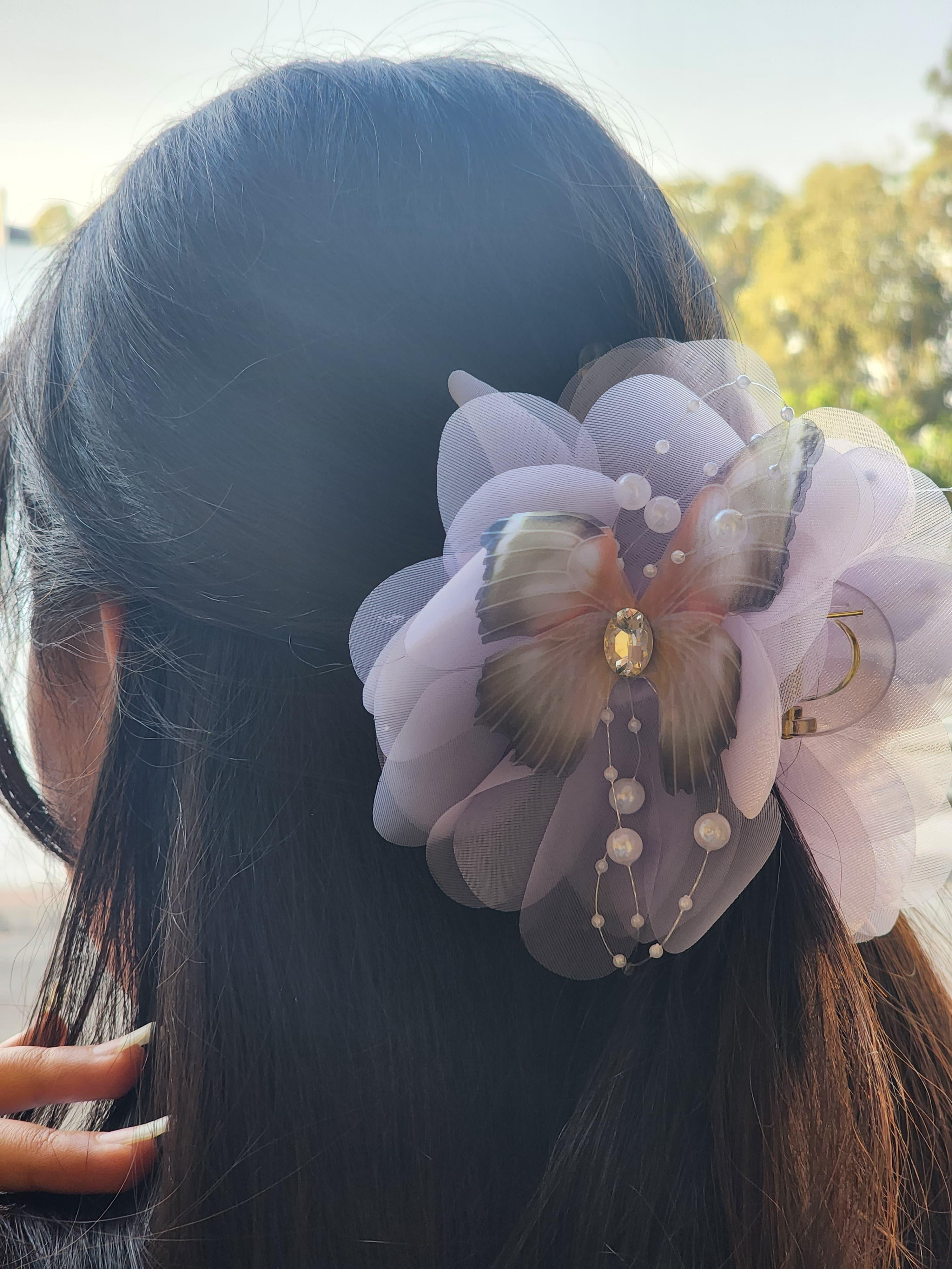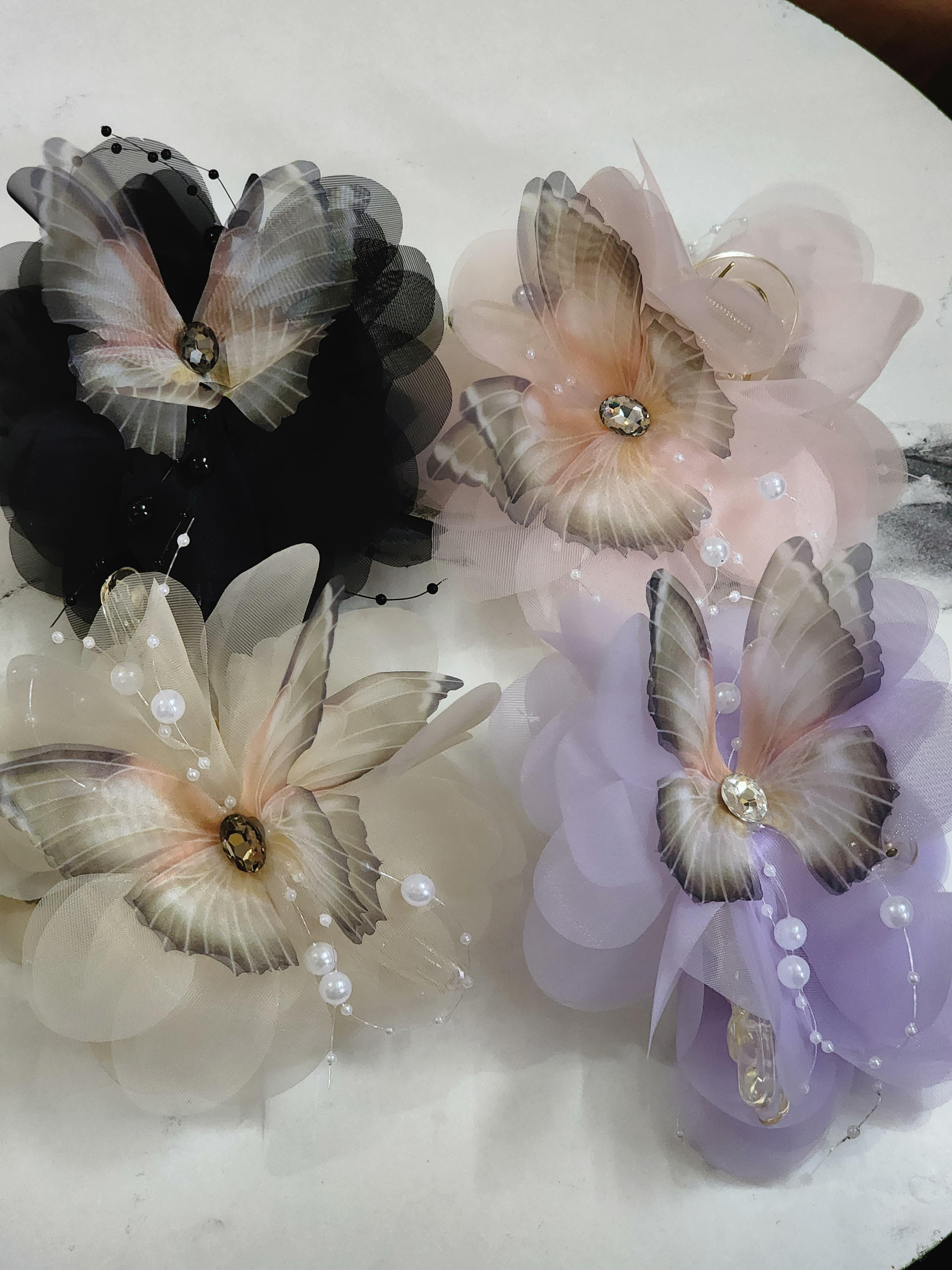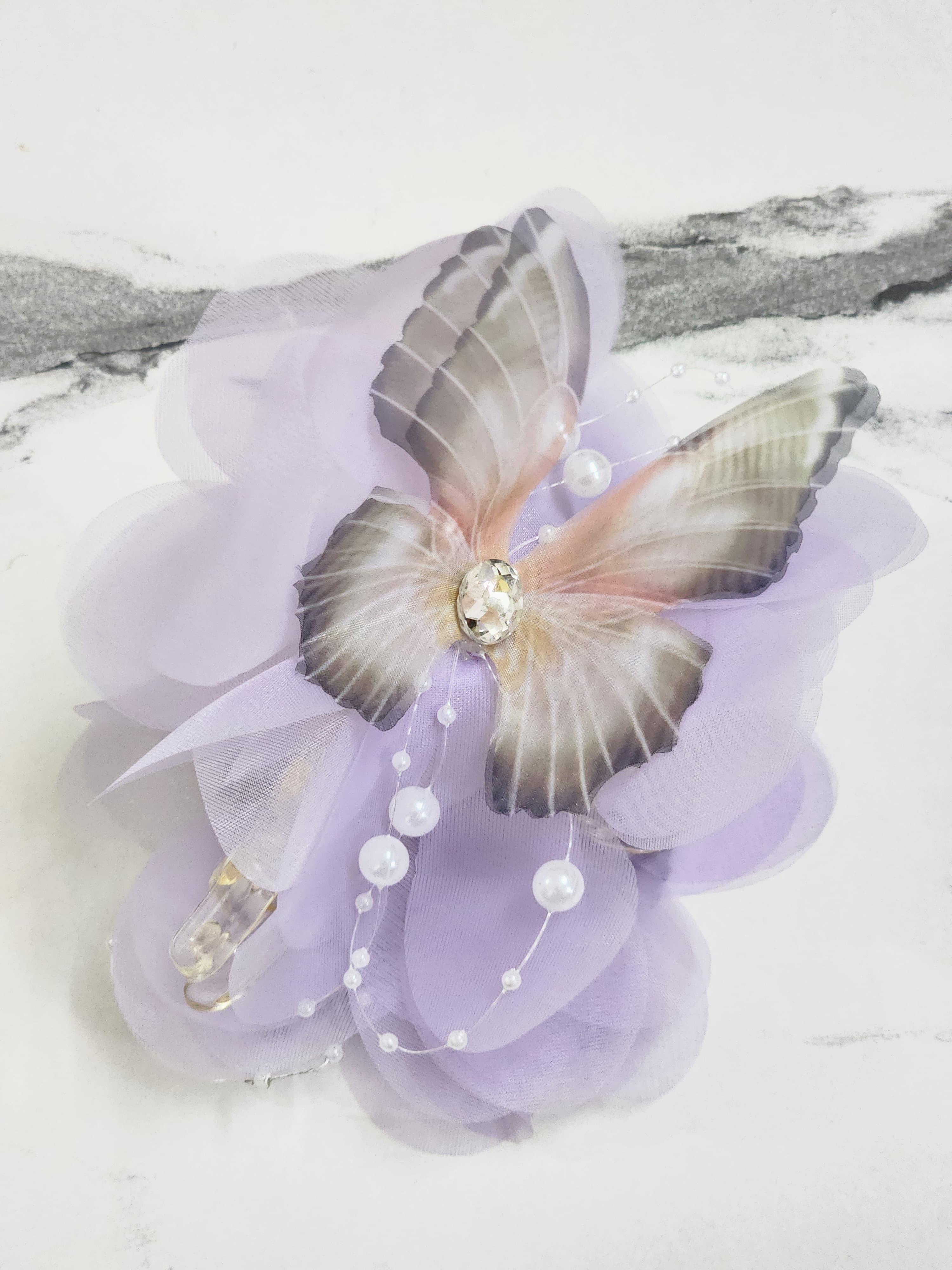 *Material: Sheer organza petals, digitally printed mesh butterfly, premium clear stone centerpiece, synthetic pearls, and decorative wire.