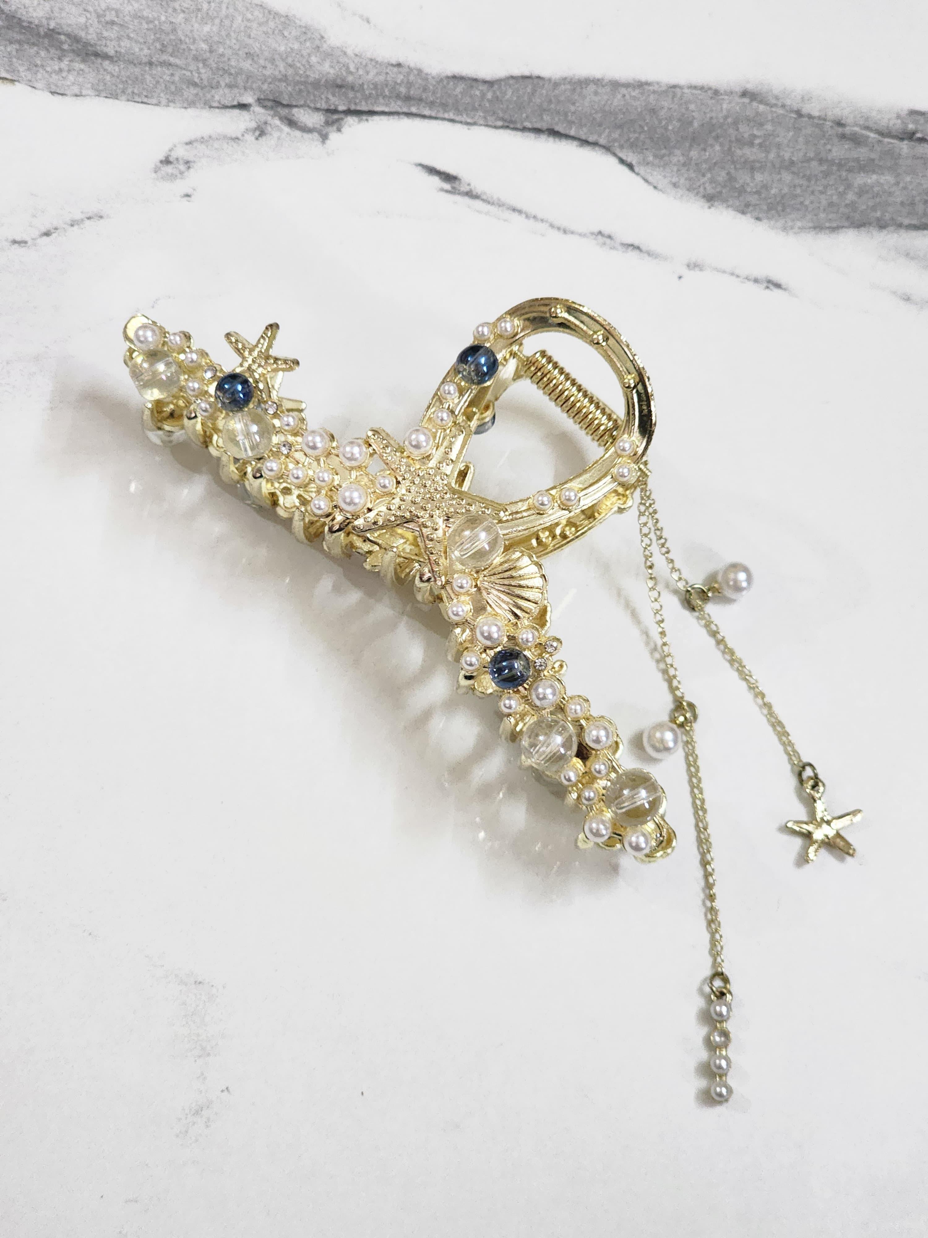 The clutcher features an intricately detailed structure adorned with miniature starfish, scallop shell motifs, and an exquisite combination of luminous faux pearls, translucent beads, and deep sapphire-toned crystal embellishments. Two delicate gold-toned chains cascade from one side, accented with a dangling starfish charm and a line of pearls—adding graceful movement and a touch of whimsy to your look.