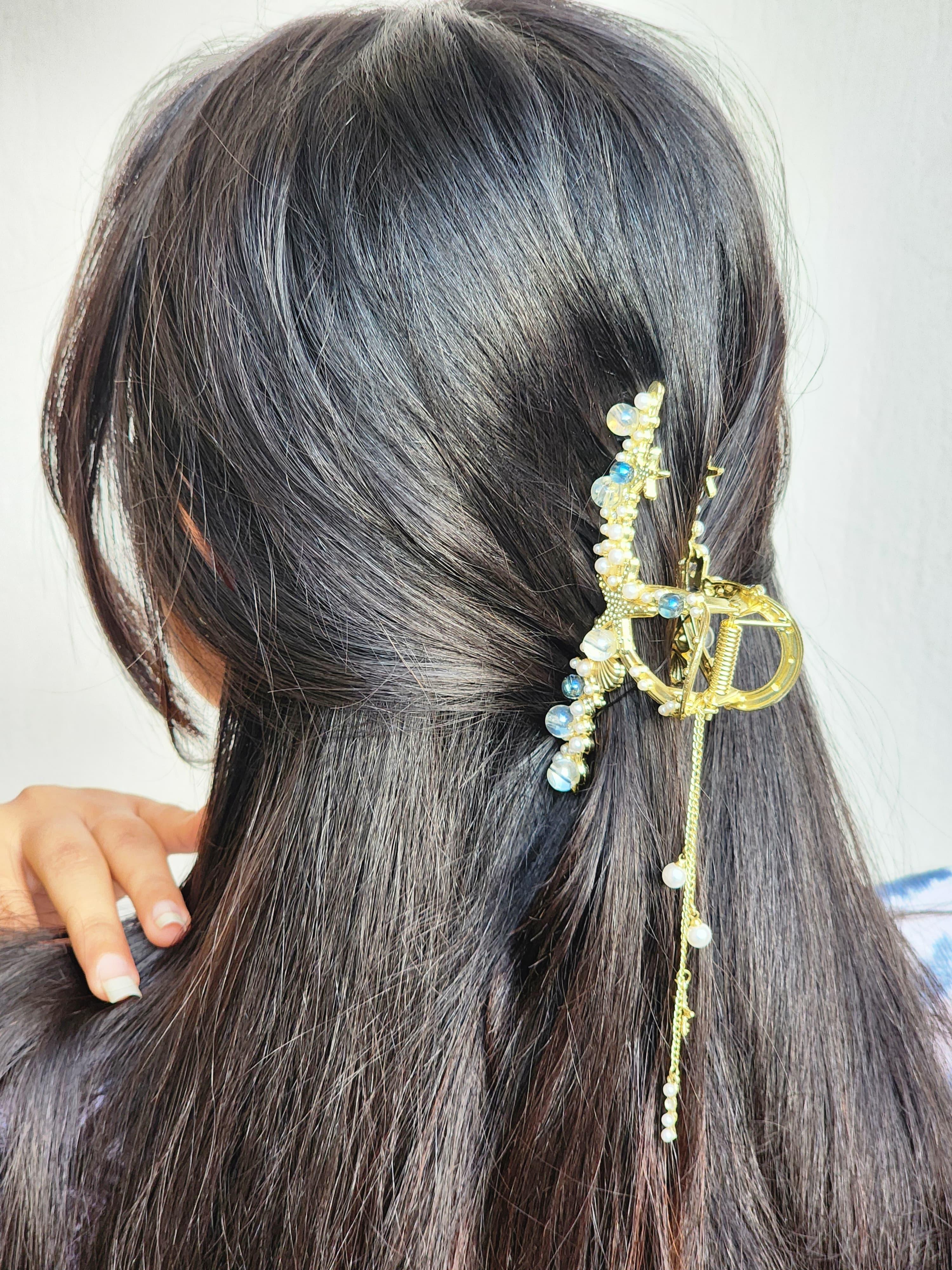 Elevate your hairstyle with the Oceanic Elegance Starfish Pearl Hair Clutcher by Luxe Aabhushan, a statement accessory inspired by the serenity and splendor of the sea. Meticulously crafted from high-quality gold-toned alloy, this luxe hair accessory embodies coastal charm with an opulent twist.