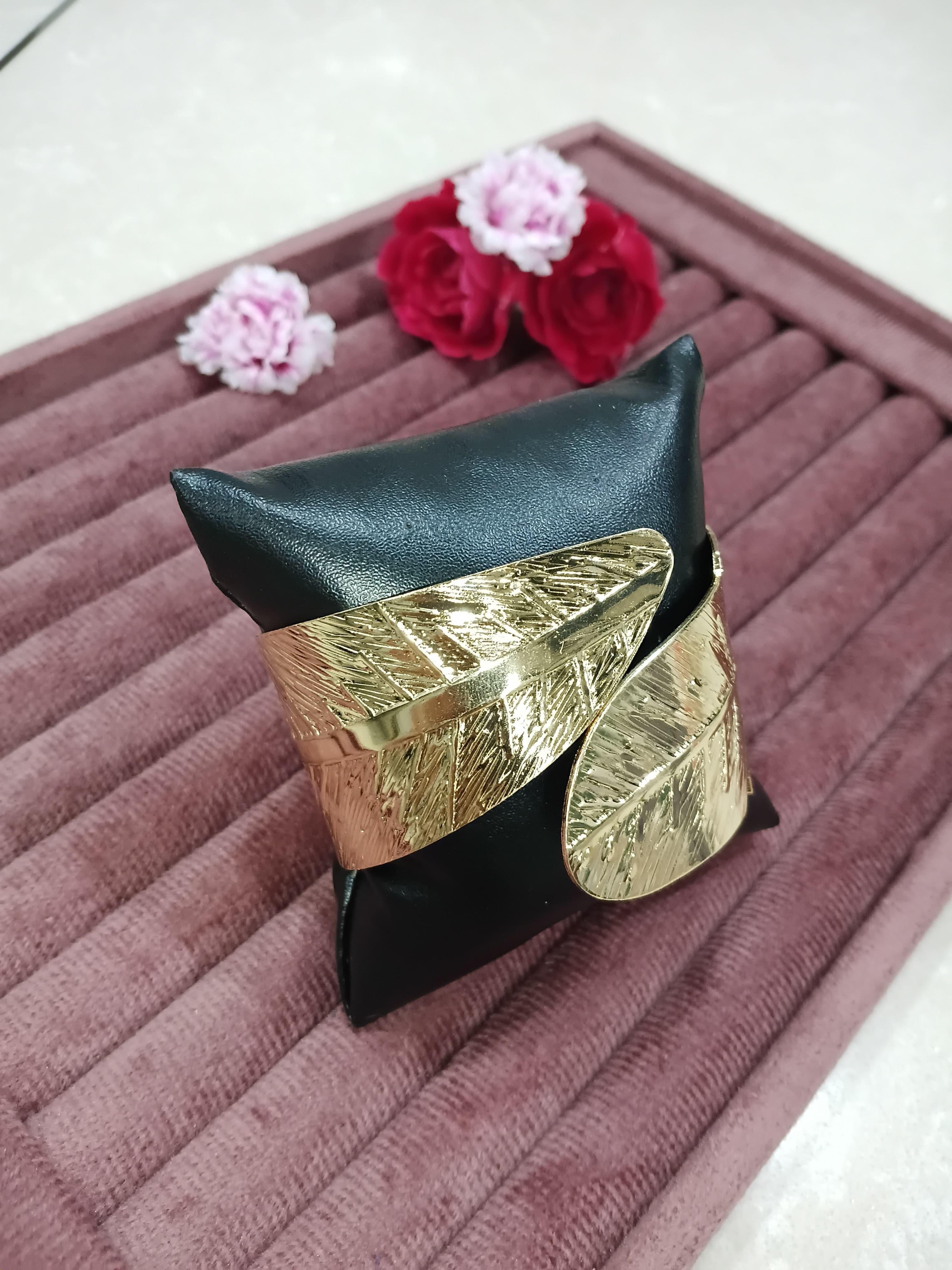 Crafted from a premium alloy with 22K gold mirror-finish plating, the bracelet brings a radiant warmth to your ensemble, whether paired with an elegant saree, a flowing gown, or Indo-western silhouettes. The open-front design and contoured shape allow for a comfortable, adjustable fit.