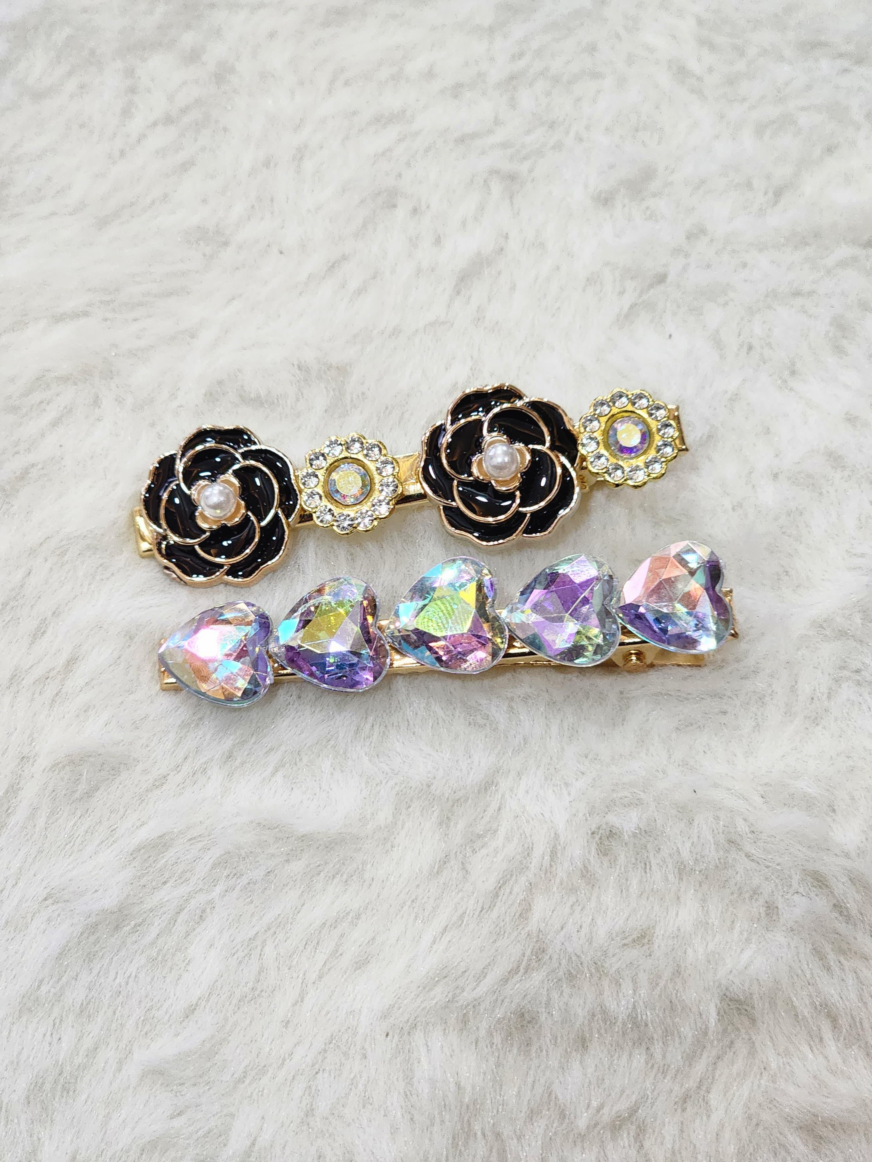 Crafted for elegance, this set of two clips showcases black enamel roses with pearl centers, framed by radiant gold accents and dripping with teardrop glass crystals. Sophistication with a hint of romance.