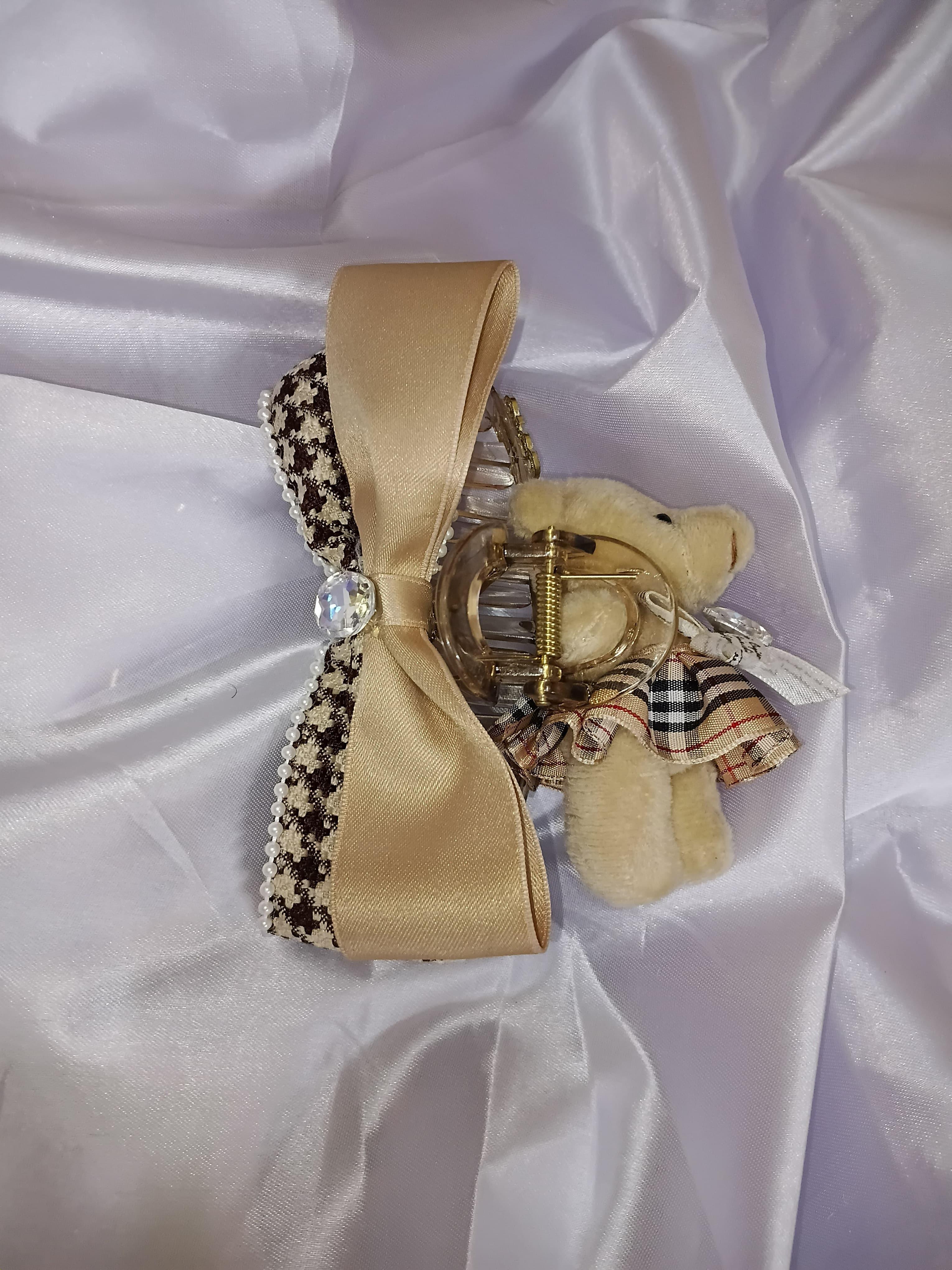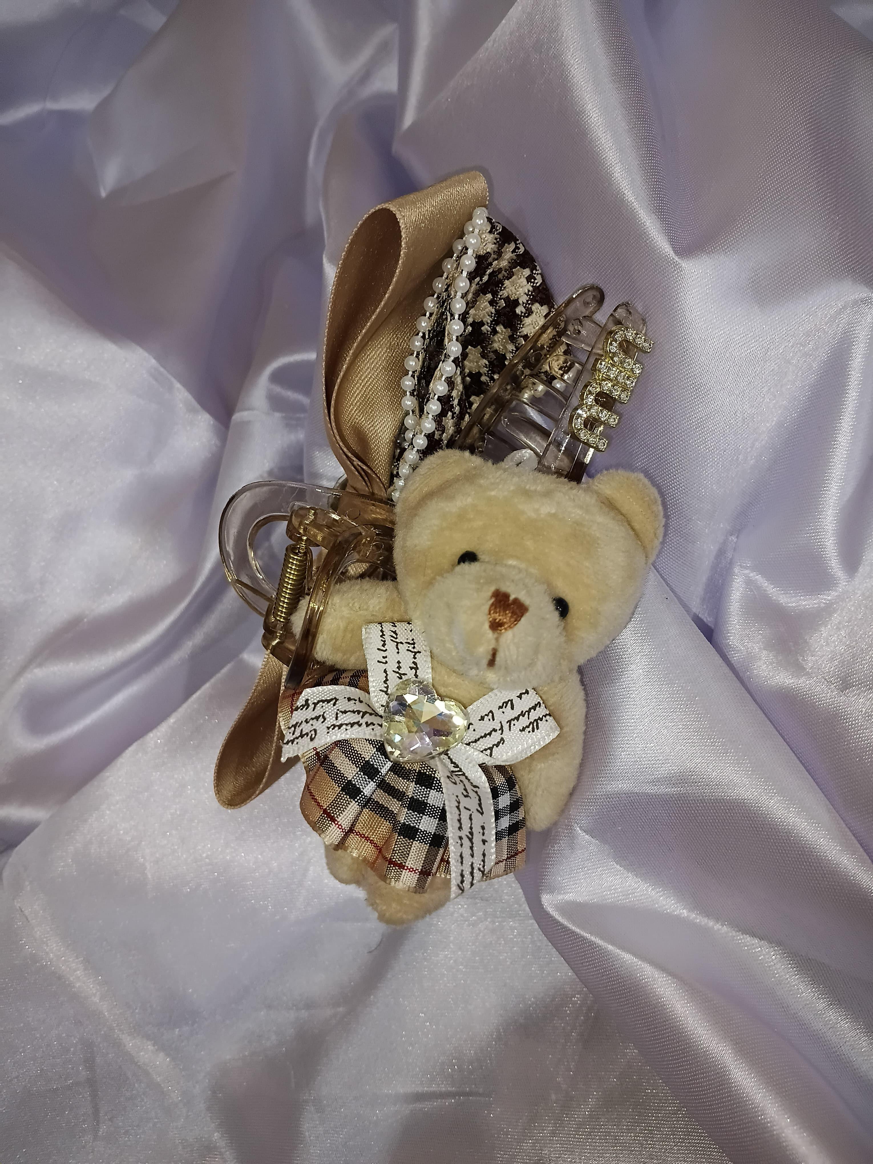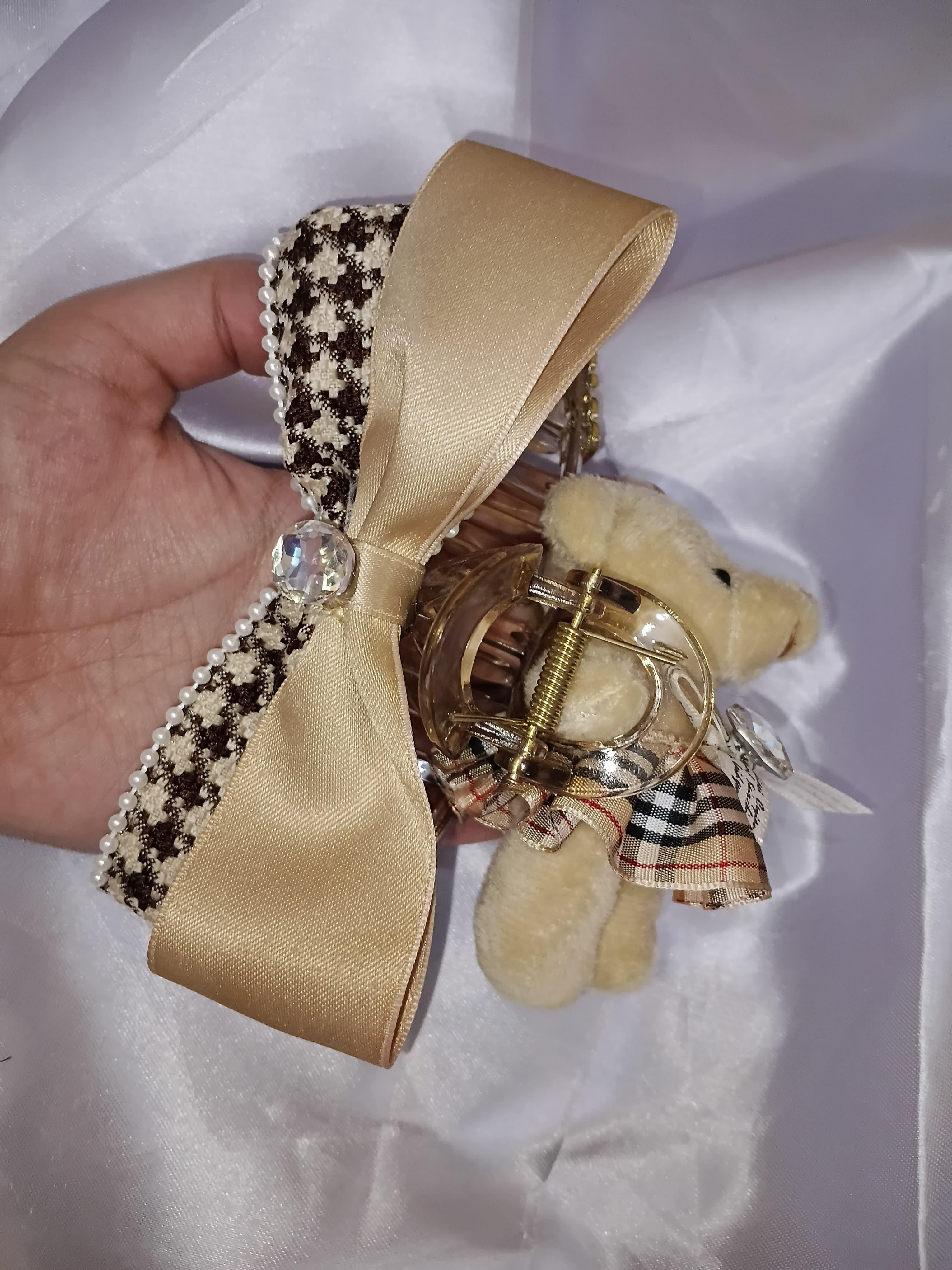 *Design Details: The Royal Teddy – Gold Edition is a charming mix of childhood nostalgia and luxurious fashion. A cuddly beige teddy dressed in a plaid cotton skirt and printed grosgrain bow sits gracefully on a gold-accented acrylic clutcher. A satin ribbon fold adds elegance, while pearls and crystal embellishments provide a glamorous Luxe Aabhushan finish.