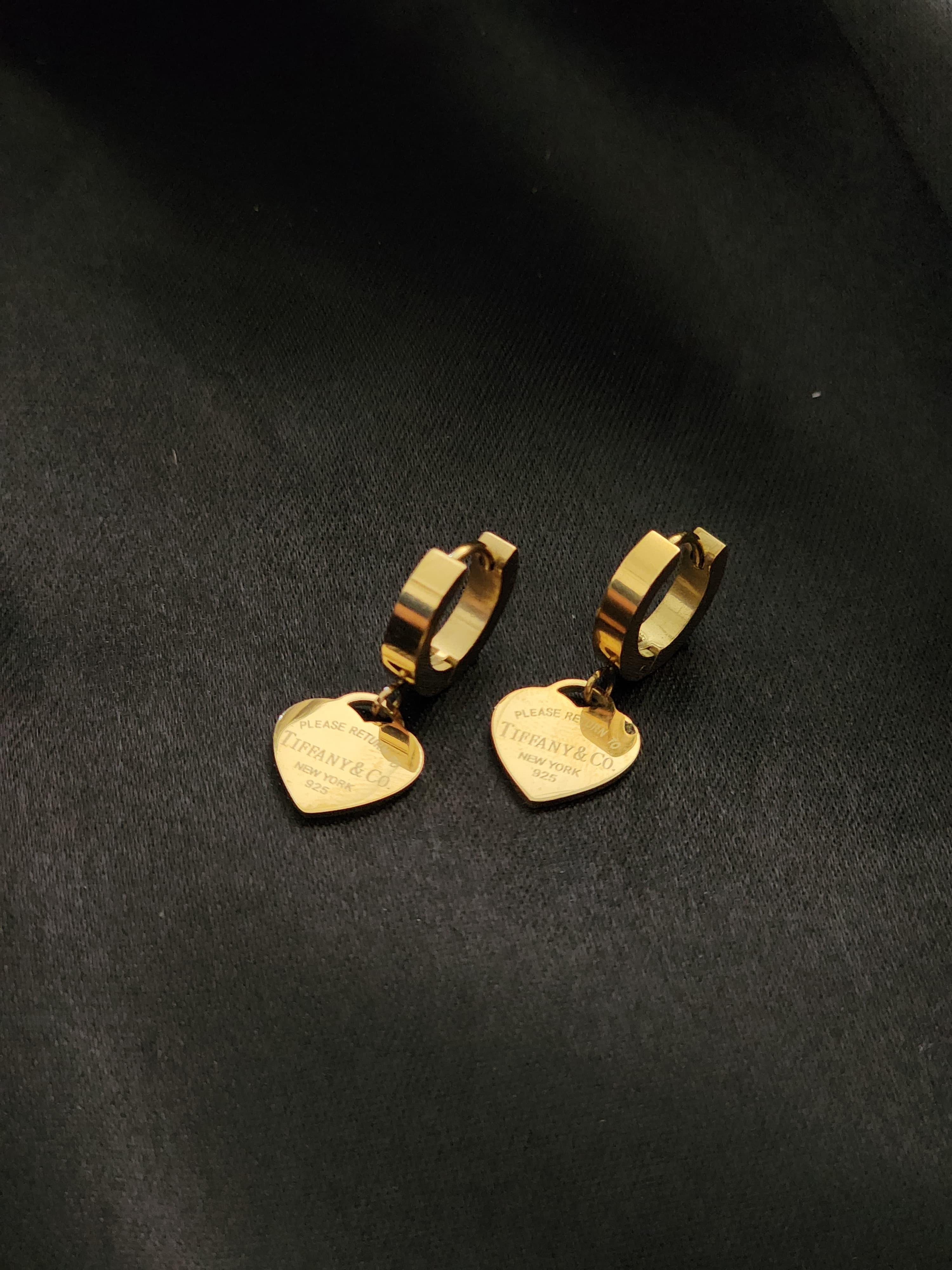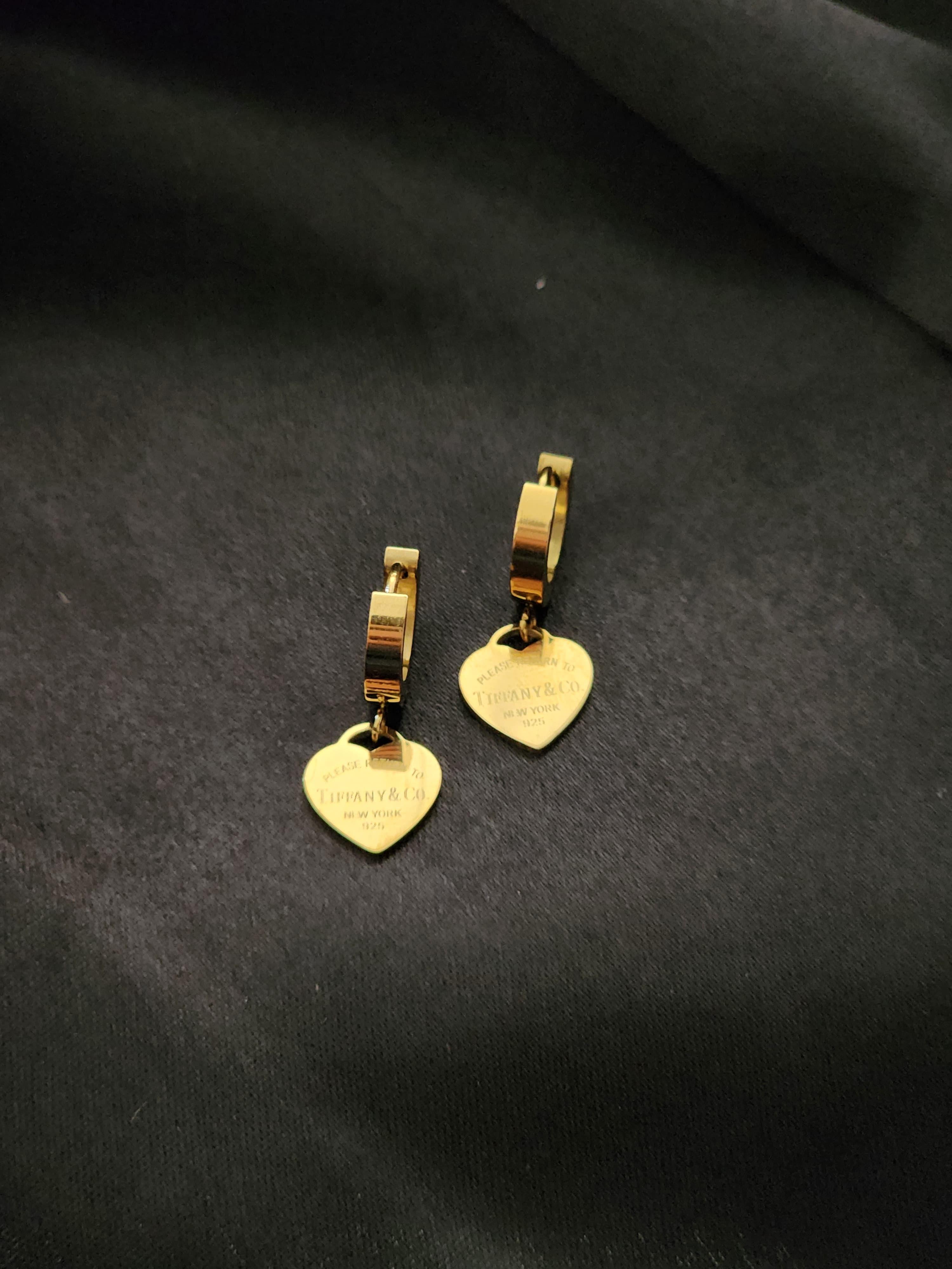 Add a touch of classic luxury to your look with these Tiffany & Co. inspired dangle earrings. Featuring a gleaming gold-tone finish and a signature heart-shaped charm engraved with Please Return to Tiffany & Co. New York 925, these earrings evoke timeless elegance. The sleek, textured hoop adds a modern twist to this iconic design, making it a perfect accessory for both everyday wear and special occasions