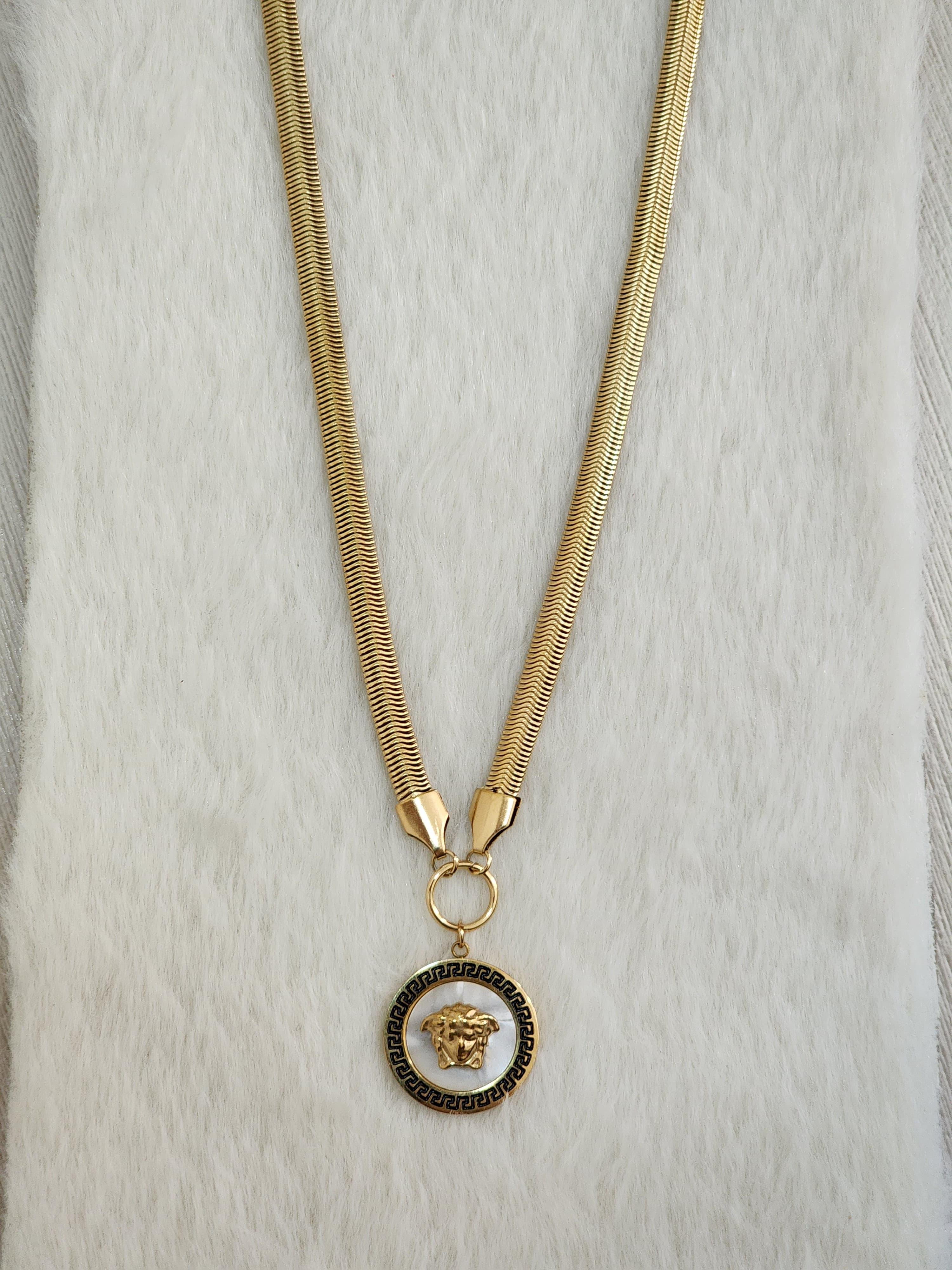 At the heart of this commanding necklace is a striking Medusa head pendant, encased in a polished circular medallion bordered with black enamel and Greco-Roman motifs, symbolizing strength, allure, and timeless elegance. Inspired by classical design, this piece is a tribute to fearless femininity.