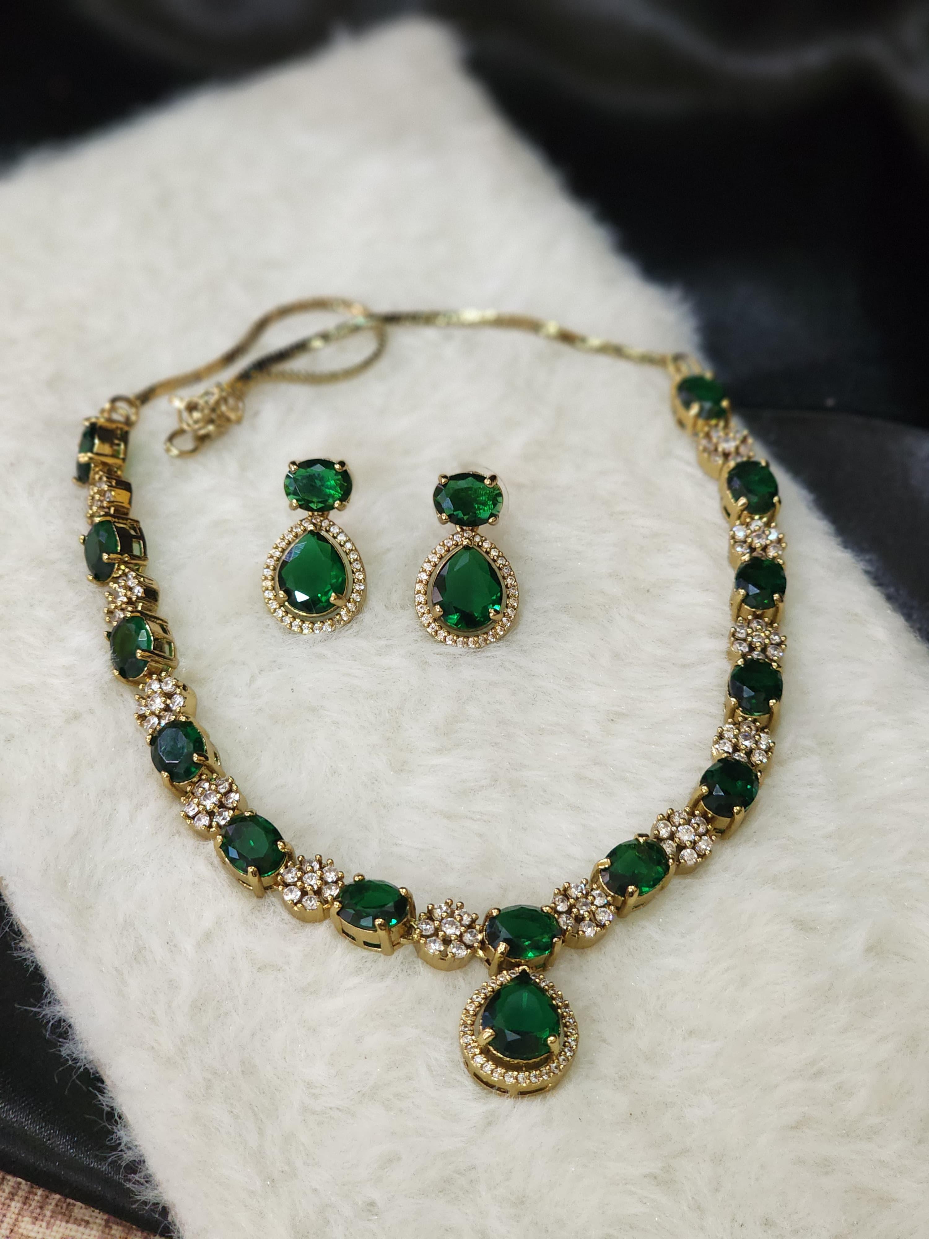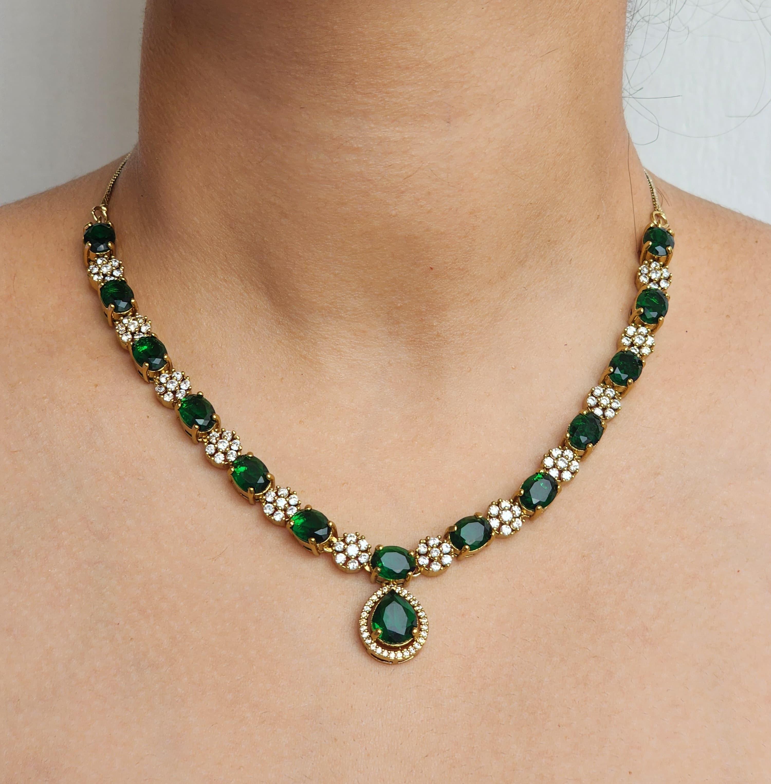The necklace showcases a stunning sequence of deep emerald green oval-cut stones alternated with floral clusters of American diamonds, all set on a radiant gold-toned base. The centerpiece, a drop-shaped emerald stone bordered by a halo of shimmering crystals, adds a classic focal point. The matching earrings reflect the same design, combining a regal silhouette with impeccable shine, offering a perfectly coordinated look.