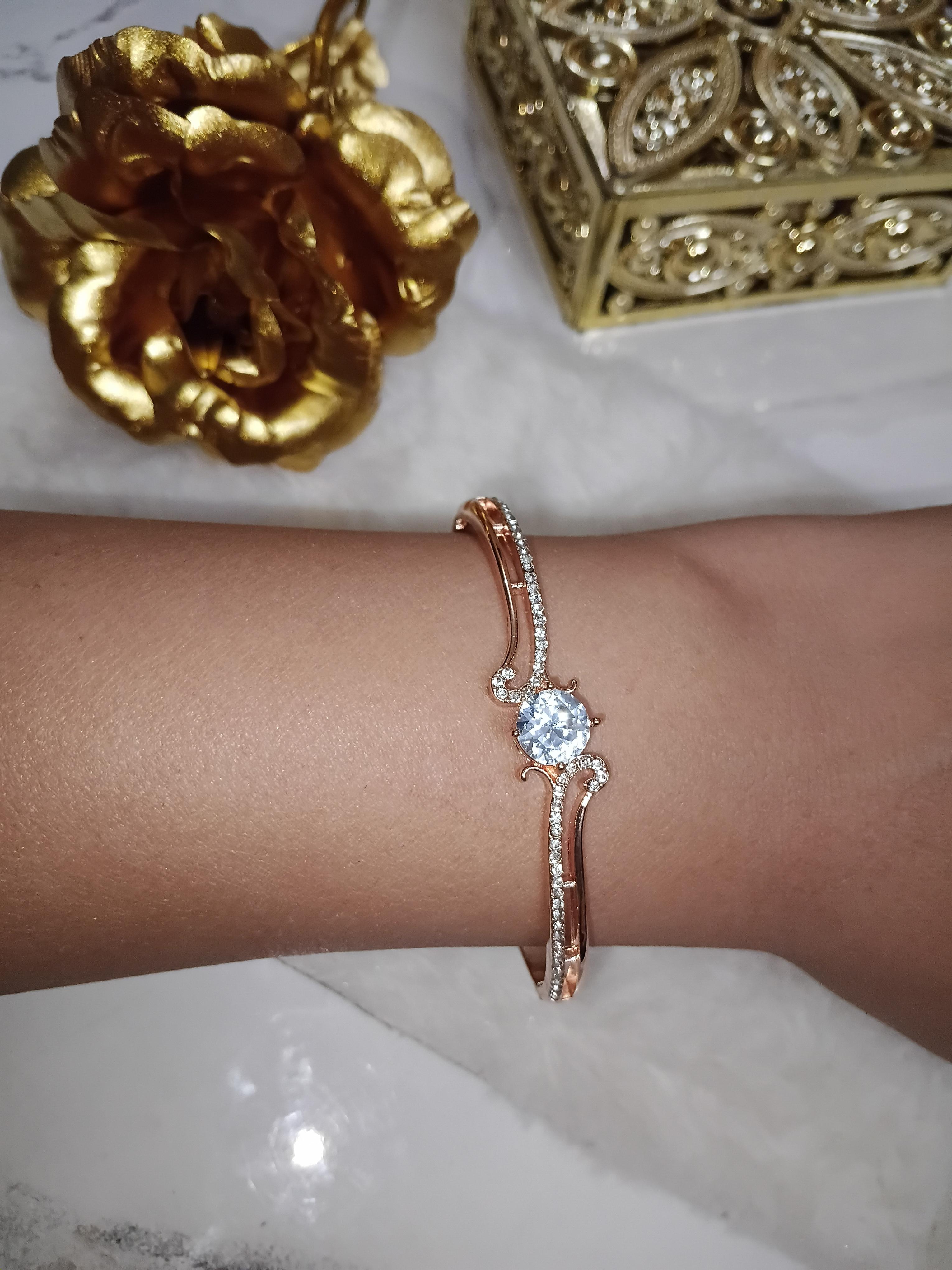 BraceletsMaterial used - Elevate your style with the Rose Gold Plated American Diamond Bracelet. Featuring a beautiful rose gold plating and shimmering American diamonds, this bracelet adds a touch of elegance to any outfit. The magnetic lock ensures a secure fit, while the addition of pearls adds a classic and timeless element.