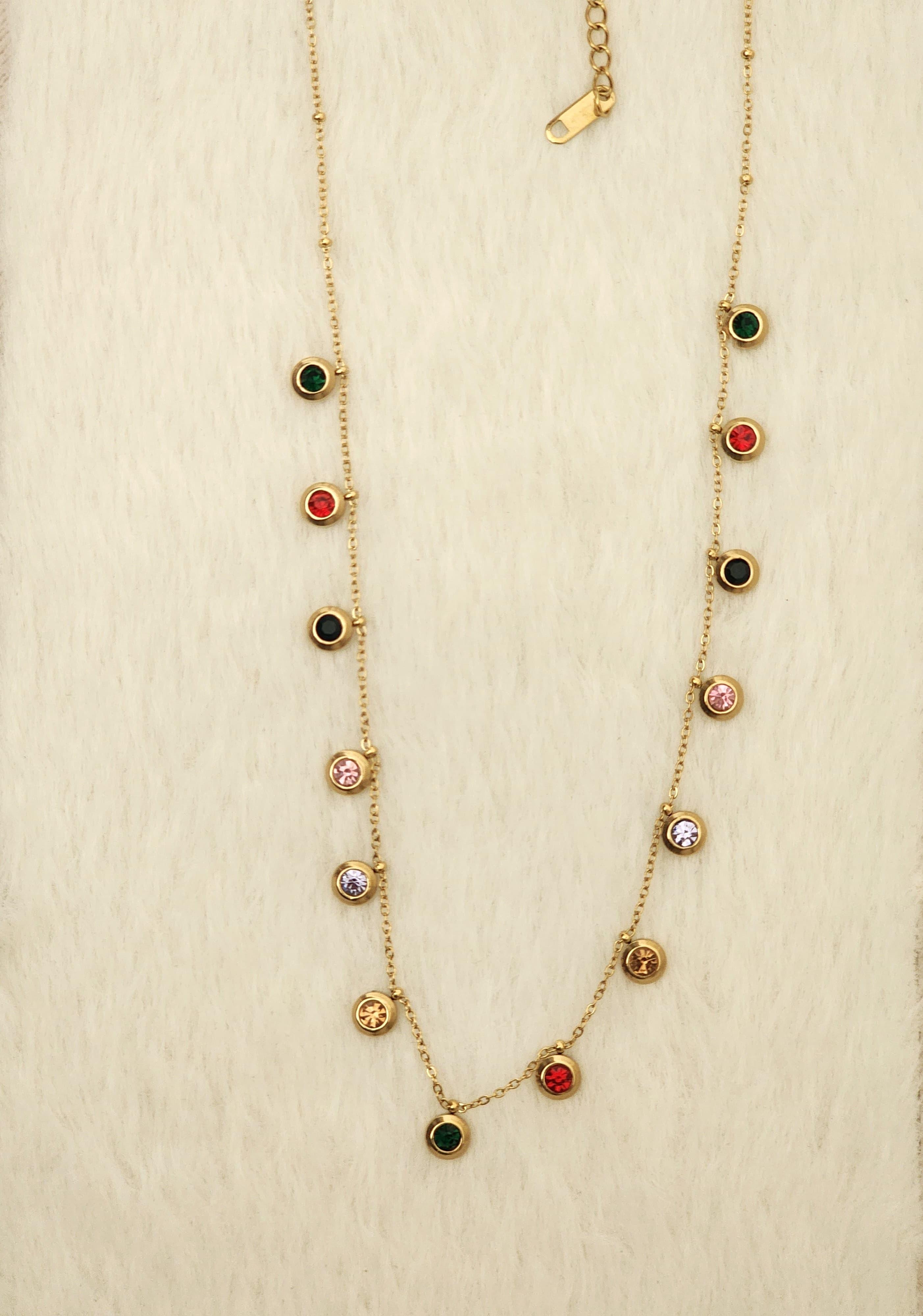 Delicate, vibrant, and full of charm — the Celestia Multi-Gem Drop Necklace from Luxe Abhushan is an ode to playful elegance. Crafted in high-quality gold-plated stainless steel, this refined piece features an array of bezel-set multicolored cubic zirconia stones, including emerald green, ruby red, blush pink, jet black, and violet hues.