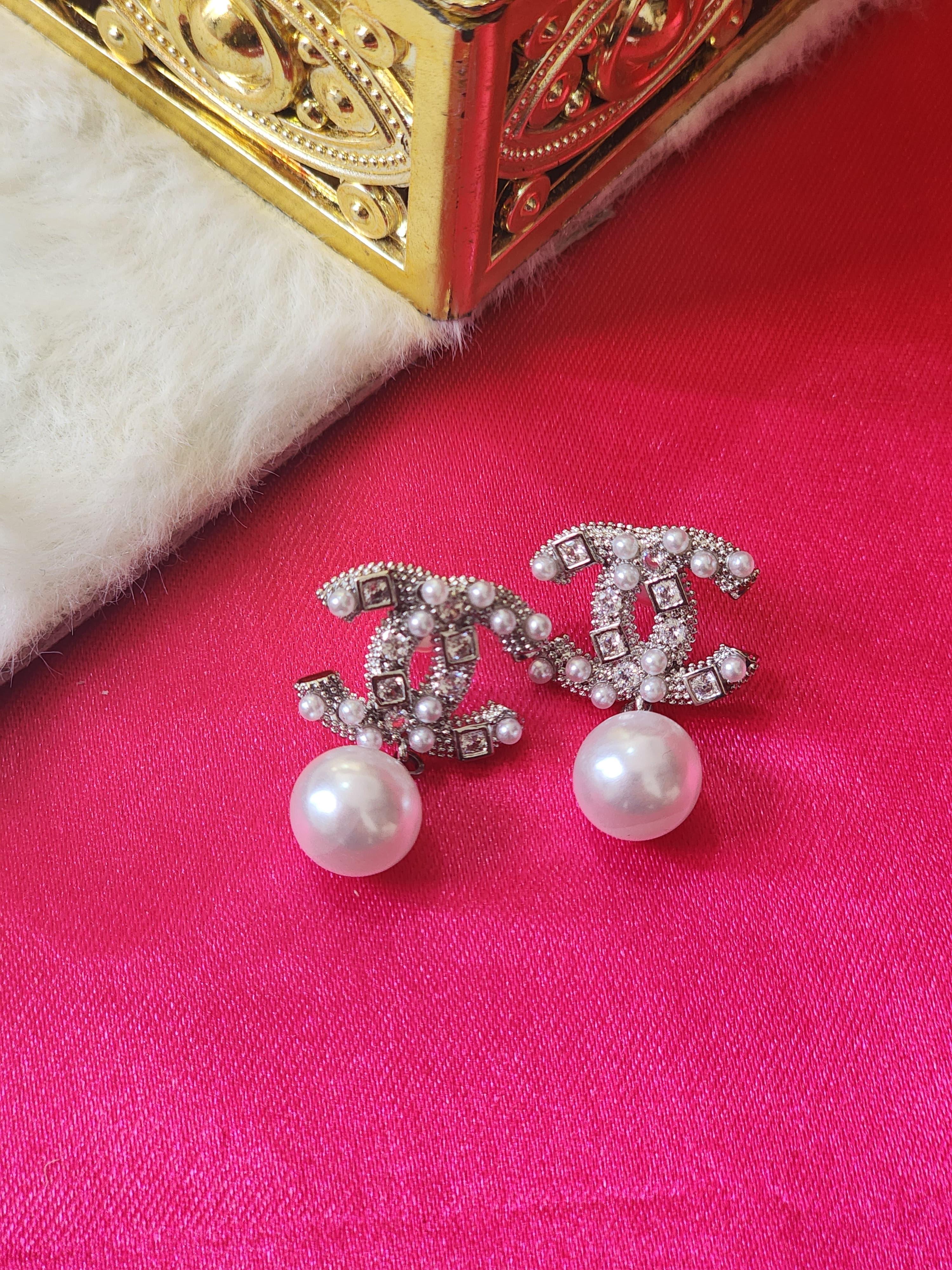 Exuding Parisian elegance, the Élise  chanel Luxe Pearl Studs by Luxe Aabhushan are a true tribute to timeless sophistication. Crafted in a structured double-C inspired silhouette, these earrings are adorned with rows of miniature pearls and glimmering cubic zirconia stones. A single, lustrous faux pearl drop finishes the piece, adding a soft, graceful touch.