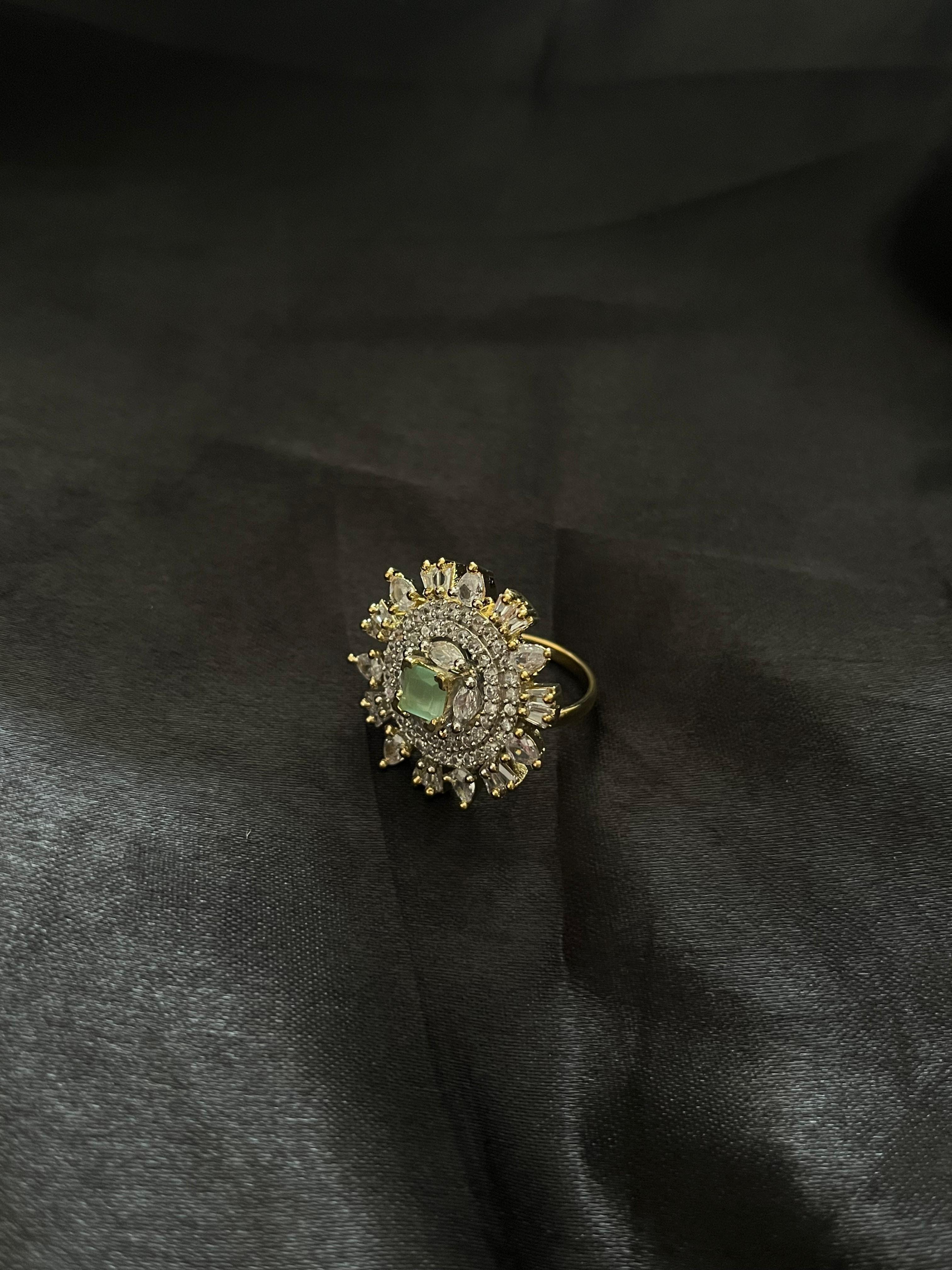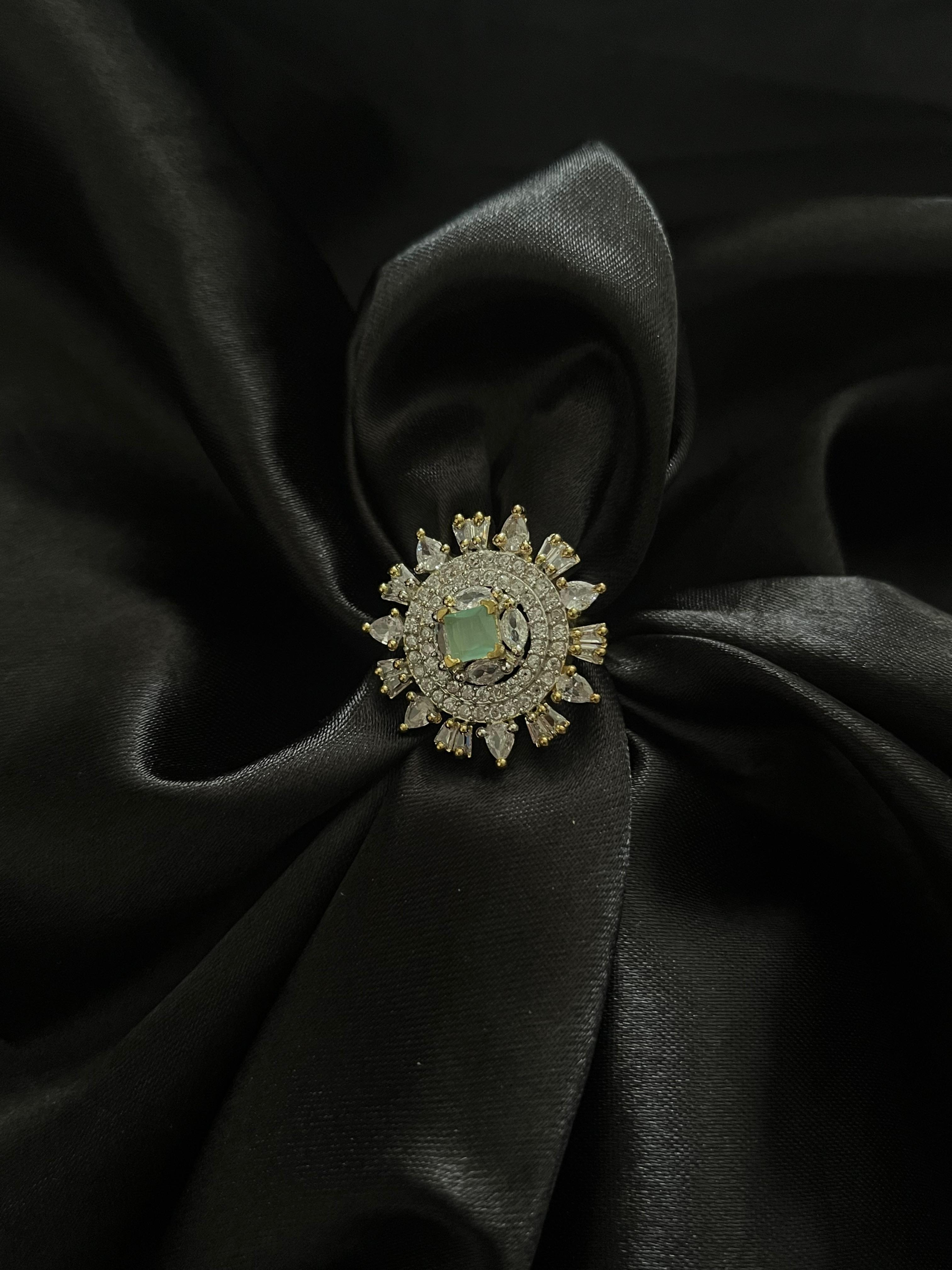 At its center glows a cushion-cut mint emerald green zircon, set gracefully amidst concentric circles of finely placed micro-pave American diamonds. Surrounding the centerpiece is a dramatic halo of alternating marquise, pear, and baguette-cut stones, mimicking a crown-like sun motif that symbolizes power, poise, and opulence.
