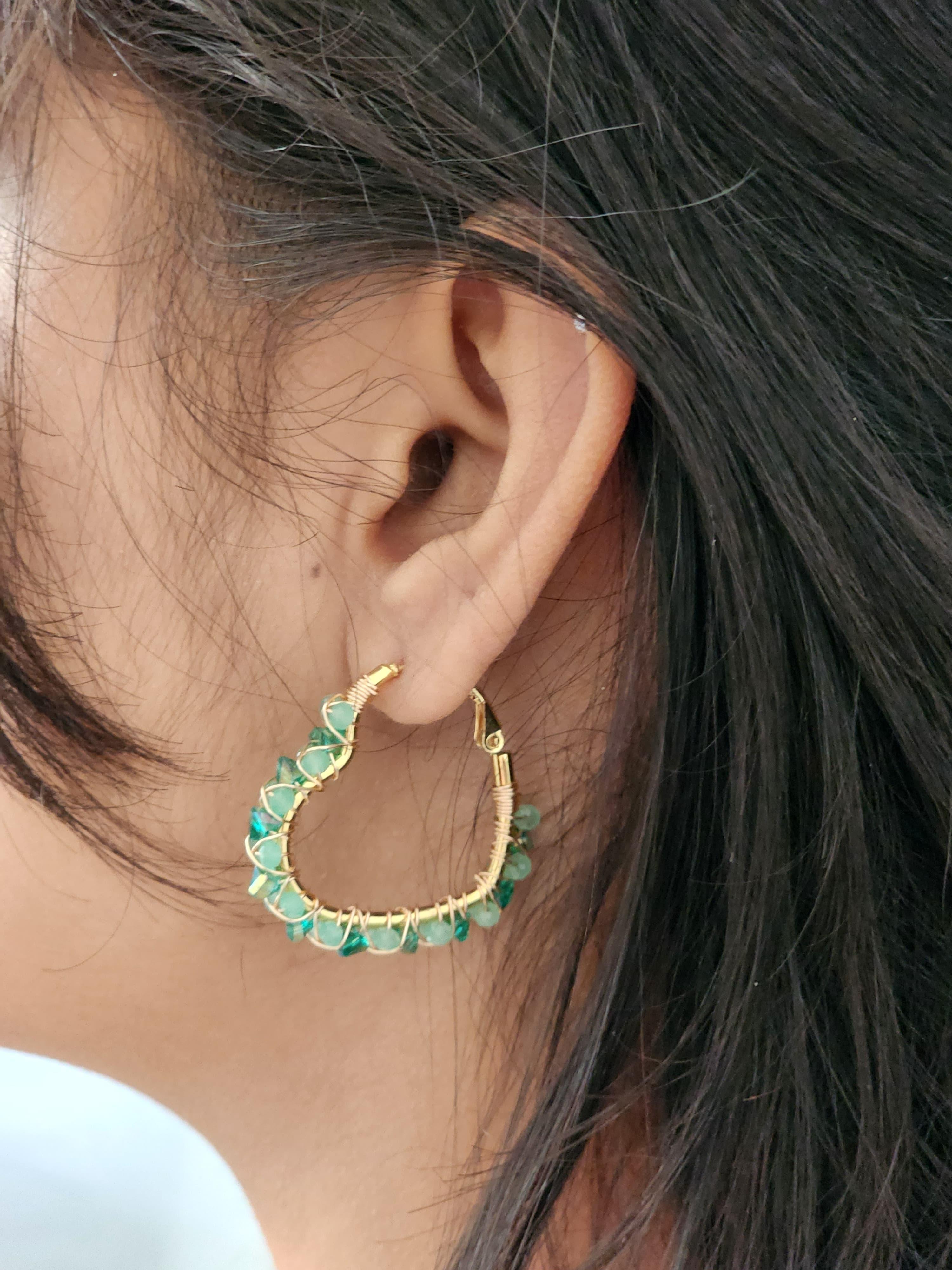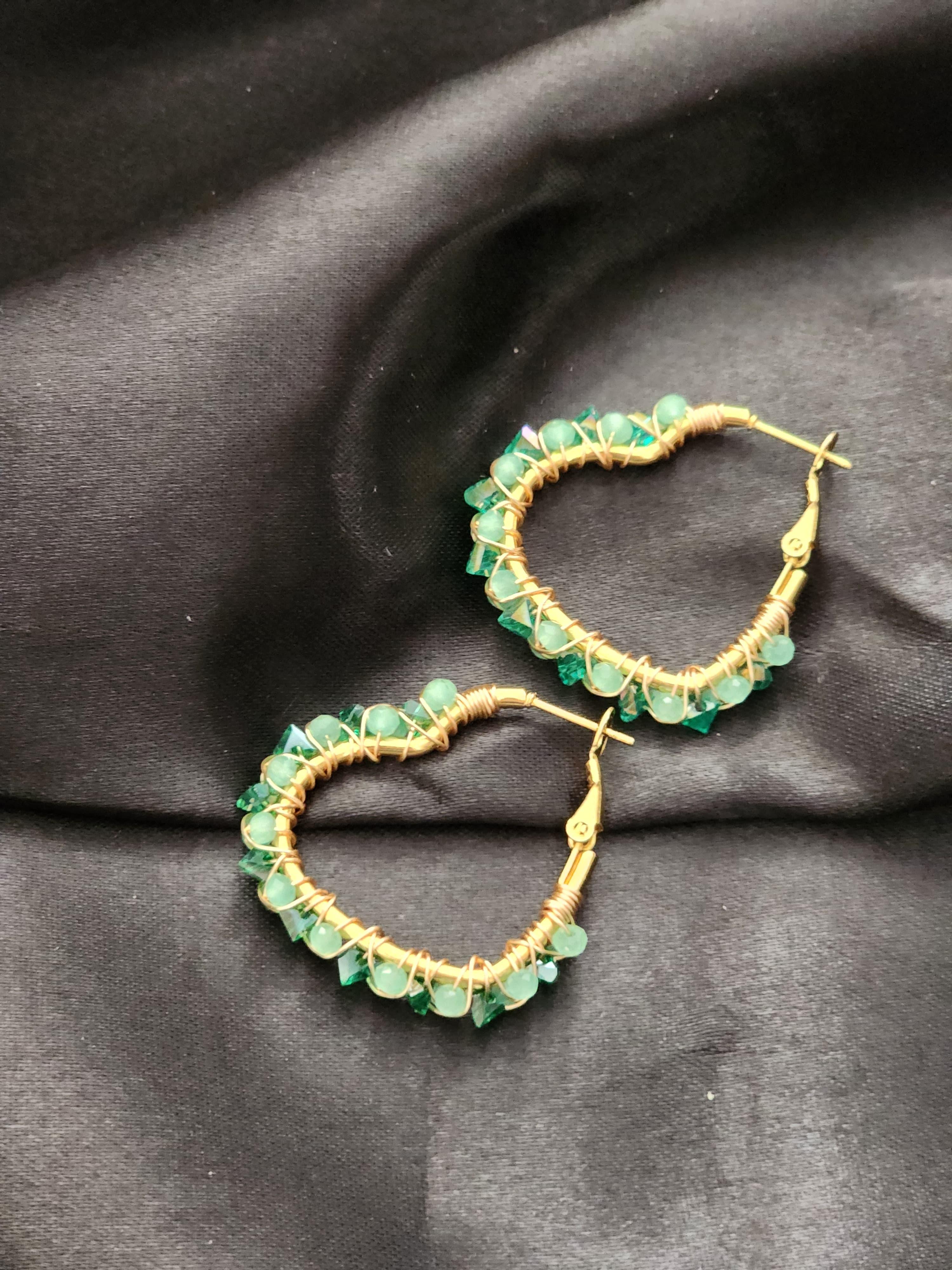 Heart Shaped Hoop Earrings Featuring Series Of Green Beads & Crystals Wrapped With Gold Wire
