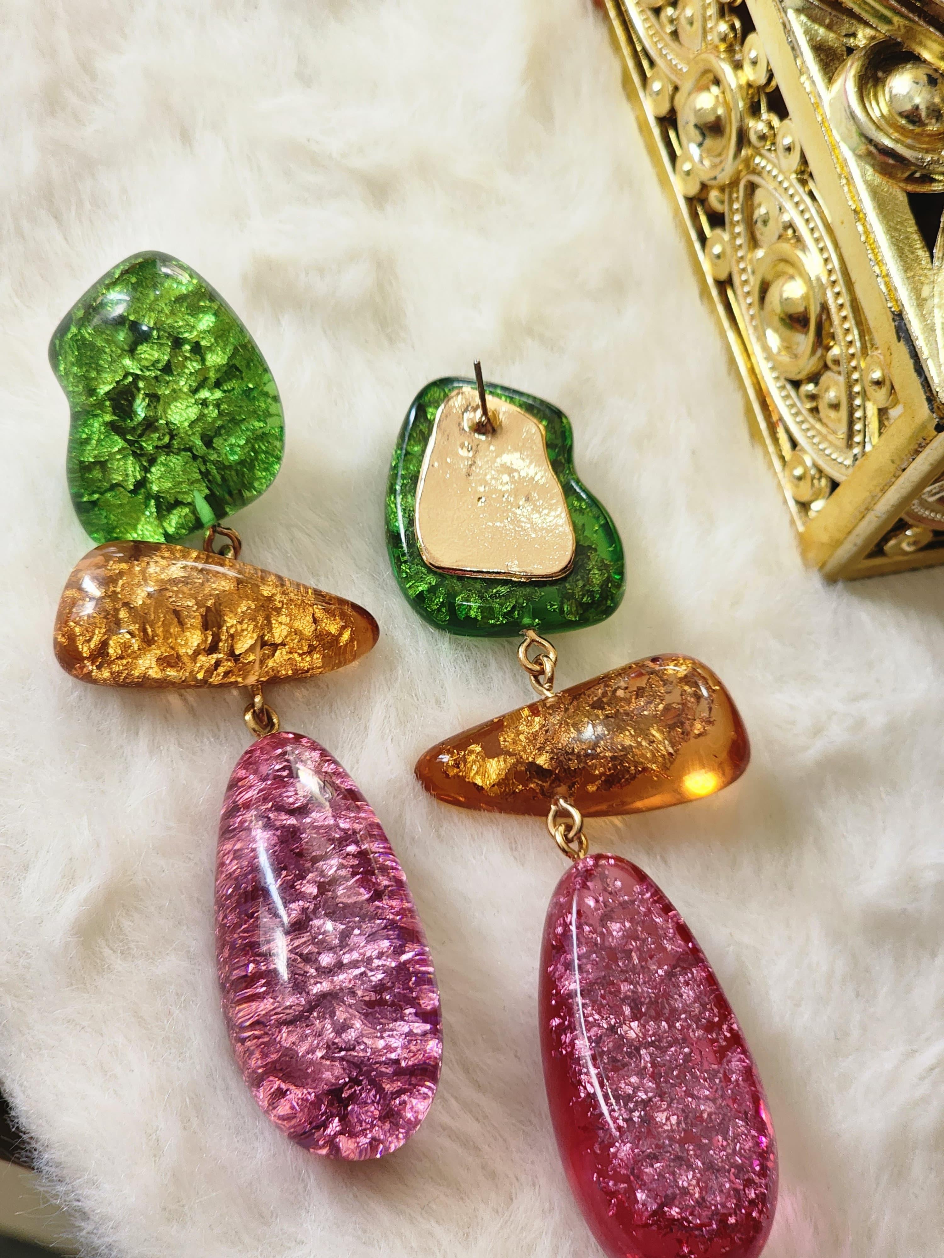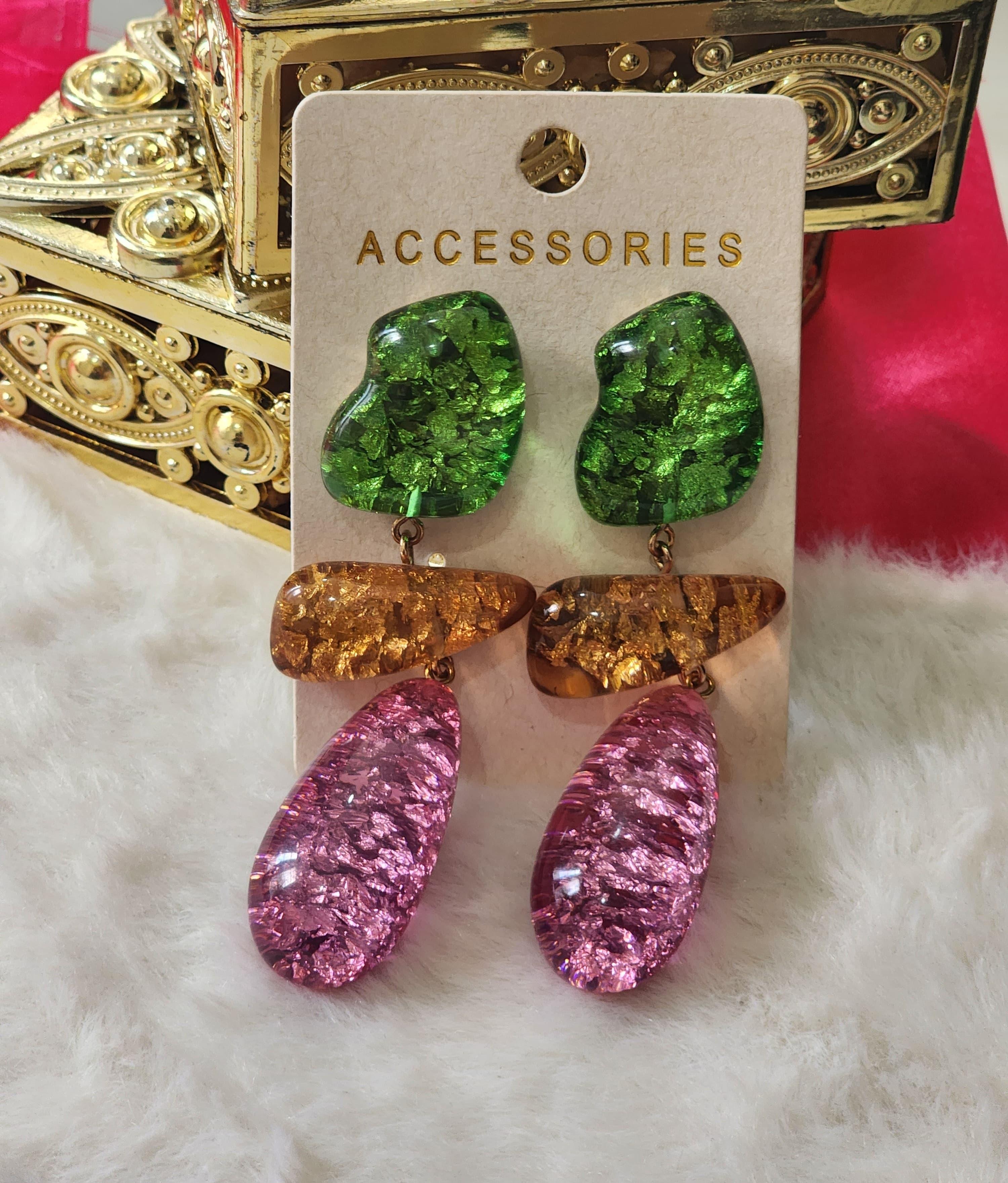 Elevate Your Style With LUXE AABHUSHAN'S Unique Fashion Collection, These are a pair of Statement dangle earrings featuring a three-tiered design. The earrings are made of resin and have a geometric shape. The top tier is a green, bean-shaped piece, the middle tier is a translucent amber color, and the bottom tier is a pink teardrop shape. The different colors and shapes give the earrings a unique and eye-catching look. Based on similar products found online, they are likely fashion jewelry, possibly described as irregular geometric resin drop earrings.