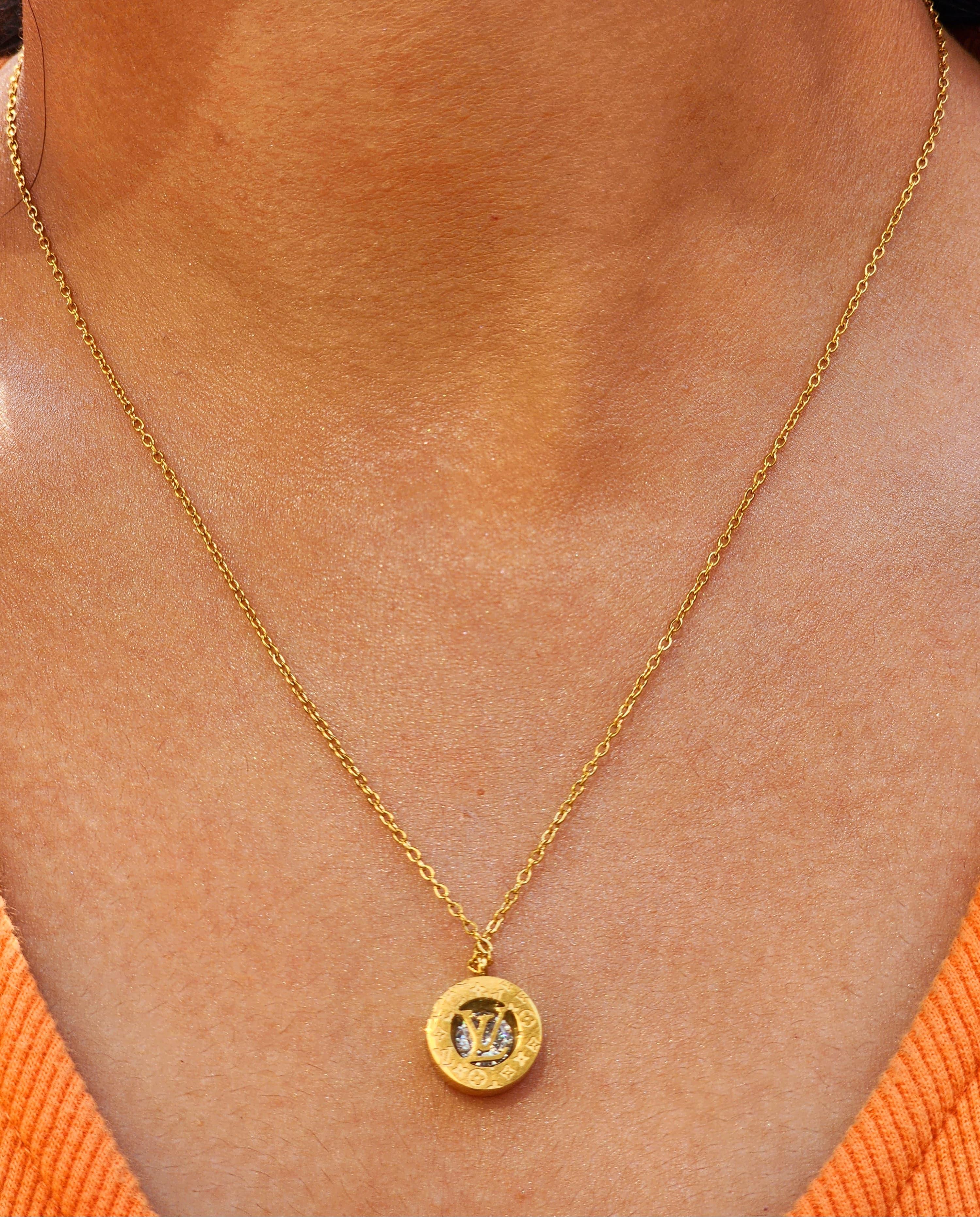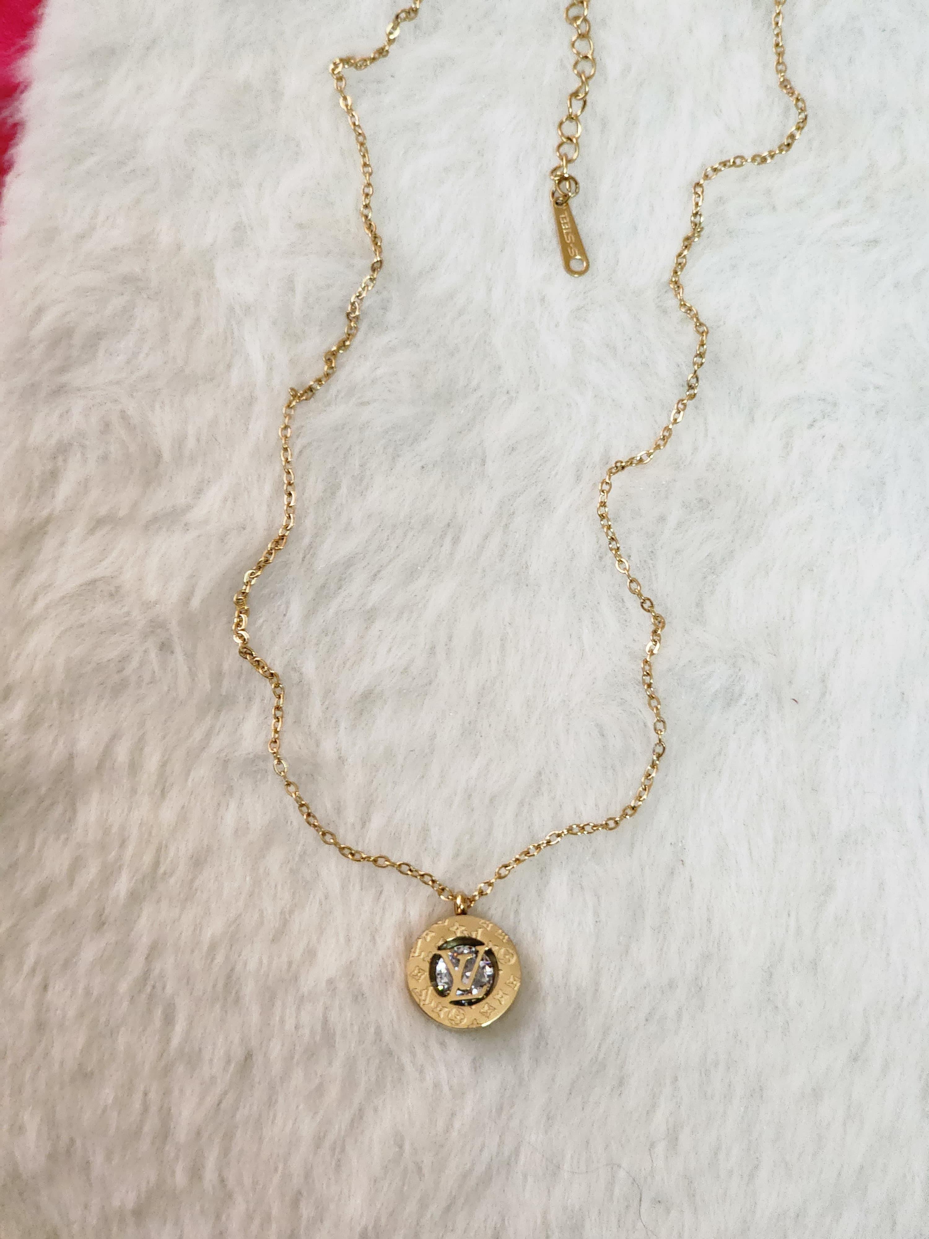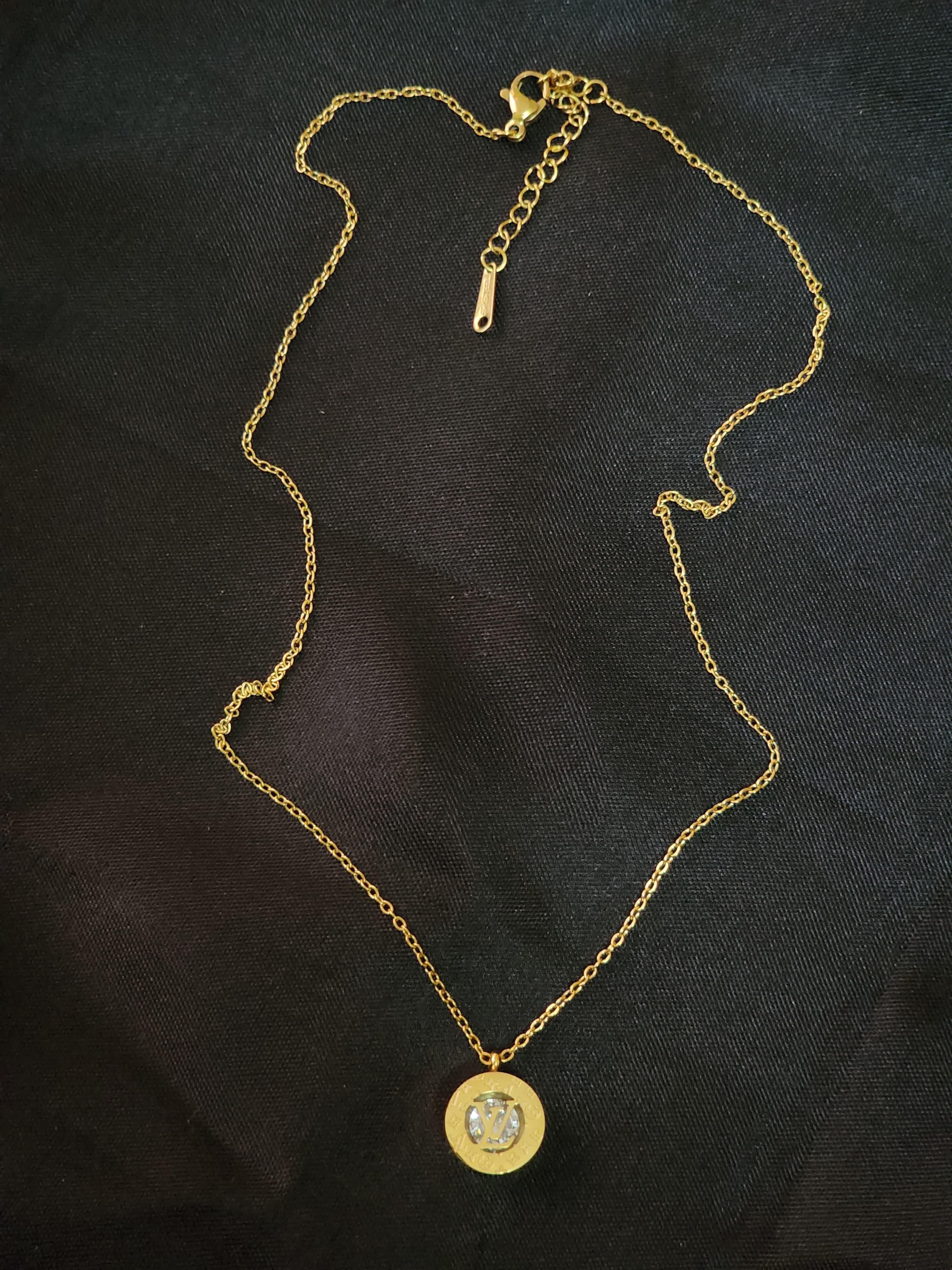 * Pendant: Designer-inspired gold-plated alloy with open LV-style motif and crown detailing