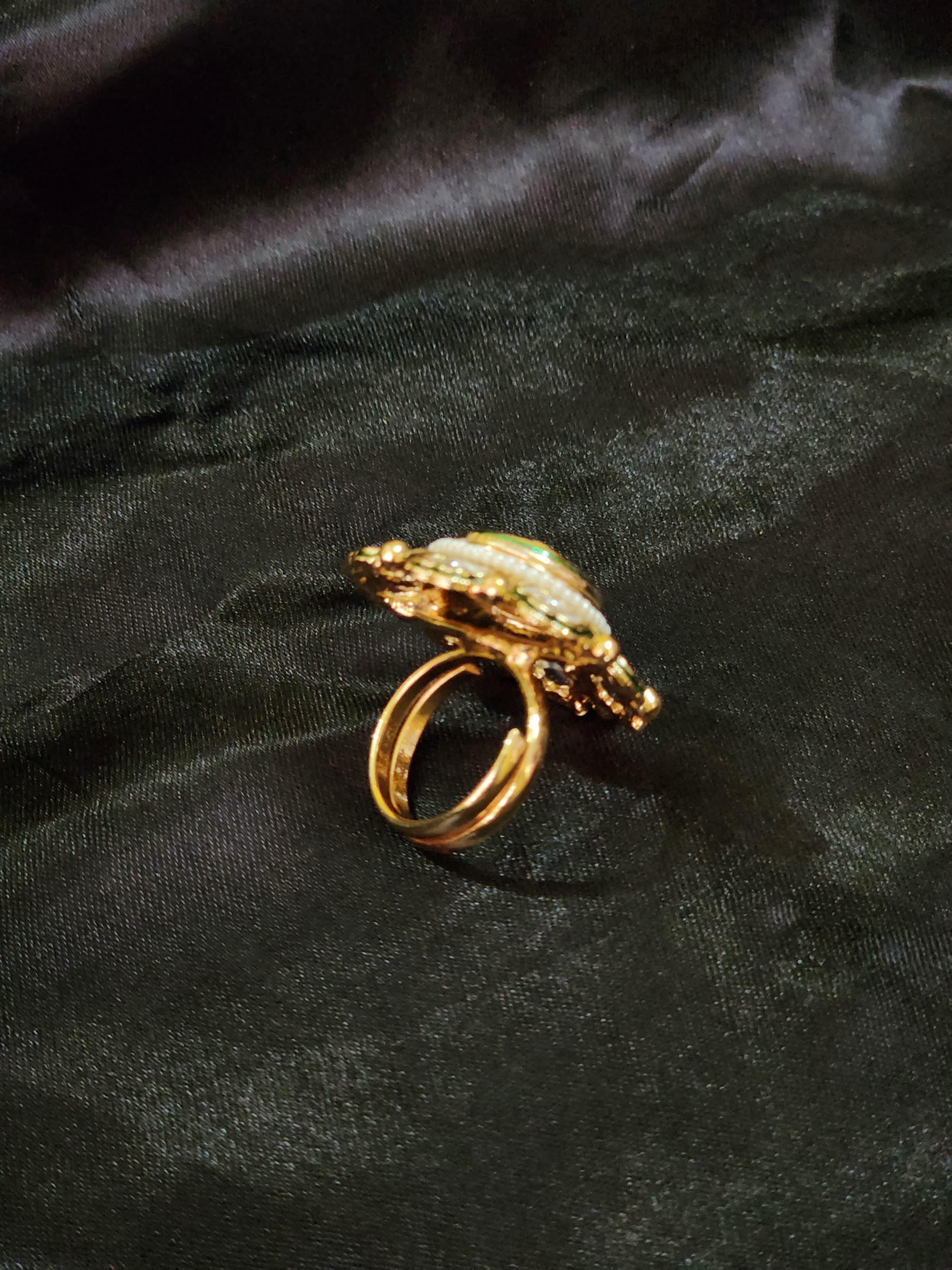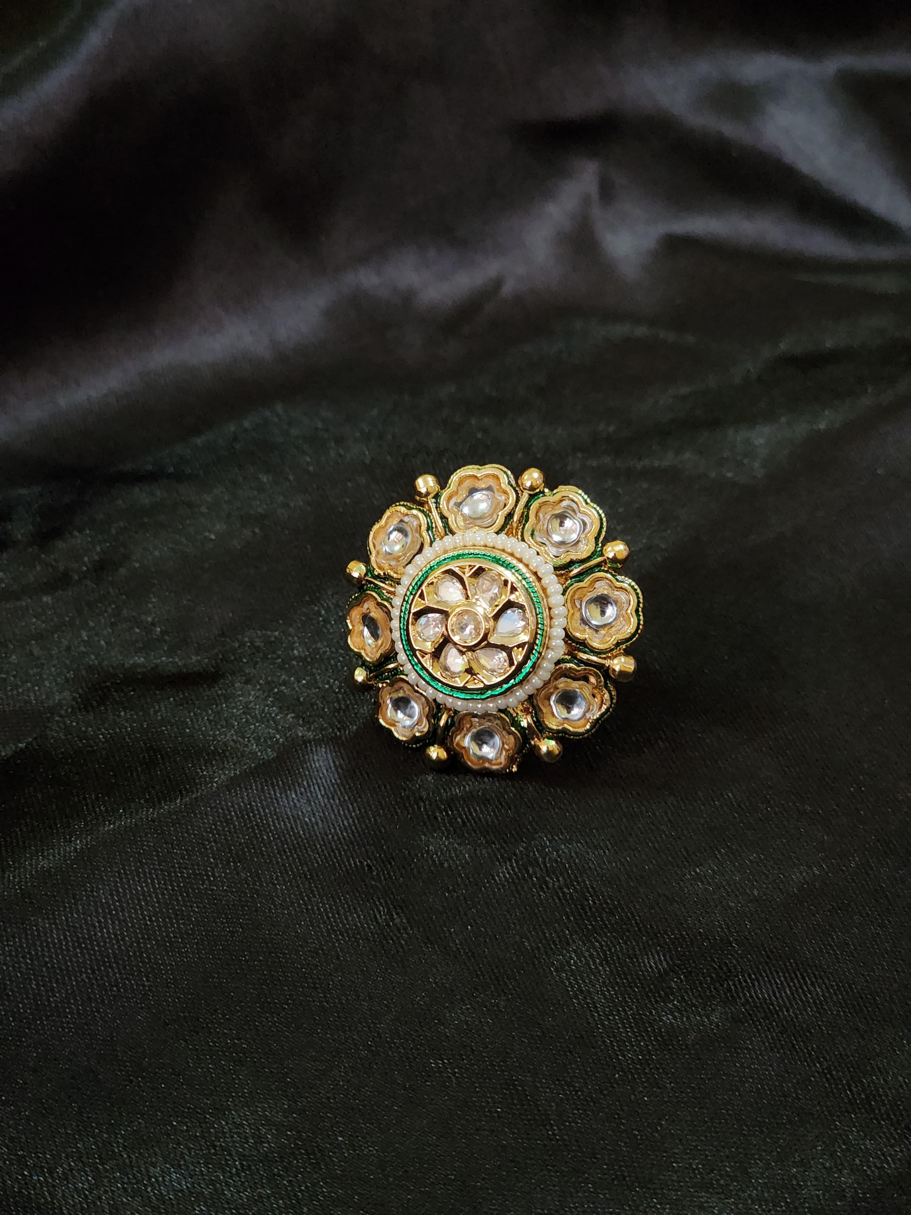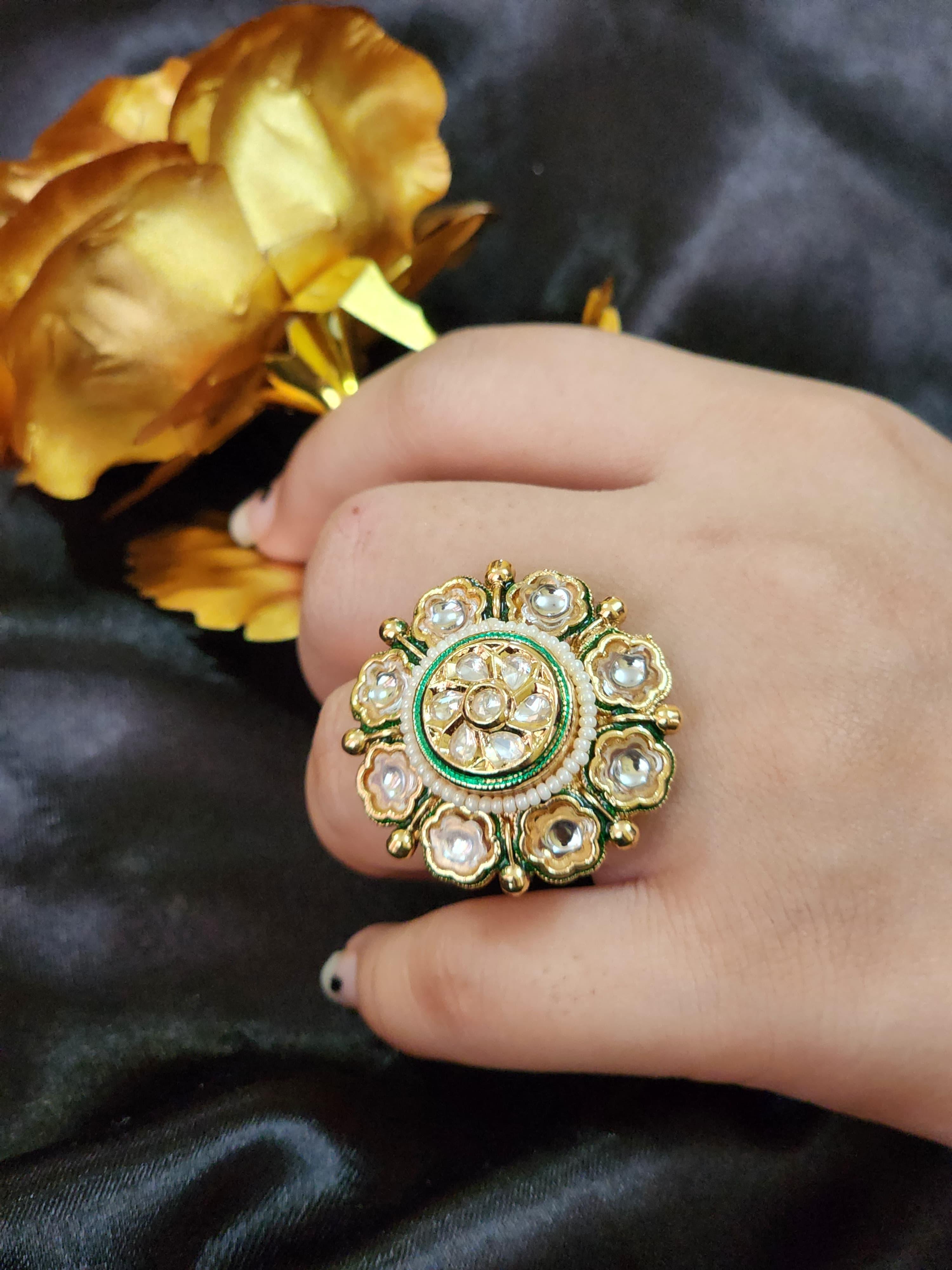 Accentuated with delicate handcrafted pearl beading and subtle touches of emerald green enamel, this ring embodies timeless opulence. The symmetrical floral pattern exudes regal charm, making it a perfect accessory for weddings, festive occasions, or heirloom gifting.