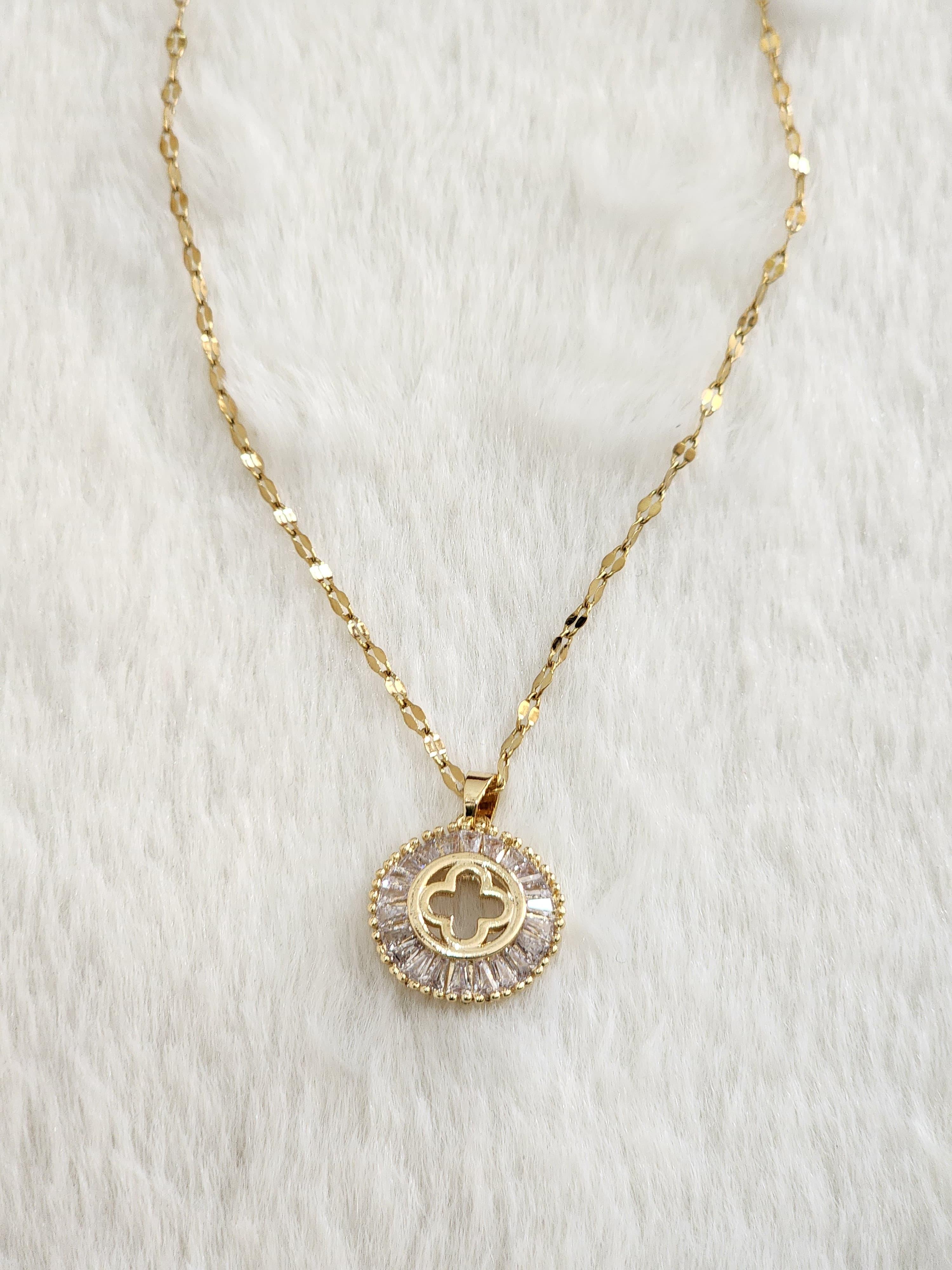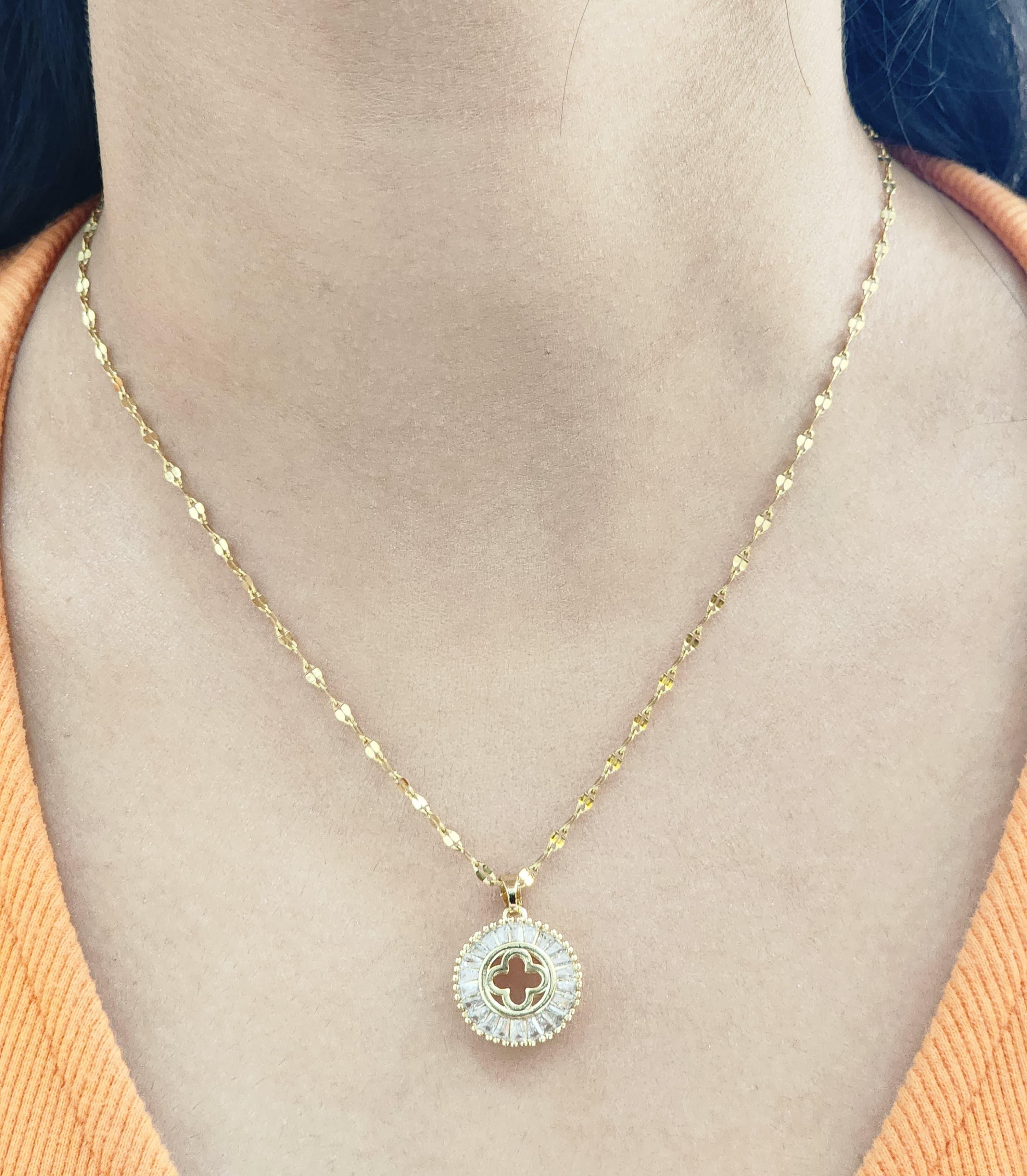 At its center is a round medallion pendant, adorned with a stunning pave of high-grade baguette-cut cubic zirconia, radiating like sunbeams around a chic four-leaf clover motif. The clover, a classic emblem of luck and harmony, adds a meaningful layer to this dazzling statement piece.