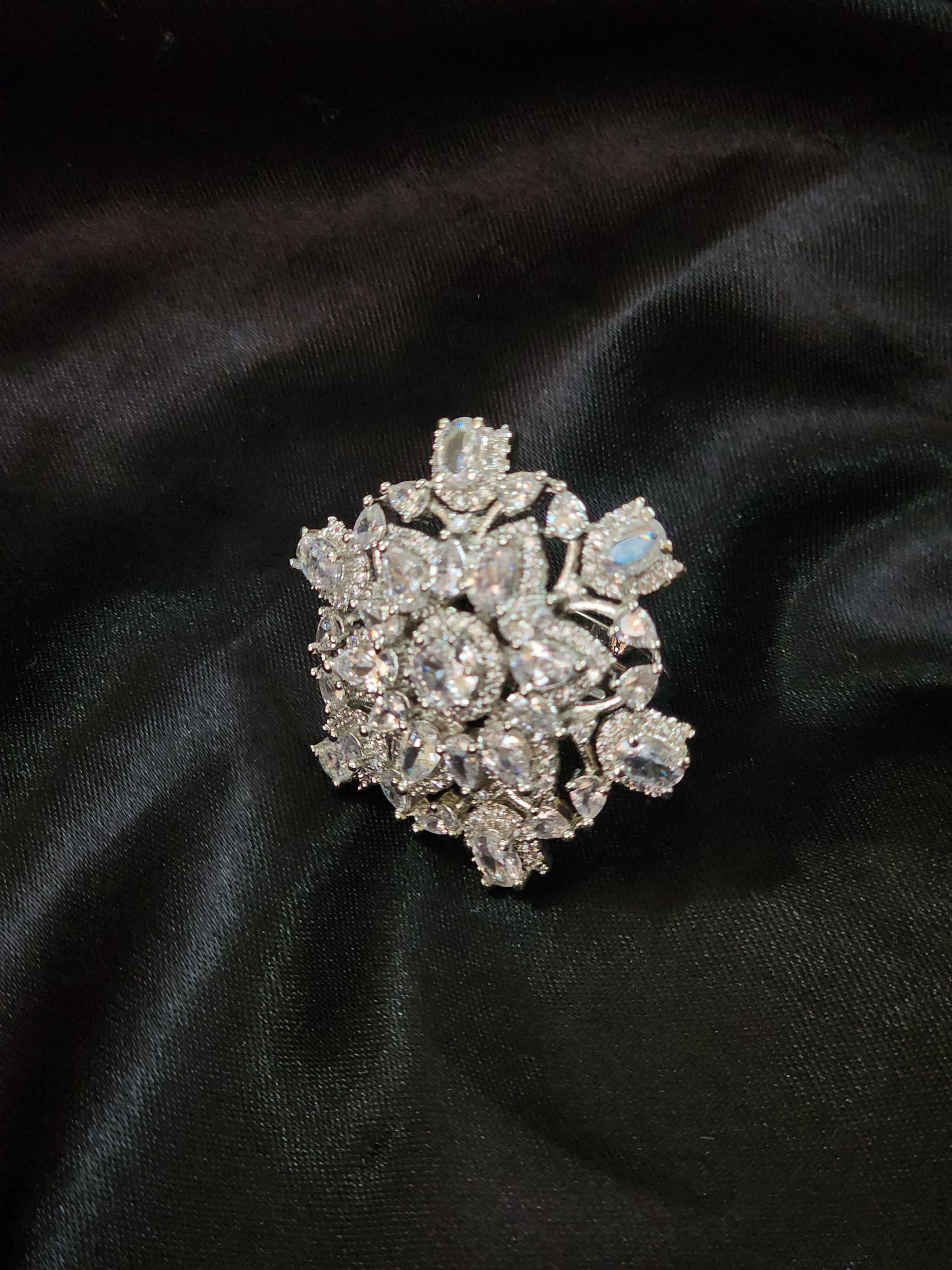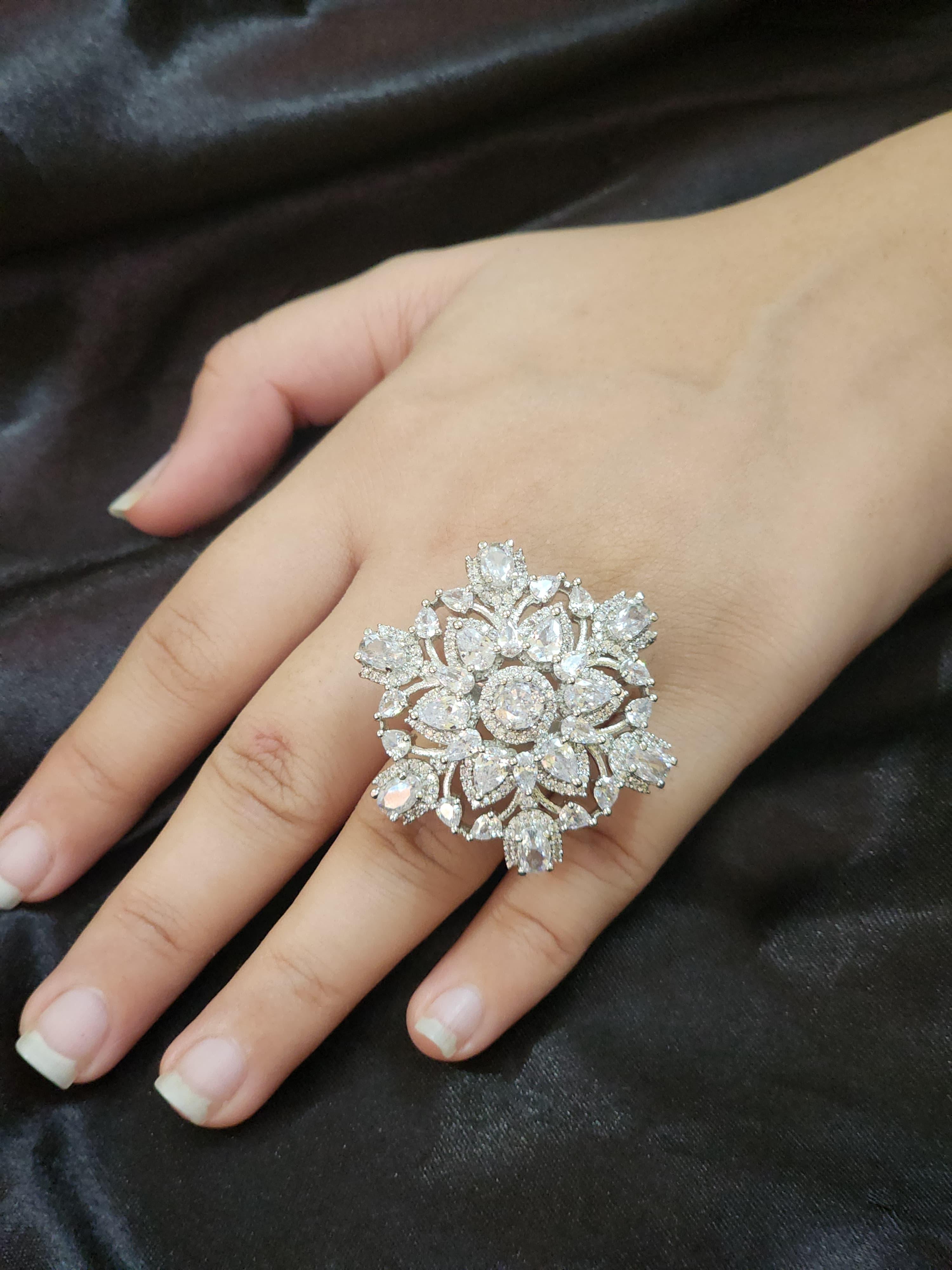 Make a grand statement with our Aurelia Royale Statement Ring, an exquisite creation by Luxe Aabhushan that embodies the spirit of regal glamour and modern sophistication. Crafted from high-quality copper alloy and finished in a radiant platinum polish, this ring showcases a breathtaking floral burst design meticulously adorned with shimmering AAA+ cubic zirconia stones.