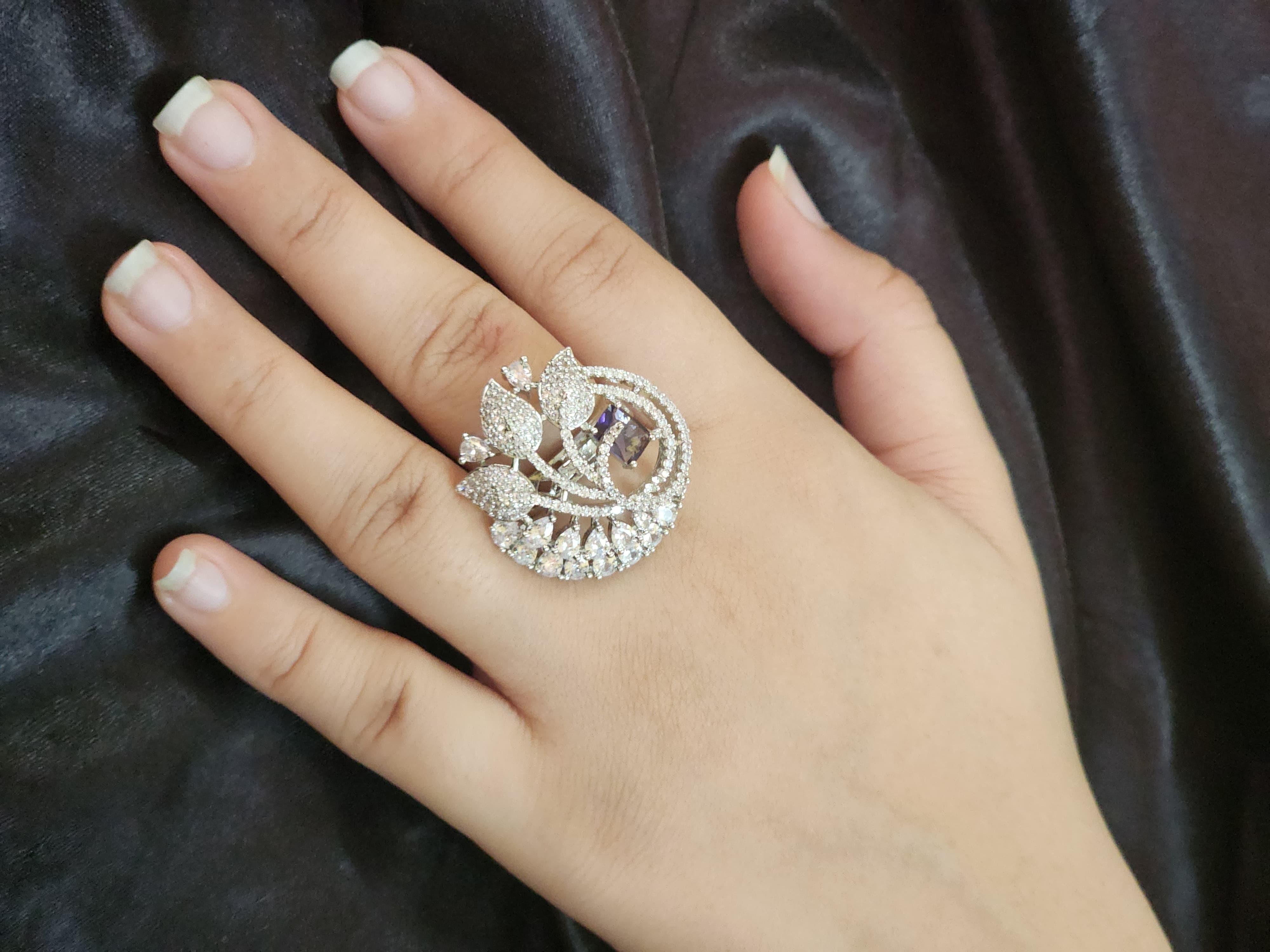 Introducing the Celestia Amethyst Bloom Ring – a true embodiment of modern elegance fused with timeless charm, exclusively by Luxe Aabhushan. This designer piece captivates with its unique spiral floral motif, delicately encrusted with dazzling AAA+ cubic zirconia stones that shimmer from every angle.