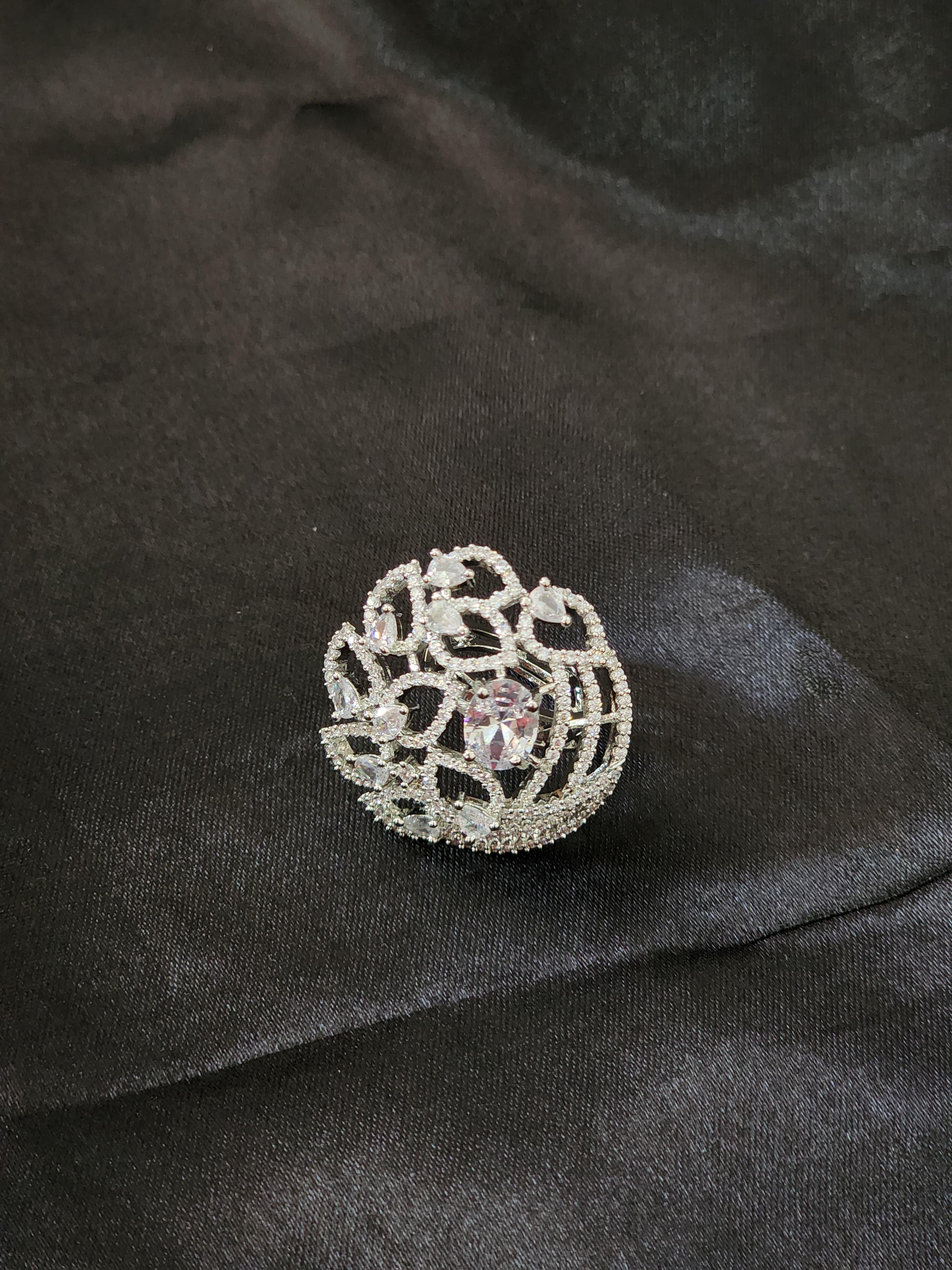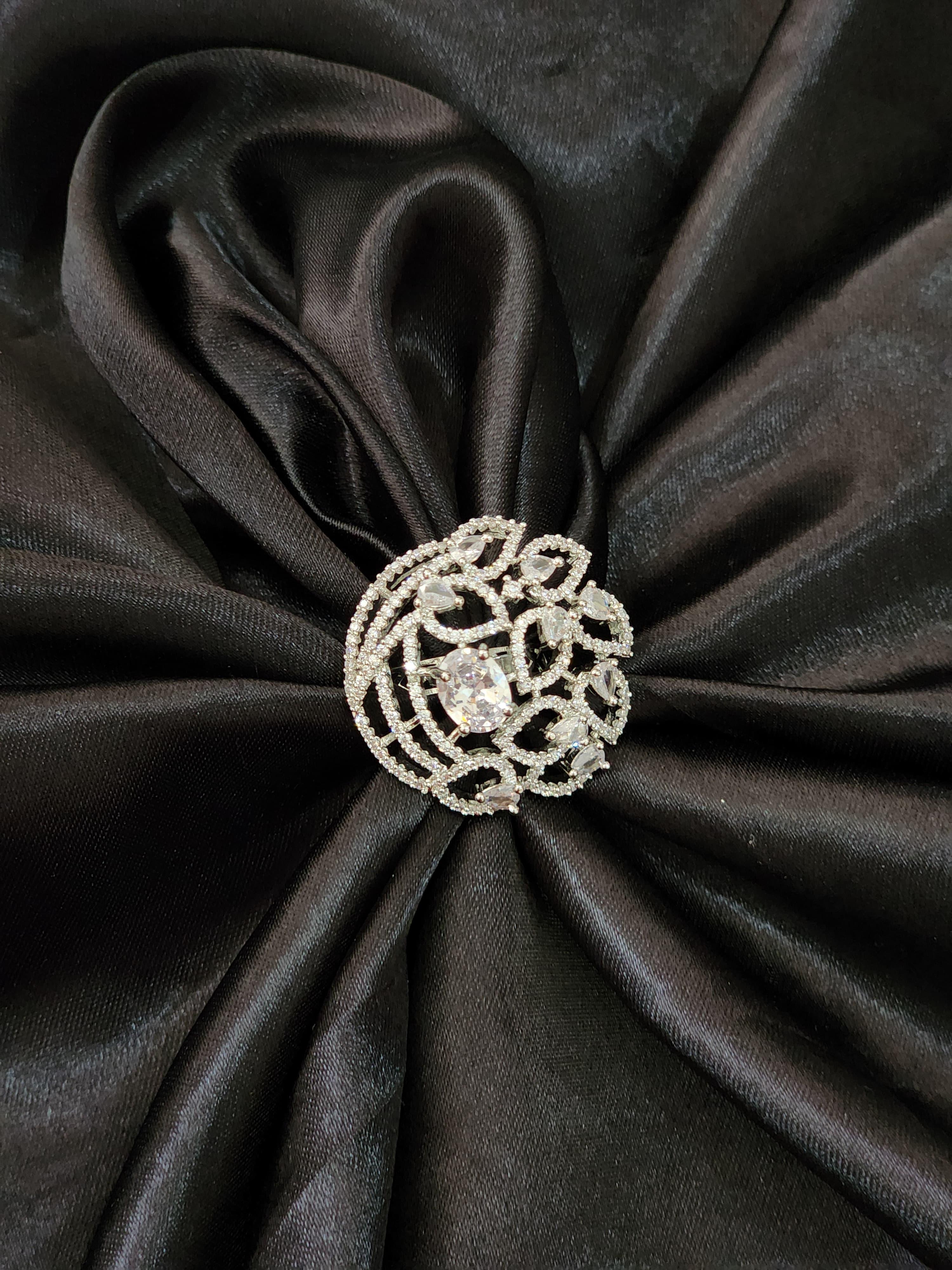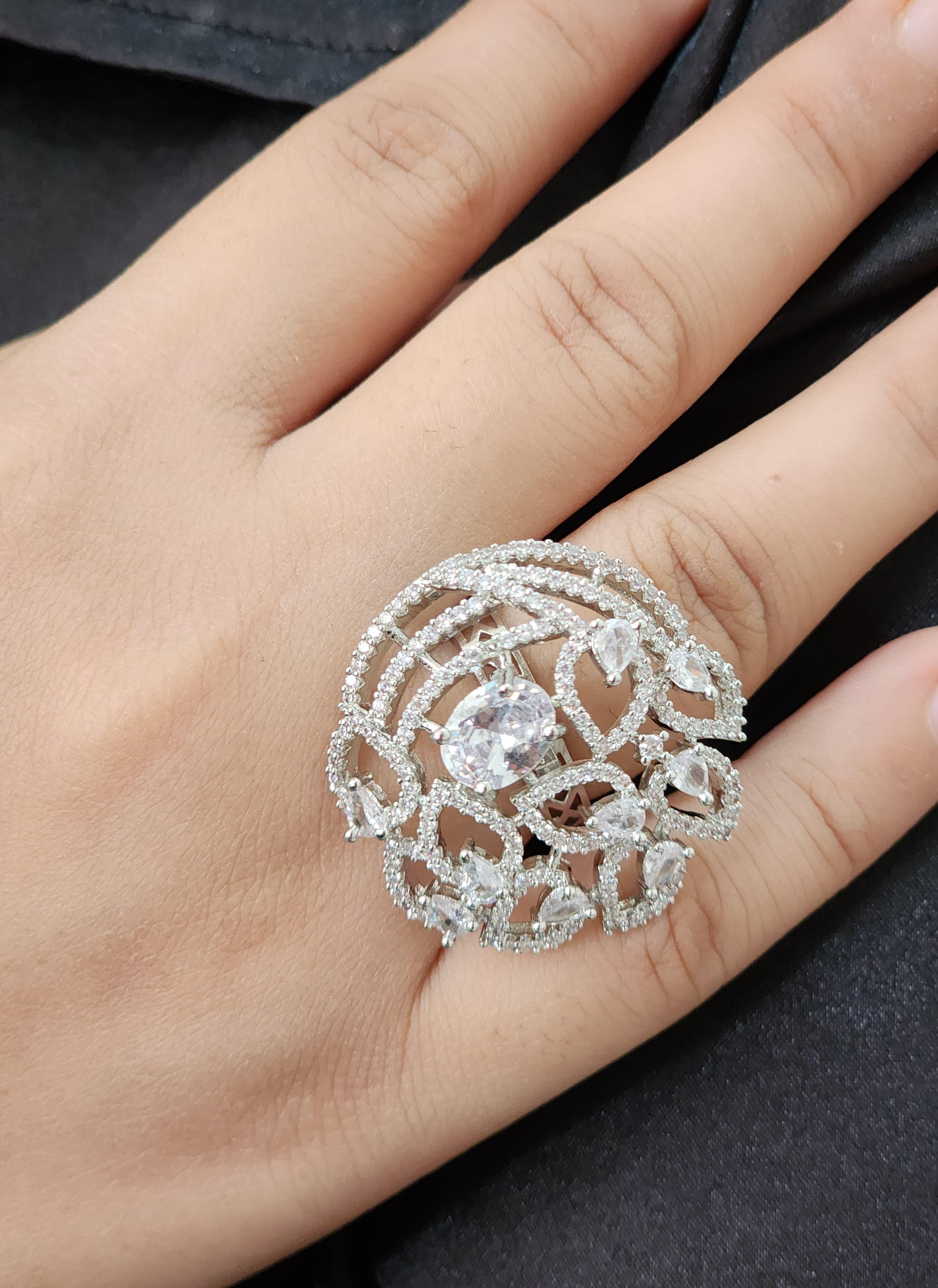 Its wide, dome-shaped silhouette sits gracefully on the finger, making it ideal for festive occasions, bridal ensembles, or evening events that demand glamour. Whether styled as a cocktail ring or the centerpiece of your jewellery look, this creation ensures timeless sophistication.
