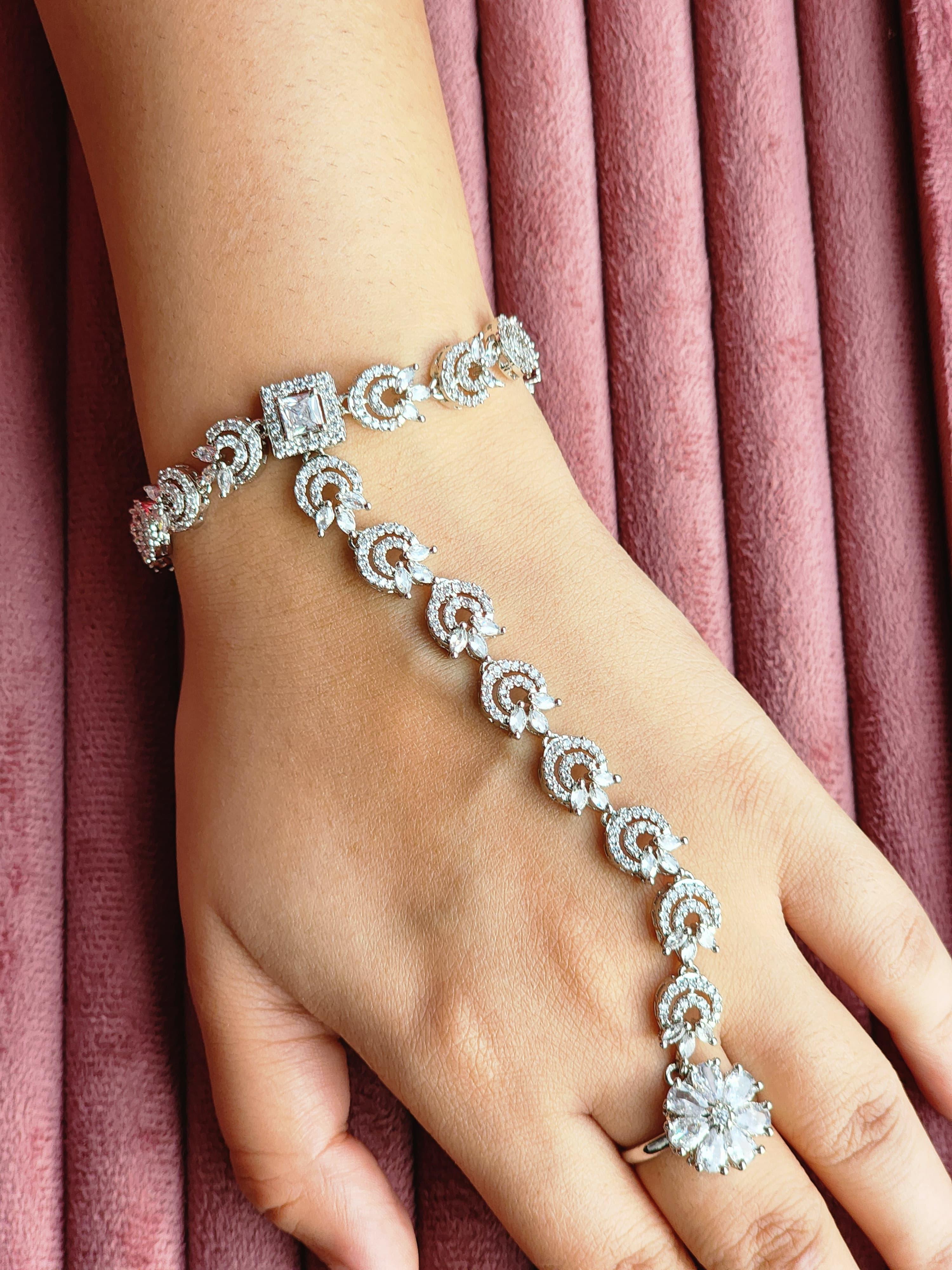 Introducing the Celestial Charm CZ Haathphool Bracelet by Luxe Aabhushan – a dazzling statement of sophistication crafted for the modern-day queen. This unique fusion piece blends the elegance of a bracelet and the grace of a ring, connected with a seamless line of glimmering motifs, perfect for festive grandeur and bridal brilliance.