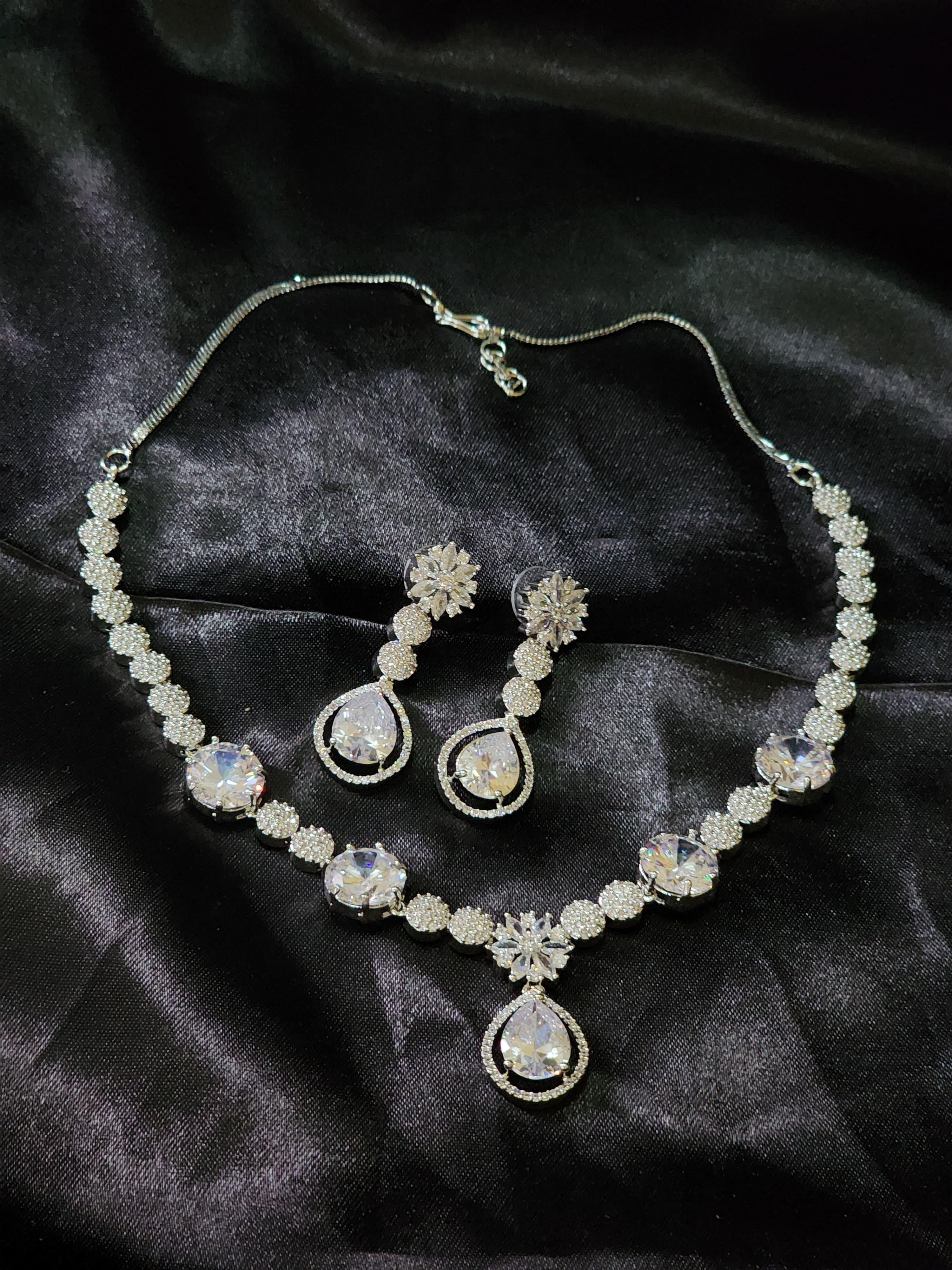 The necklace showcases a captivating sequence of round-cut American diamonds, interspersed with glittering pave clusters, all leading to a magnificent teardrop-shaped pendant encrusted in a halo of dazzling stones. The centerpiece is topped with a floral burst of brilliance, exuding regal charm. Matching earrings, designed in a cascading floral and teardrop silhouette, complete this exquisite ensemble.