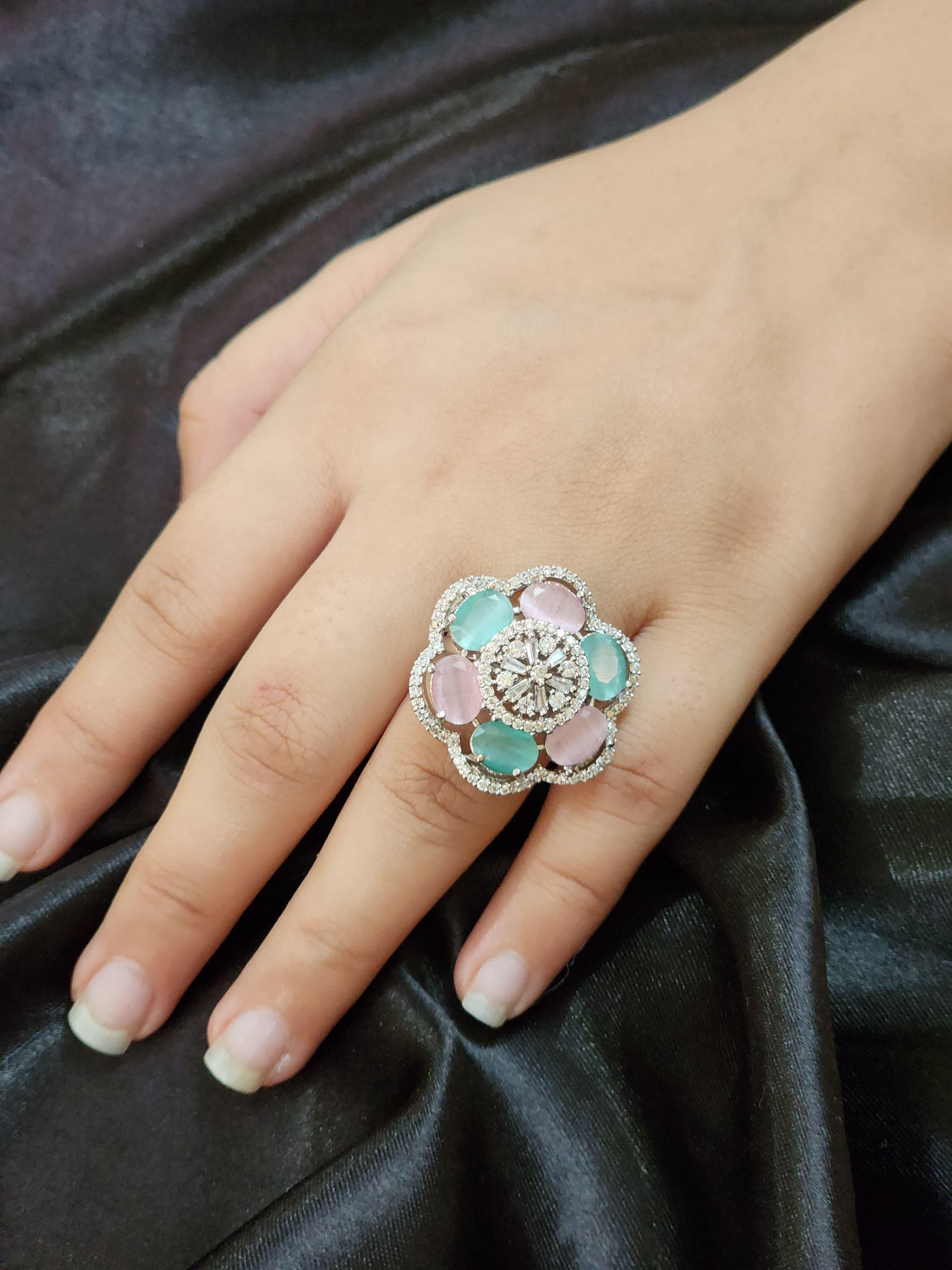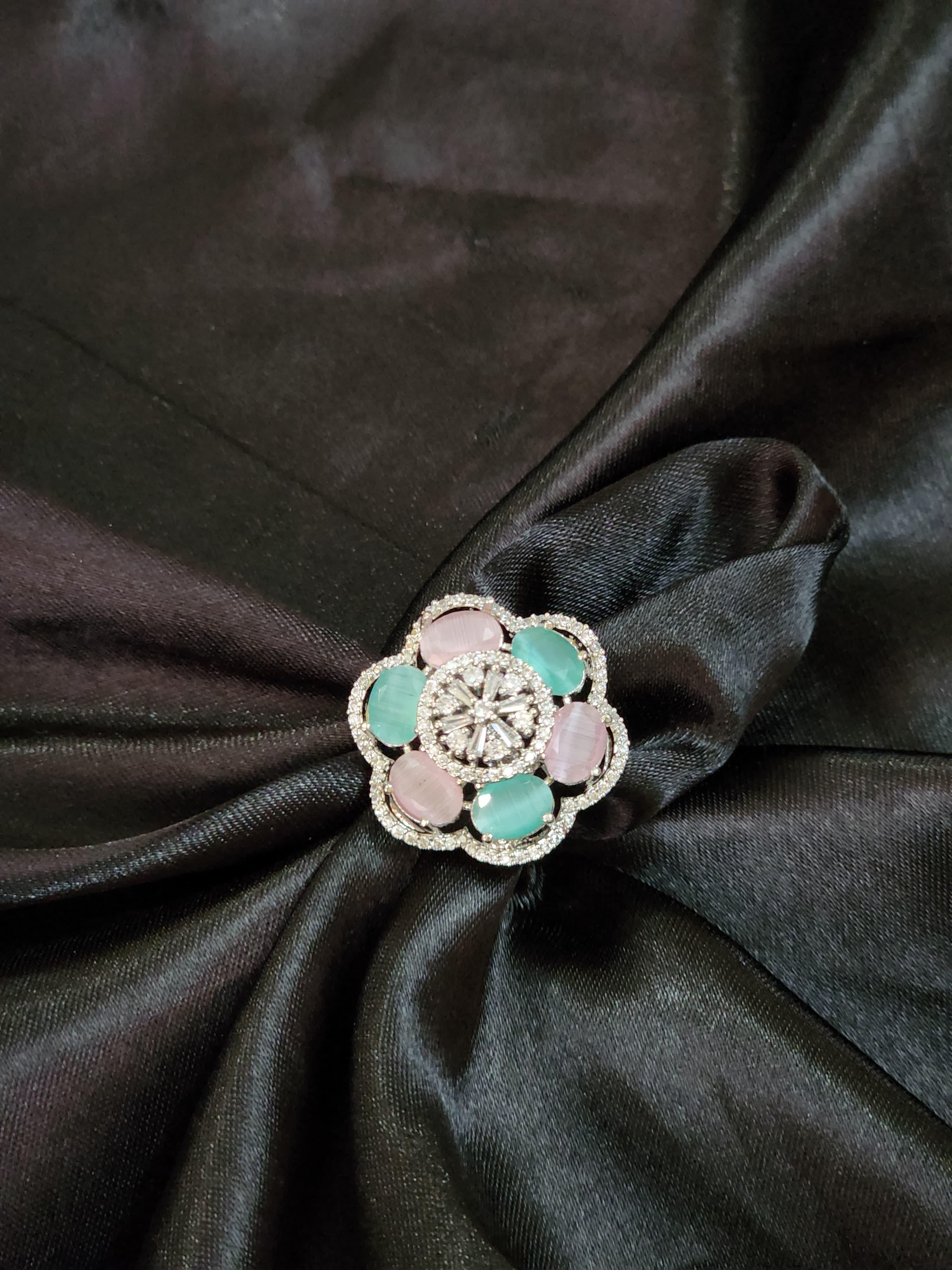 Delicate, dreamy, and designed to dazzle — the Eira Pastel Bloom Ring by Luxe Aabhushan is a floral-inspired masterpiece that captures the grace of modern femininity. Set in a radiant silver-toned base, this statement ring showcases a harmonious arrangement of pastel pink and aqua stones, each petal-shaped gem encircling a sparkling central floral cluster of American diamonds.