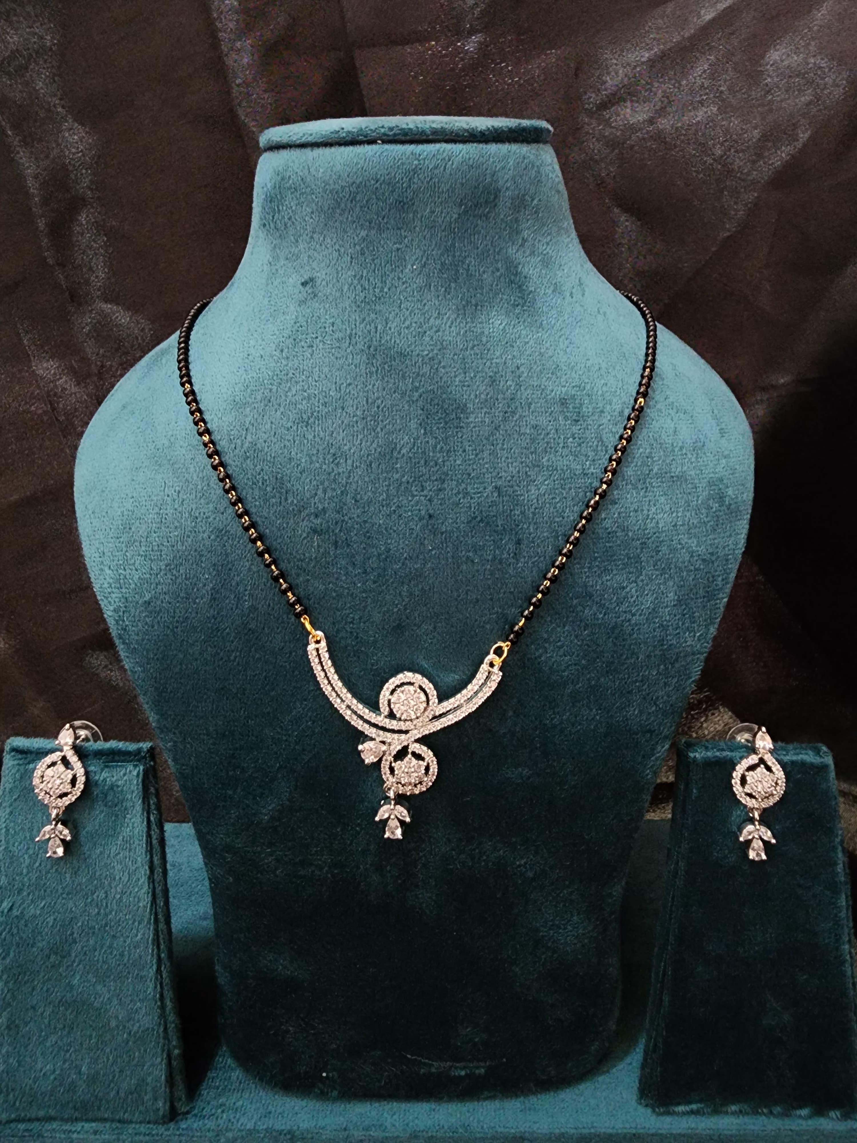Strung on a classic dual-strand black onyx bead mangalsutra chain, this design perfectly merges traditional symbolism with a contemporary twist. The matching dangling earrings, also finished in a radiant silver tone, complete the look for a refined and coordinated appearance.