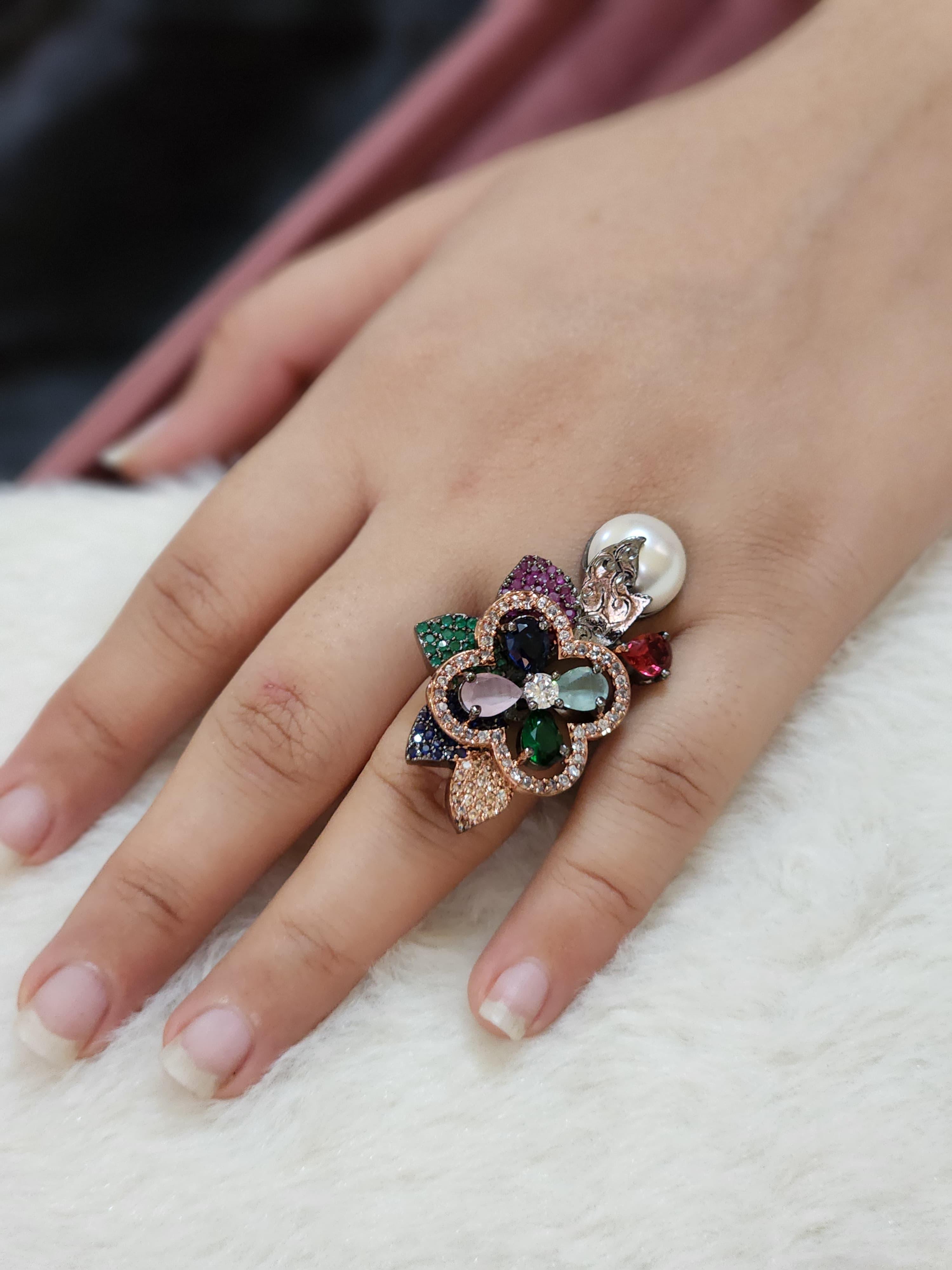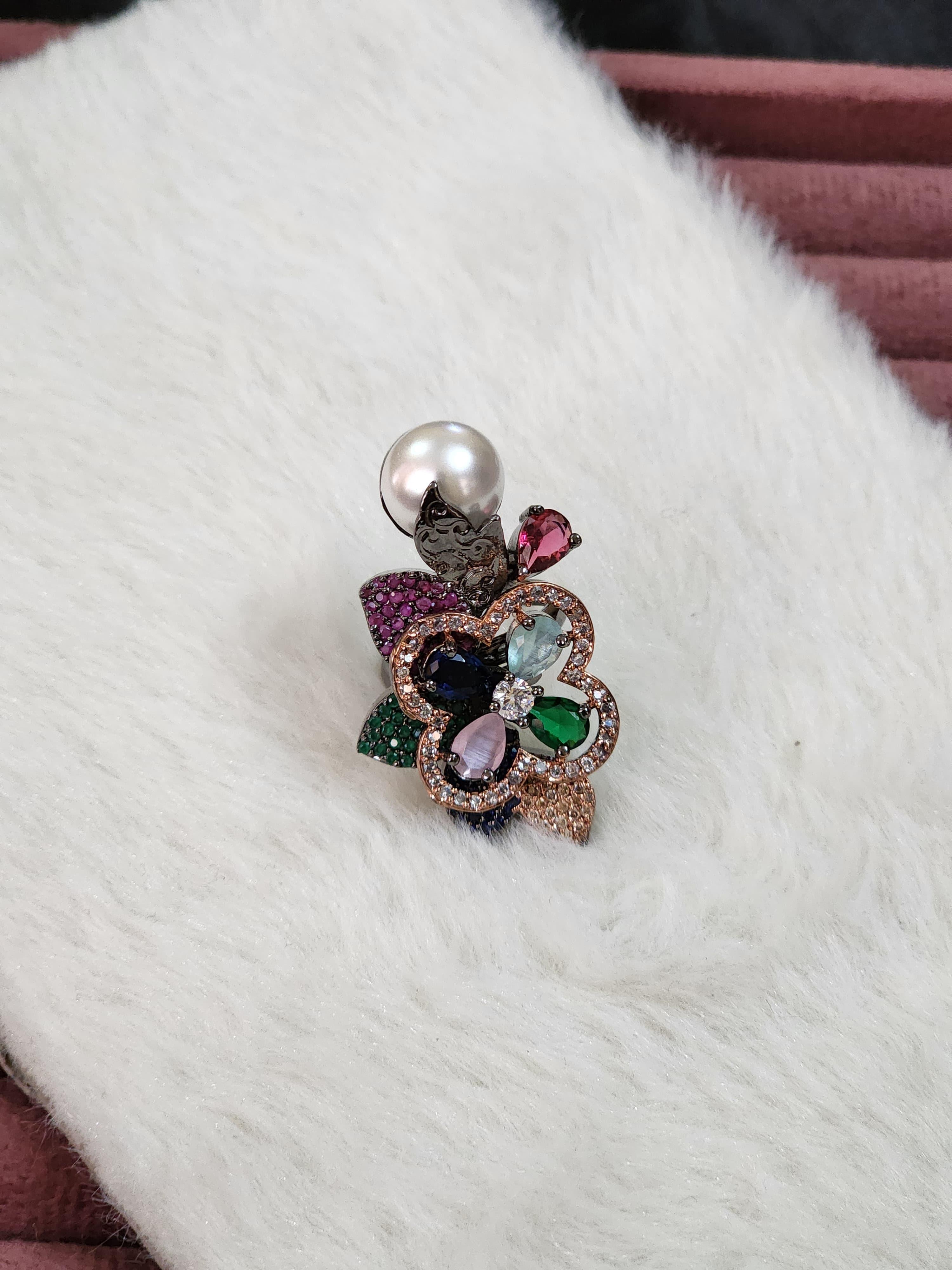 Introducing the Iris Royale Multigem Ring by Luxe Aabhushan — where regal artistry meets eclectic sophistication. This opulent ring is a floral fantasy brought to life with an ensemble of multi-hued stones, dazzling micro-pave crystals, and a luxurious faux pearl crown accent that evokes timeless elegance with a contemporary twist.
