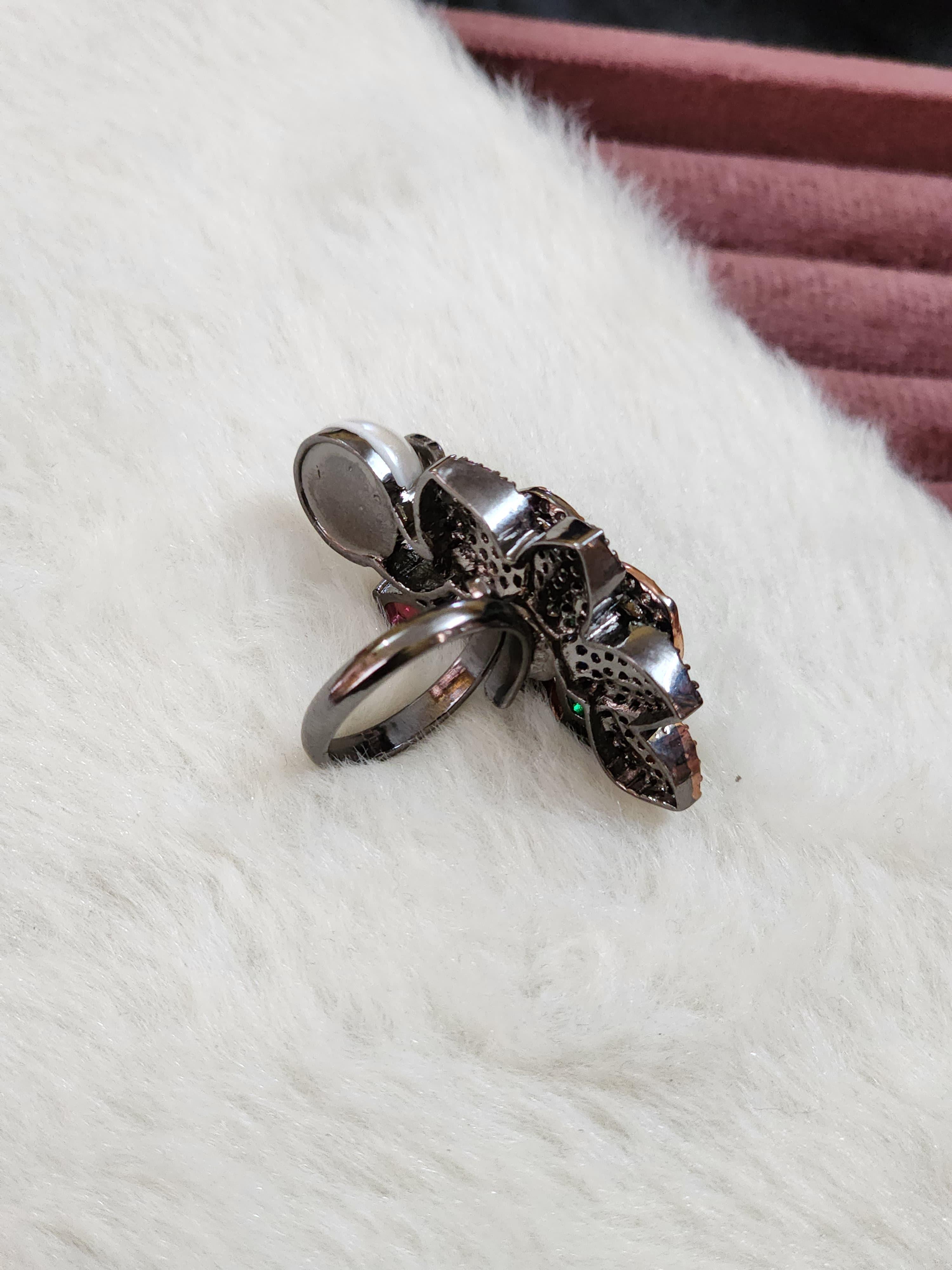 Topped with a striking oversized pearl and detailed metal motif, this designer piece is an instant conversation starter — perfect for fashion-forward women who love artistic jewelry with a dramatic flair.