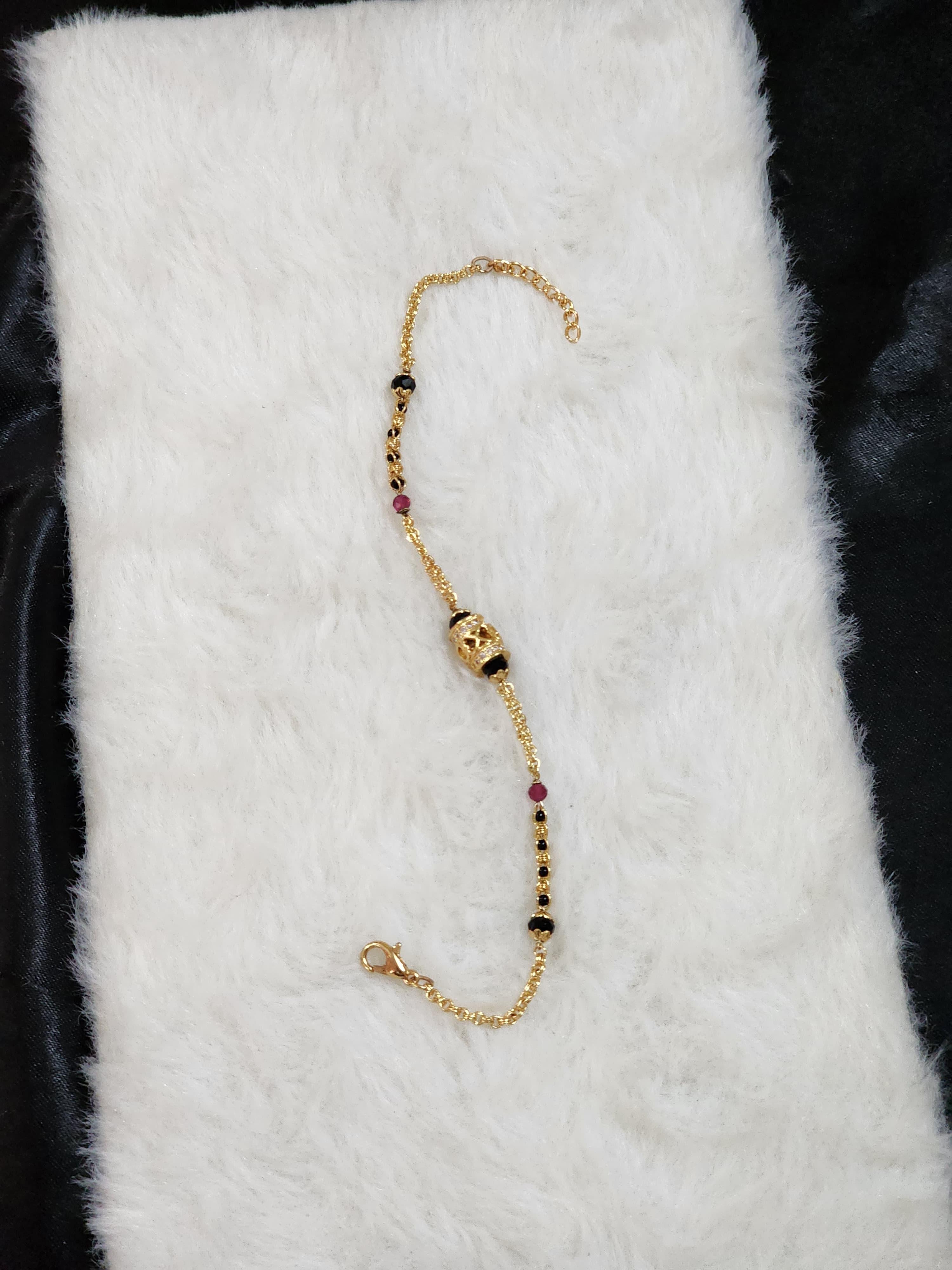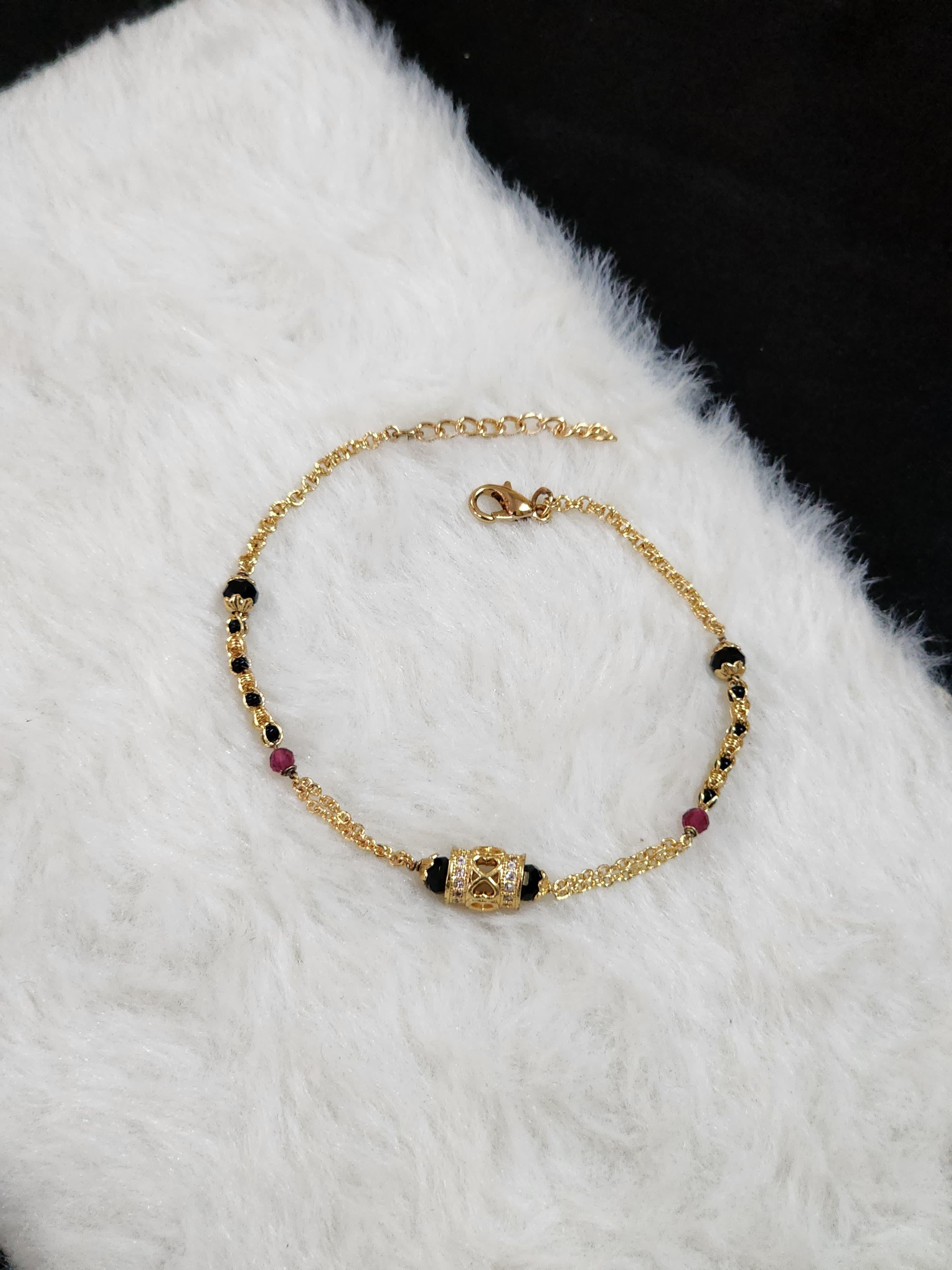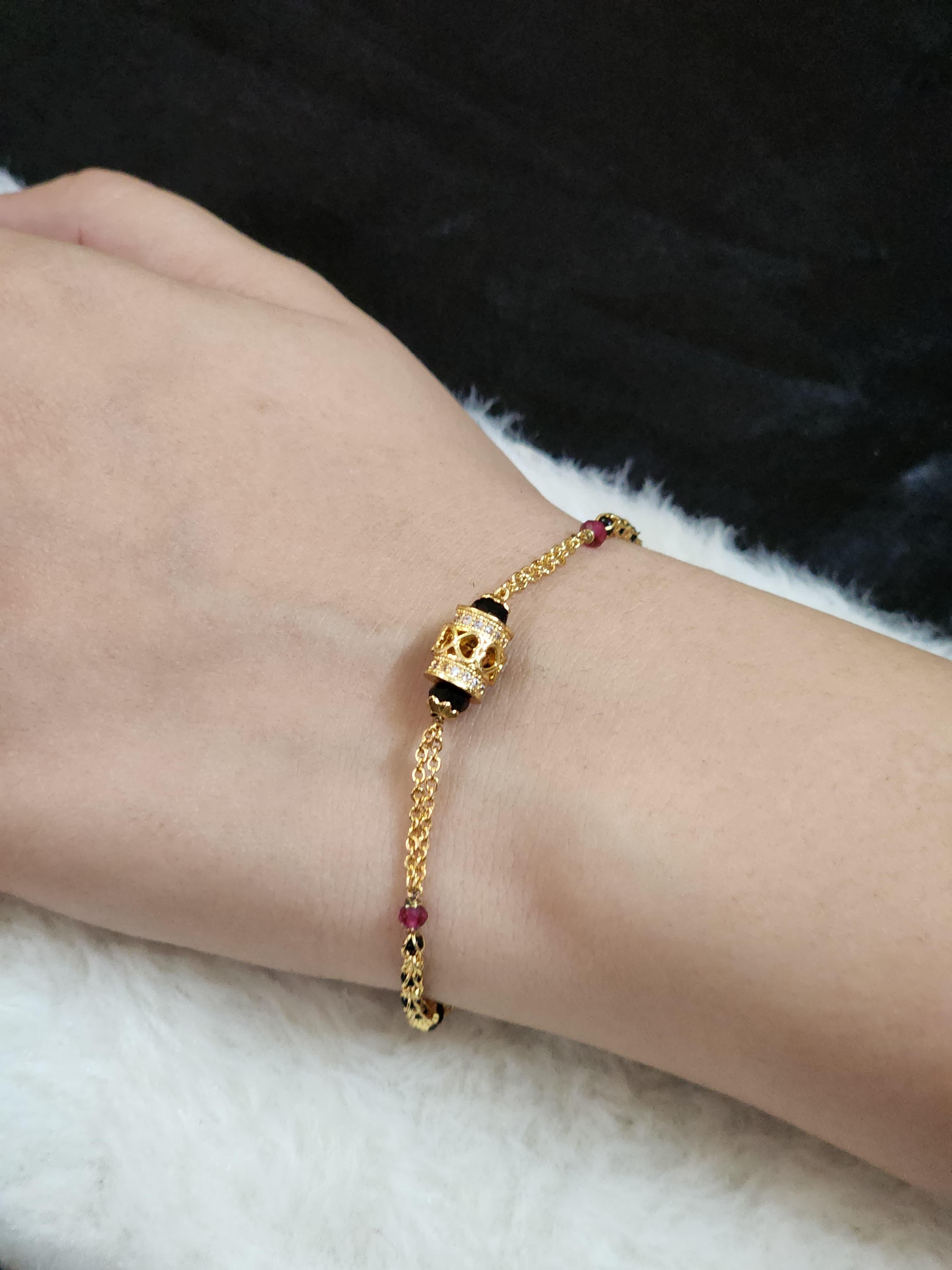 At the heart of this bracelet lies a beautifully crafted gold-tone cylindrical motif, engraved with intricate floral lattice work and highlighted with shimmering micro CZ accents. The motif is flanked by black and deep ruby-toned beads, adding a pop of sophistication and richness. The dual twisted gold chain links and delicate black-beaded detailing bring balance, structure, and poise to the design. Finished with an adjustable extension chain and lobster clasp, it ensures both comfort and a tailored fit.
