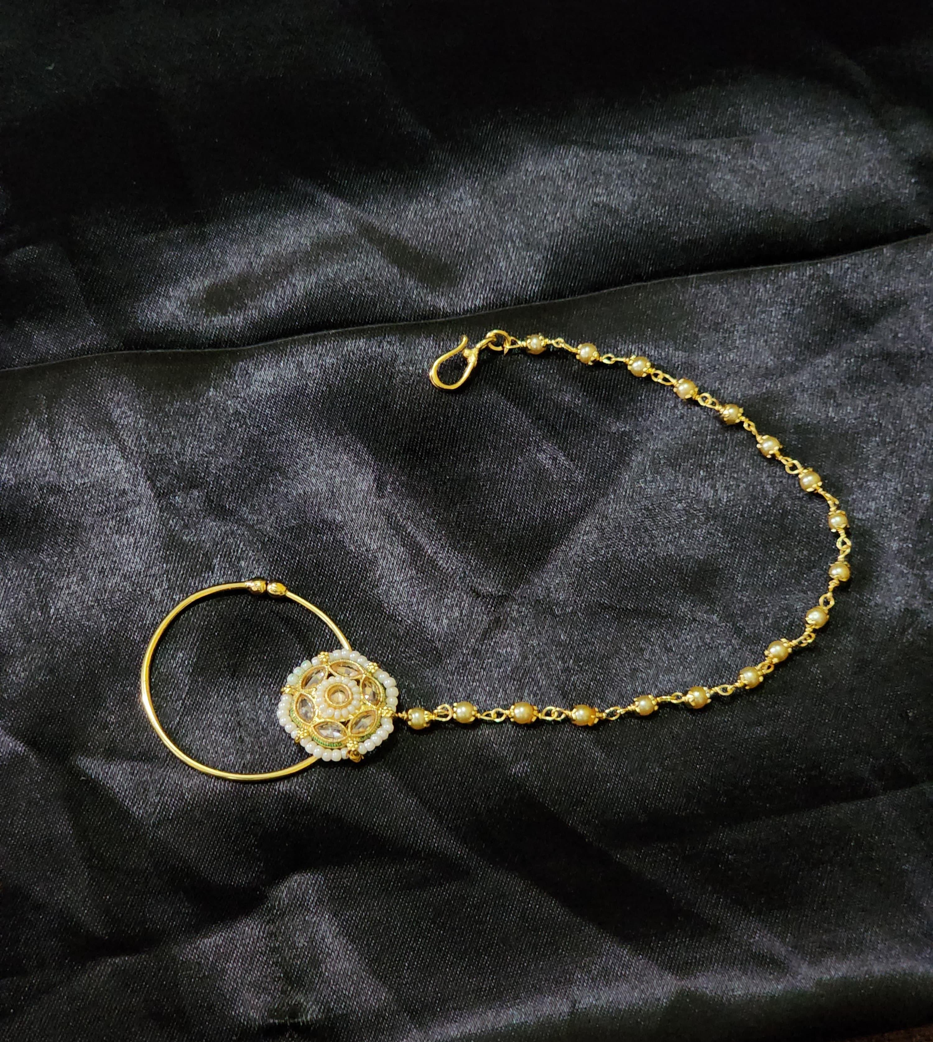 Attached is a rich gold beaded chain, designed with alternating golden beads for a traditional yet comfortable fit. Whether you're gracing a wedding mandap or celebrating a grand festive event, this nath effortlessly enhances your ethnic ensemble with elegance and grandeur.