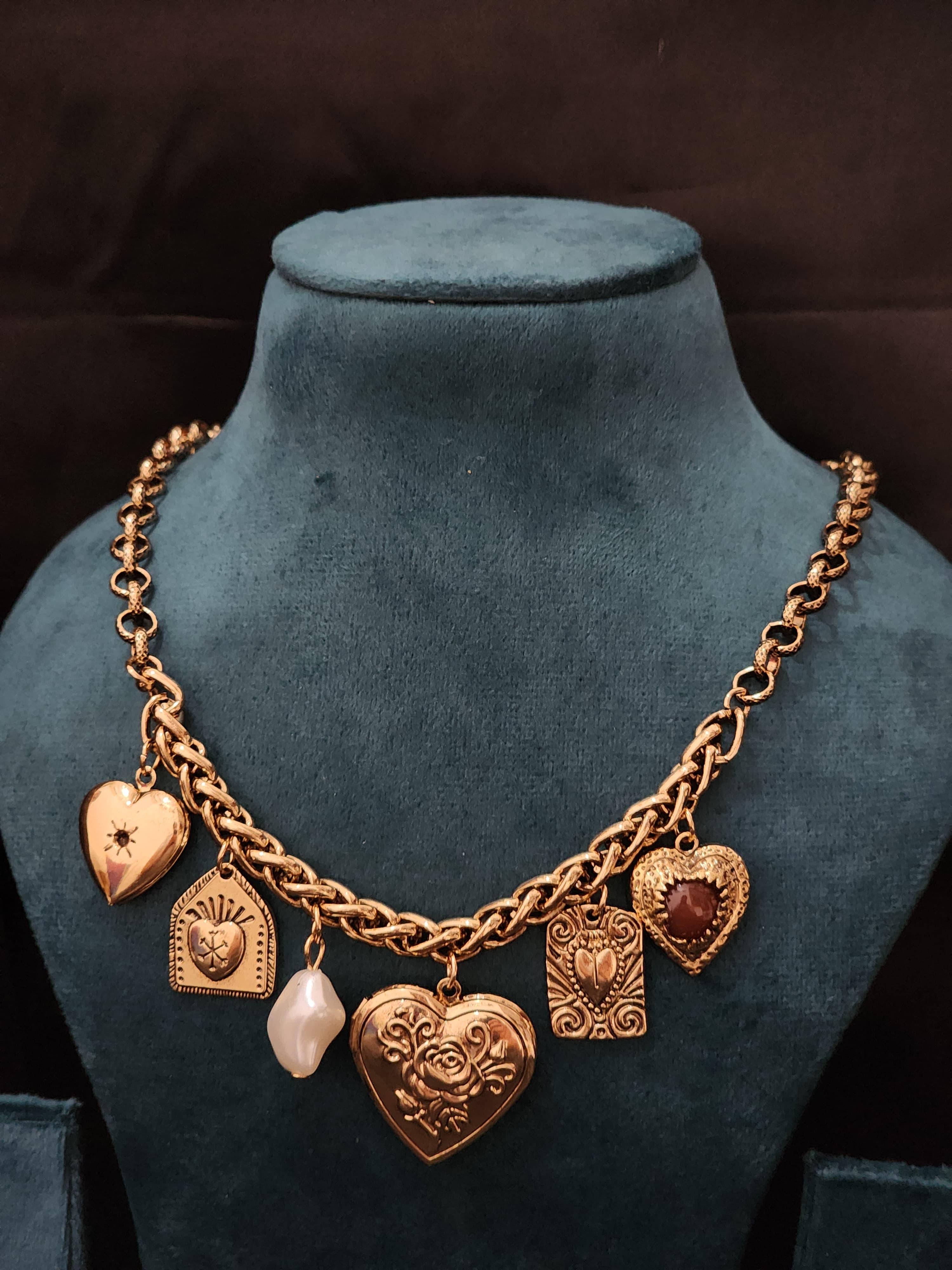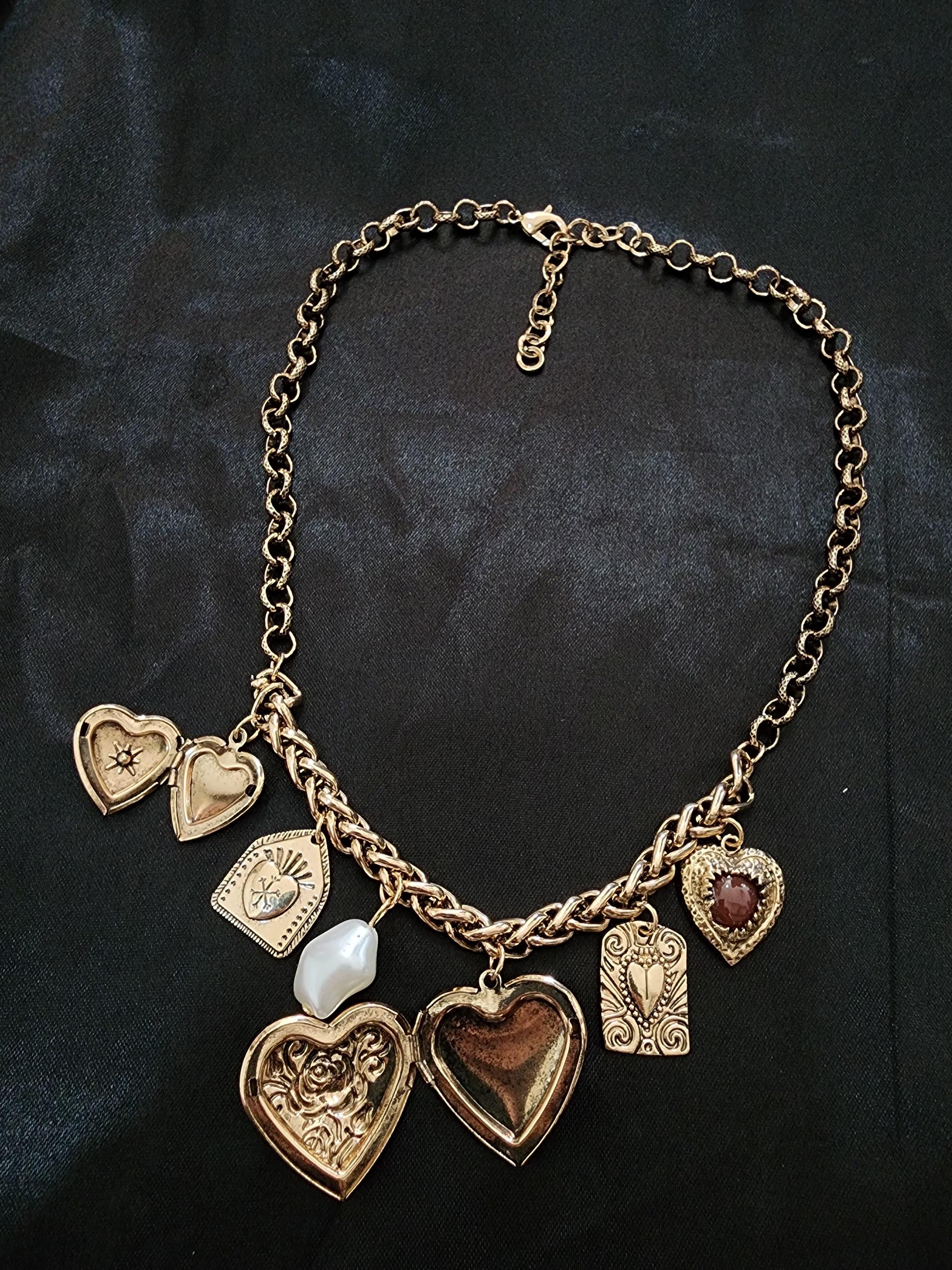 Each charm is thoughtfully designed: from intricately embossed hearts and sacred emblems to a romantic faux baroque pearl drop. The highlight is a large dual-opening heart locket, beautifully engraved with vintage florals — perfect for preserving cherished memories.
